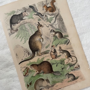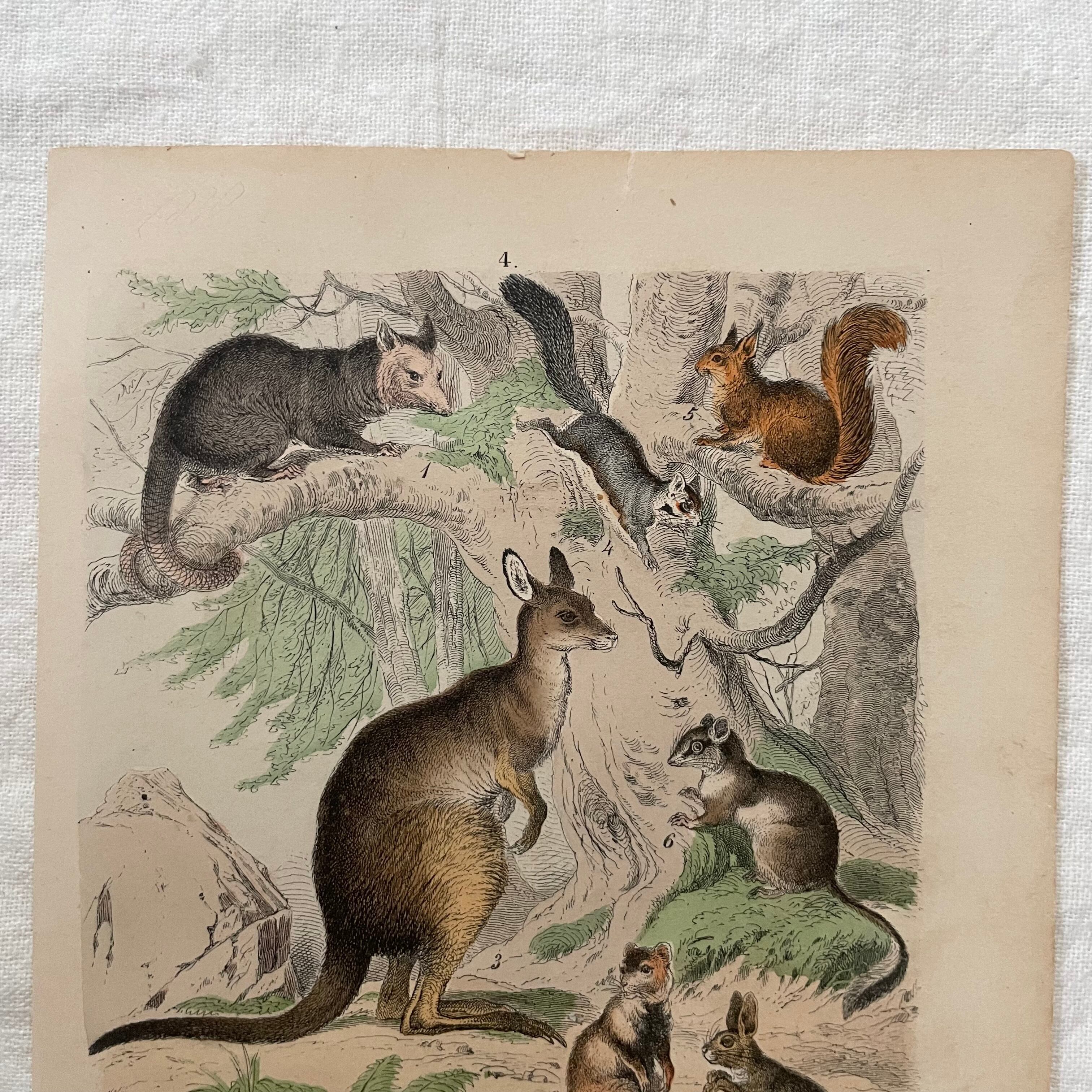 味のある雰囲気の紙に木のある風景と10匹の動物たちが表現されています。