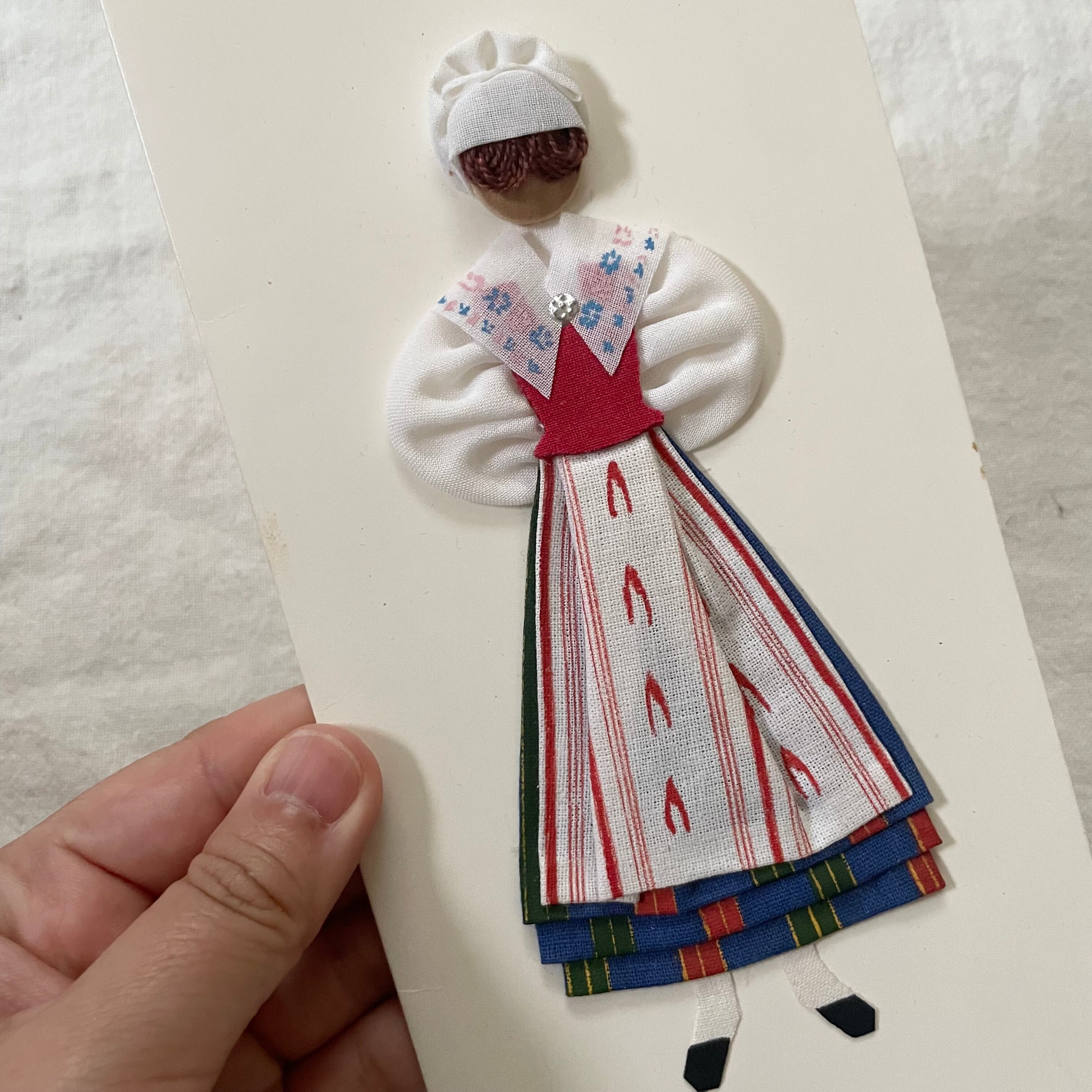 布と糸で作られたカードはvarmlandという州の民族衣装が表現されています。