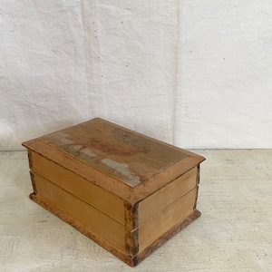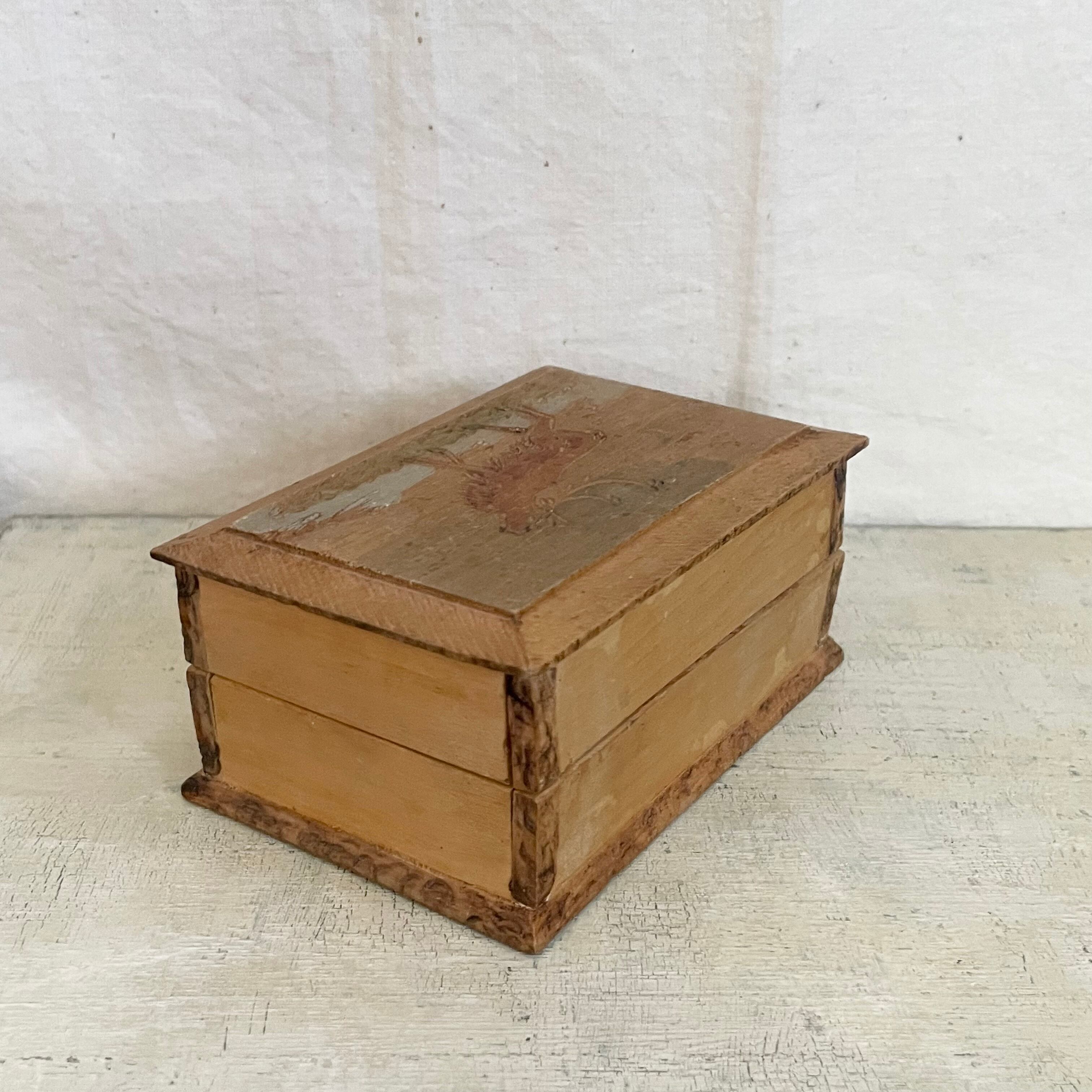 木の箱は蓋の部分に鹿?トナカイ?うっすらとした淡い色味と浅めの彫りで表現されています。