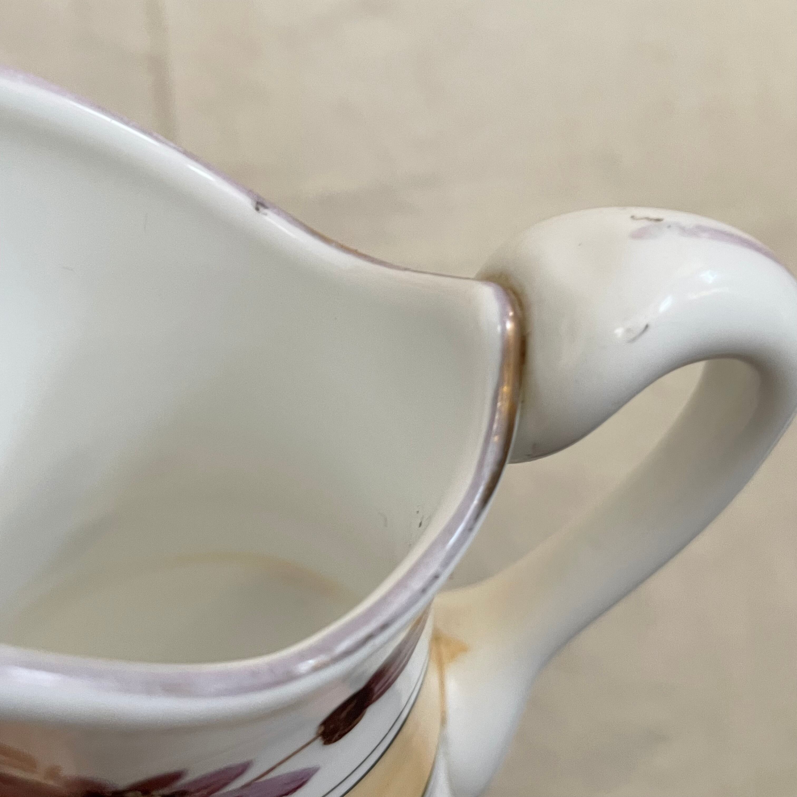 白地に紫色の花模様が美しいピッチャーは、優雅な雰囲気です。