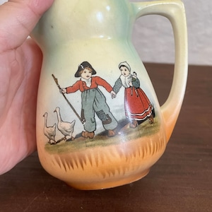 淡い黄色と緑と茶色地のピッチャーは、少しシュールだけど可愛らしい子供たちとアヒルたちが描かれています。