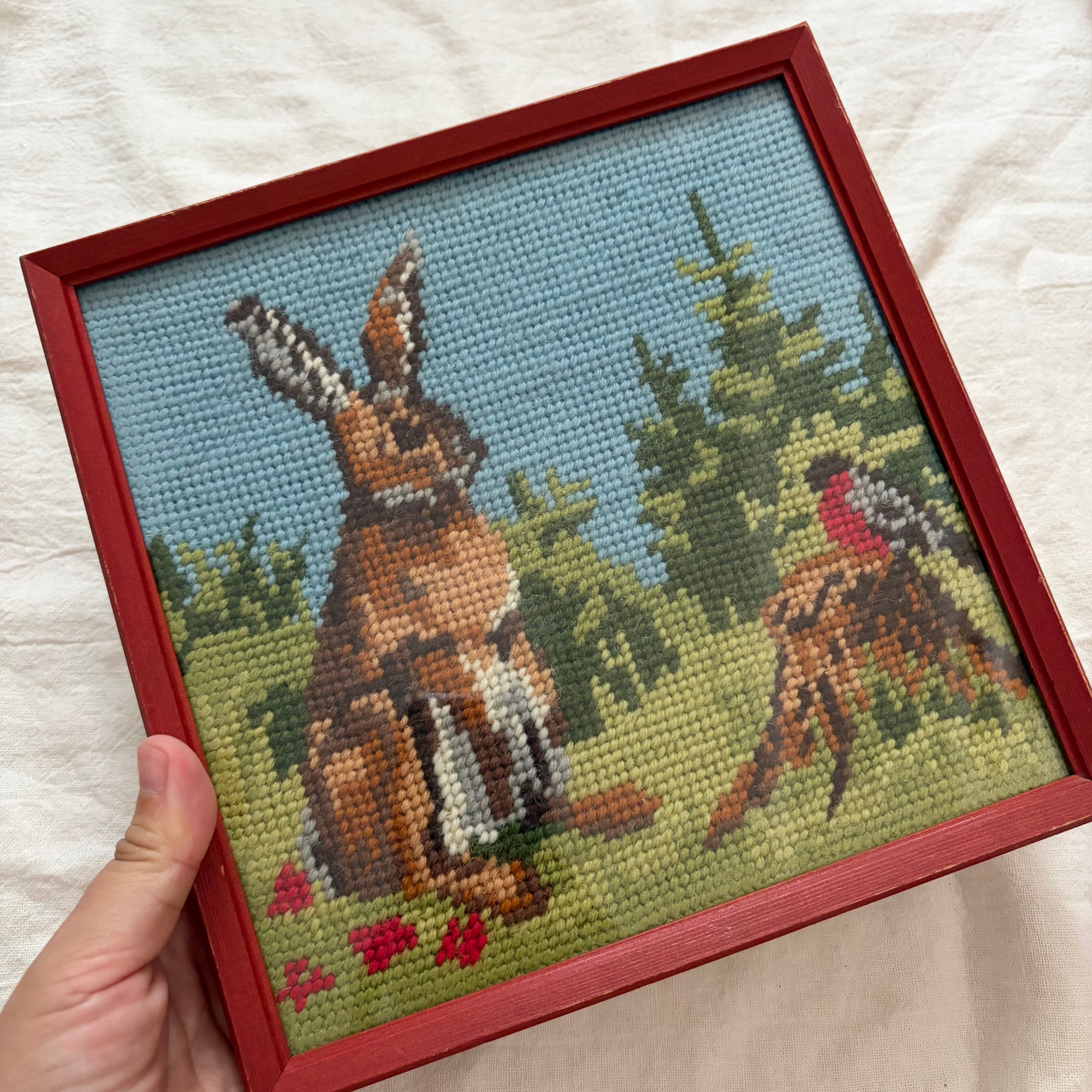 うさぎと切り株の上に佇んだ鳥が向かい合っています。