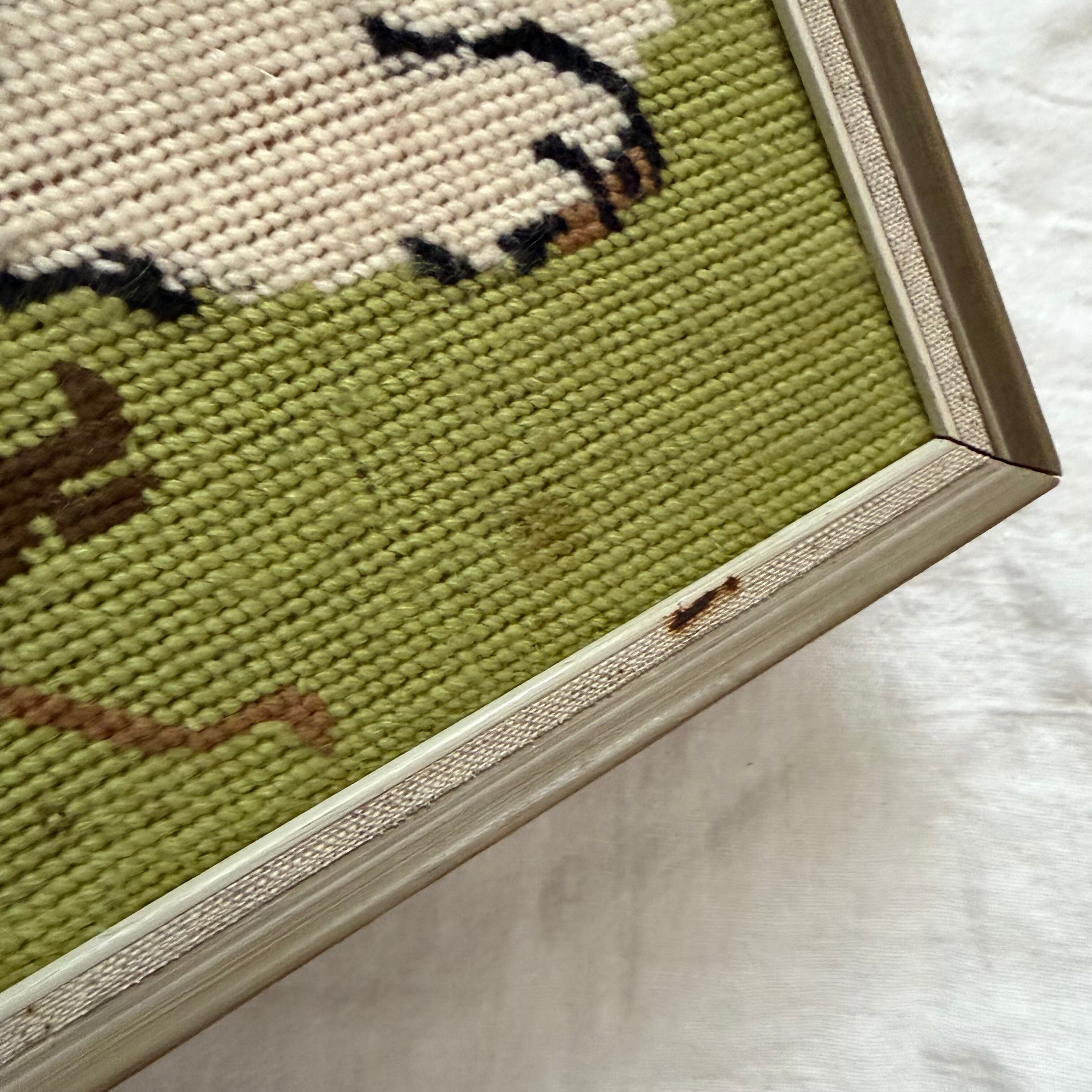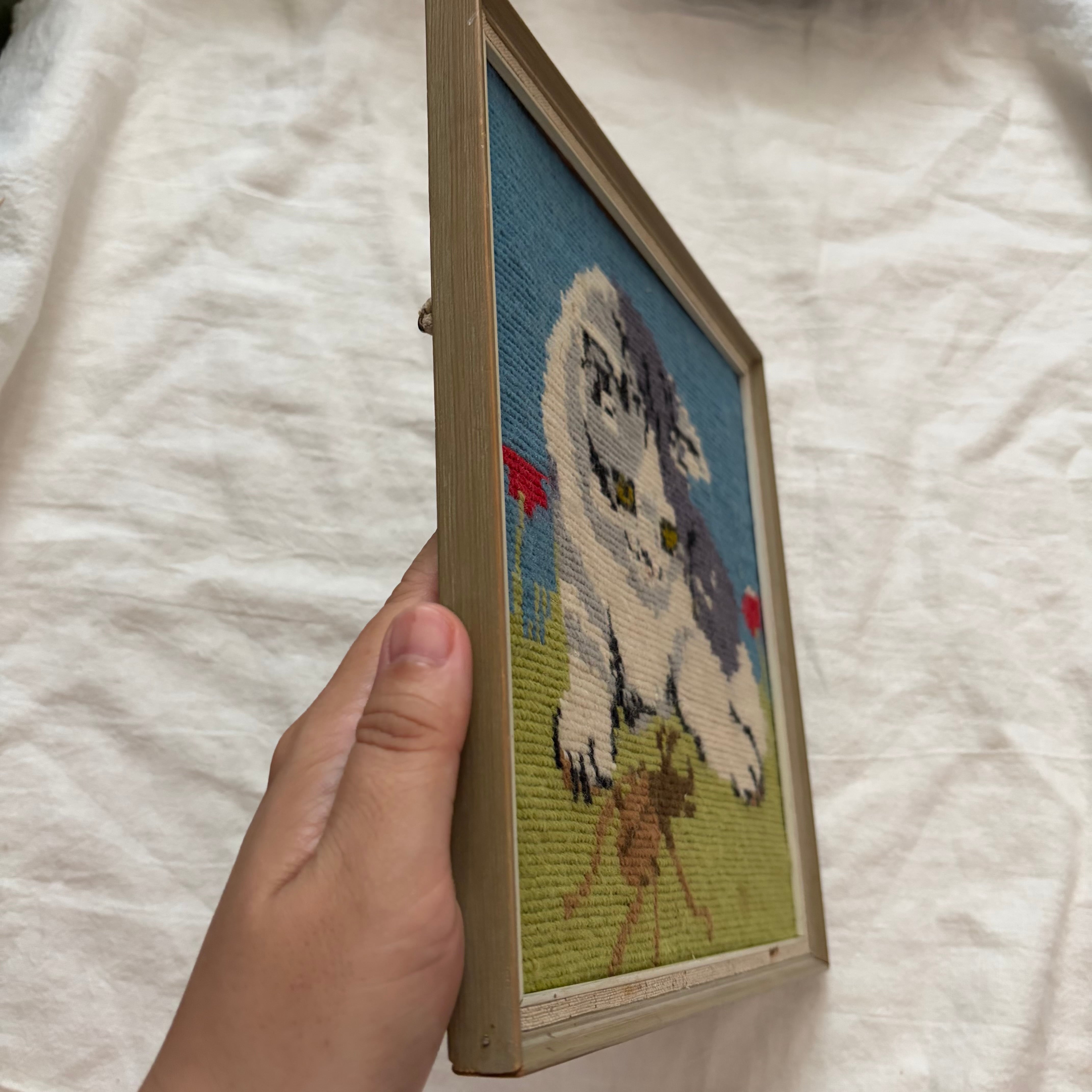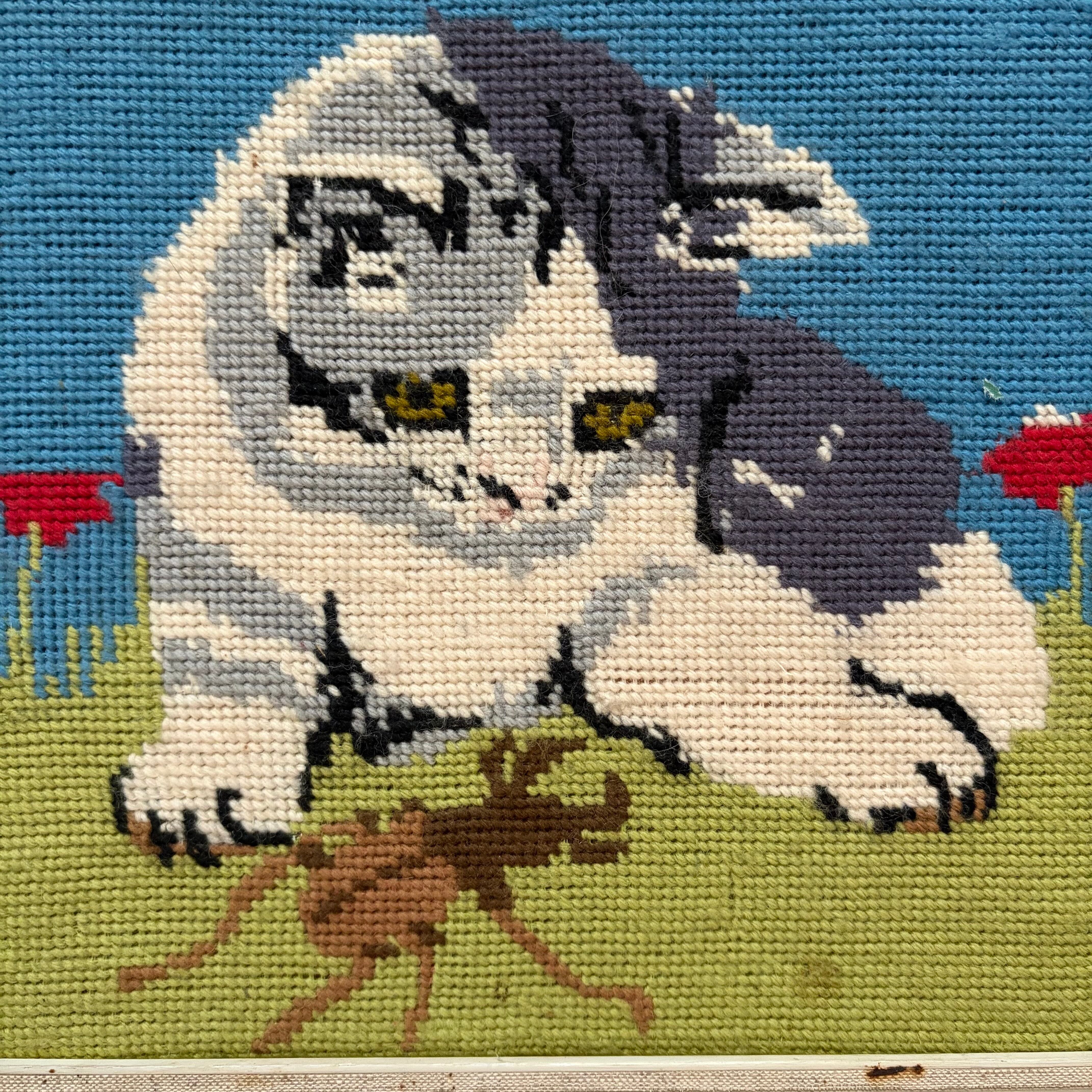 刺繍絵と言っていいのかはわかりませんが、毛糸のようなもので表現された絵は、ネコがクワガタを眺めているという、少しシュールなシーンが表現されています。