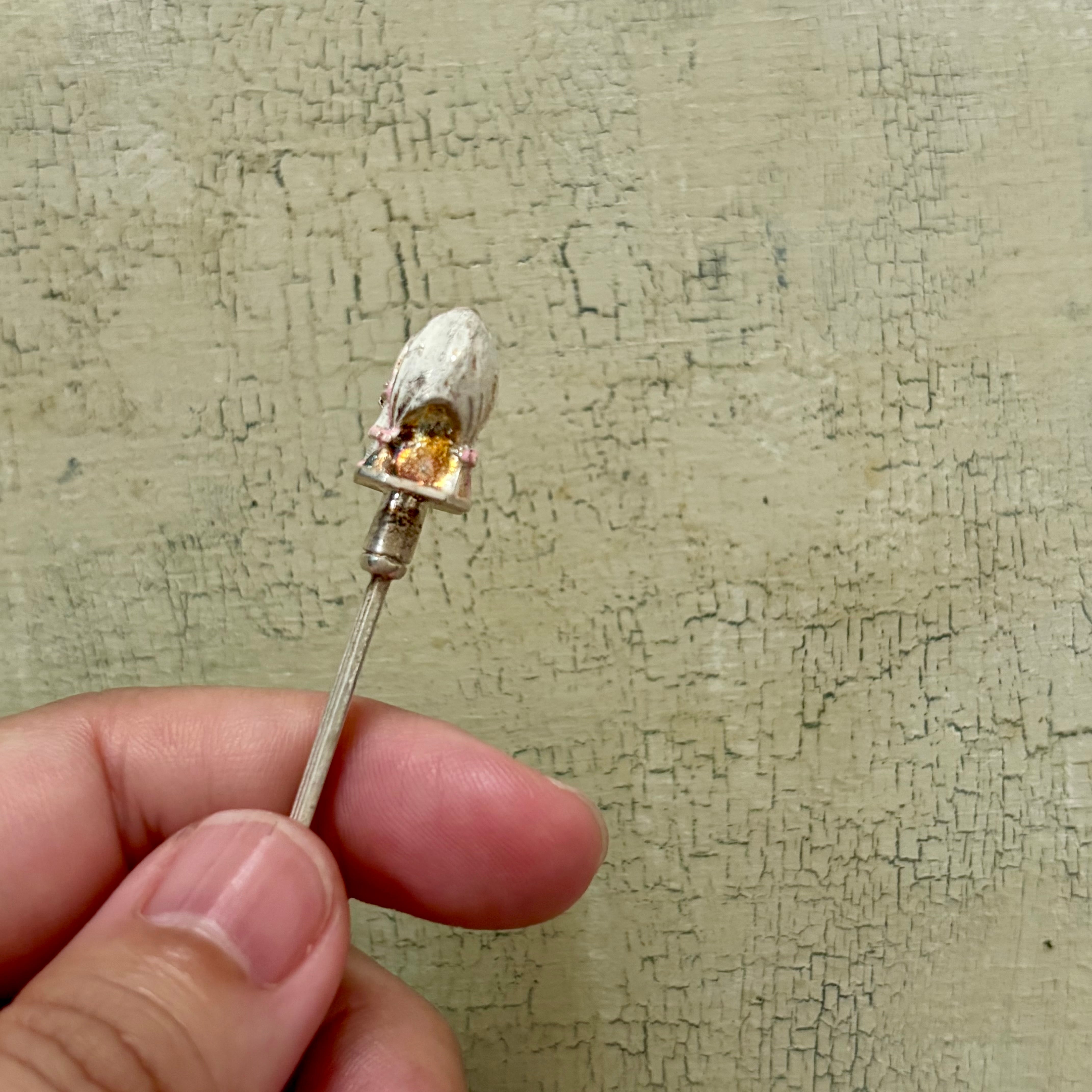 少し剥げてはいますが、白とピンクの可愛らしい赤ちゃん用のベッドが立体的に表現されています。