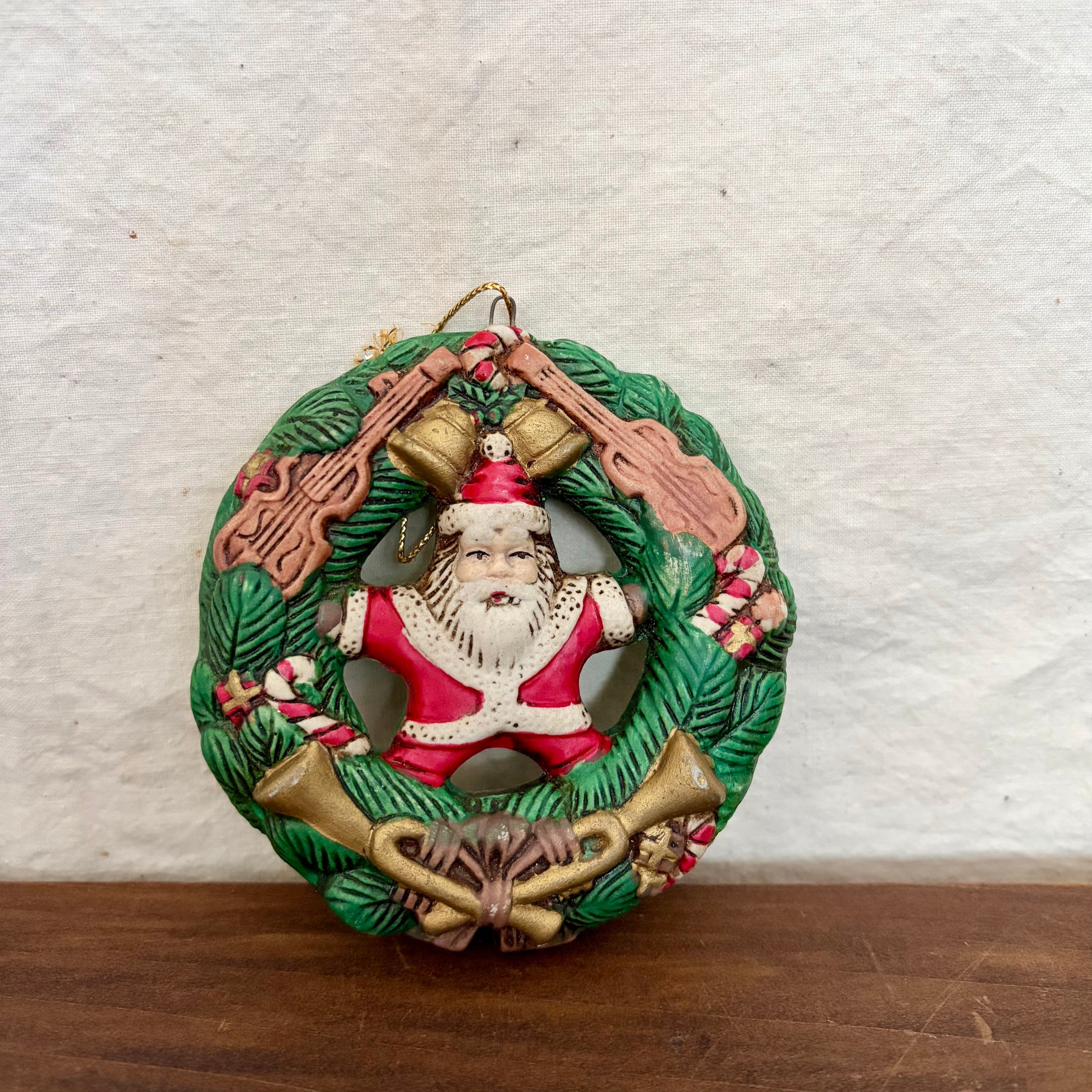 リース型のオーナメントの真ん中にはサンタ、リースには楽器やプレゼントなど、華やかで可愛らしいです。