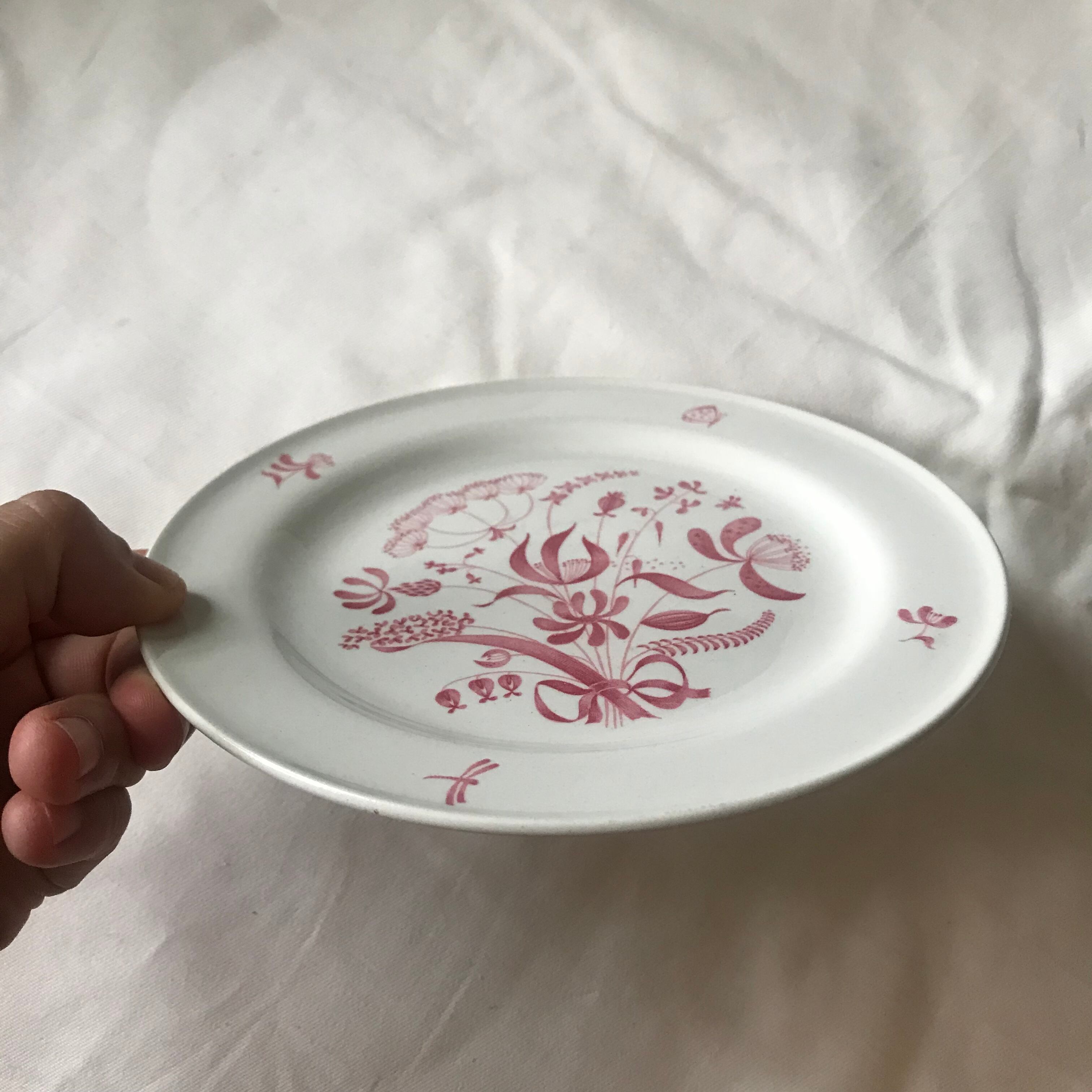 プレートに大きく濃いピンク色の花束が描かれていて、縁には小さな花や蝶などが描かれています。