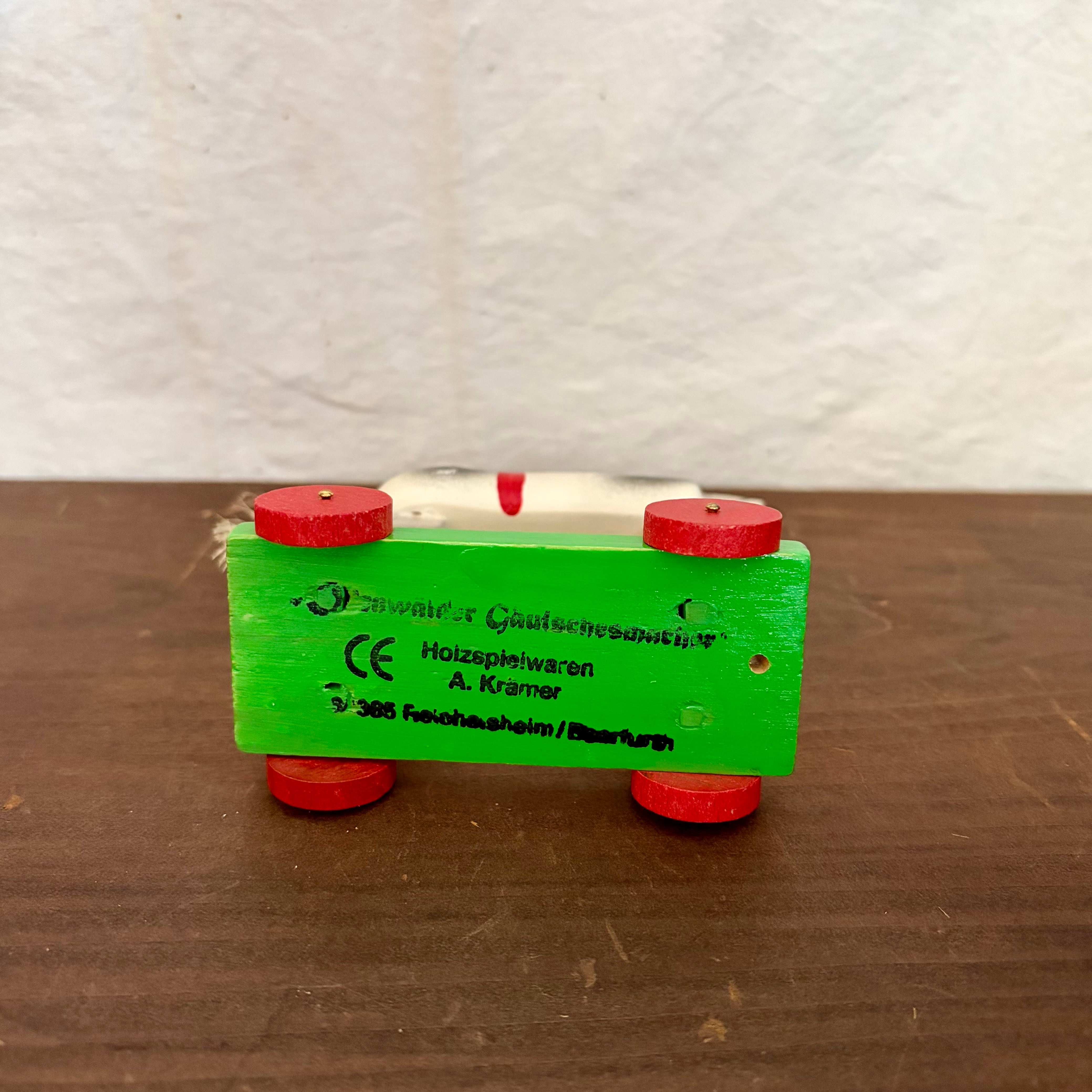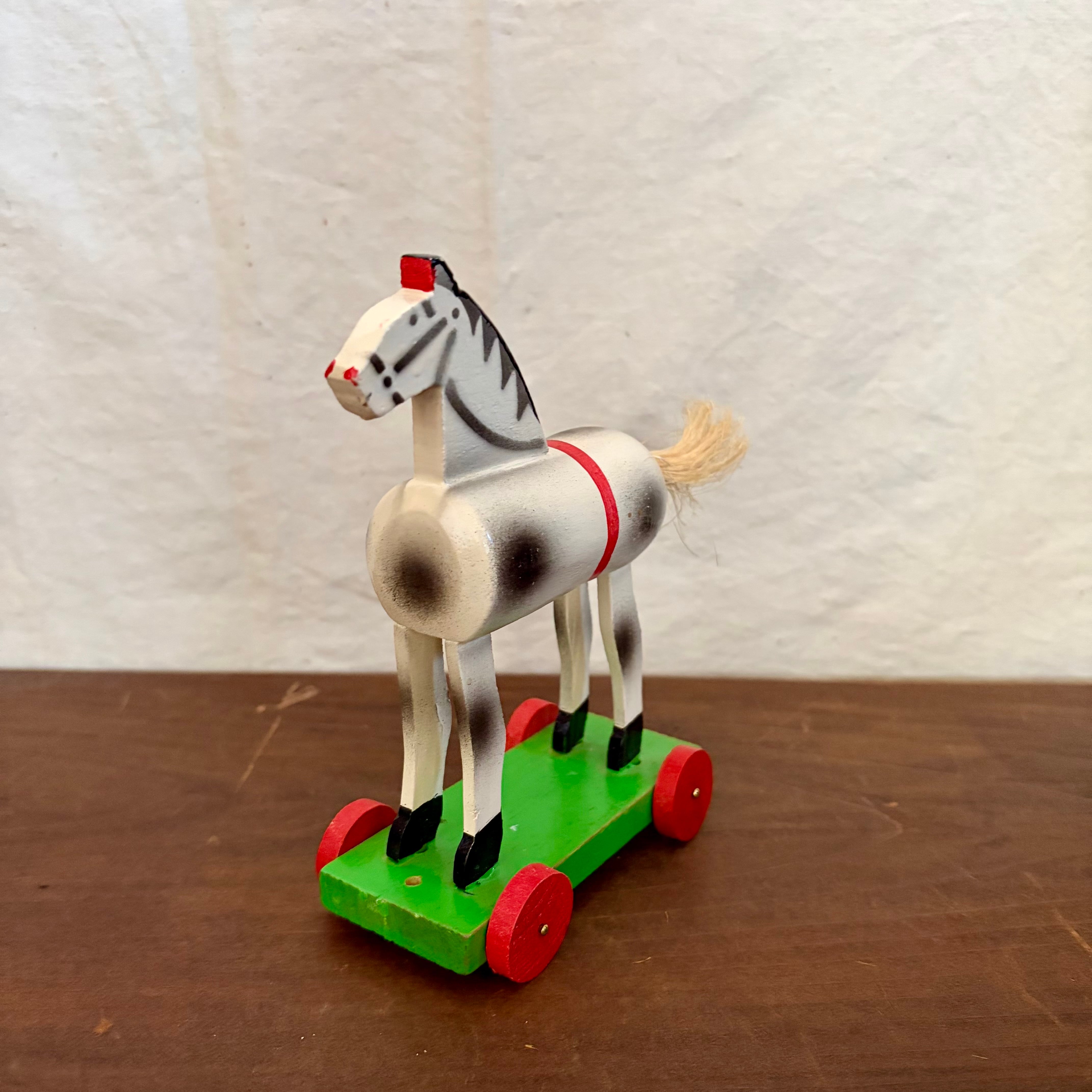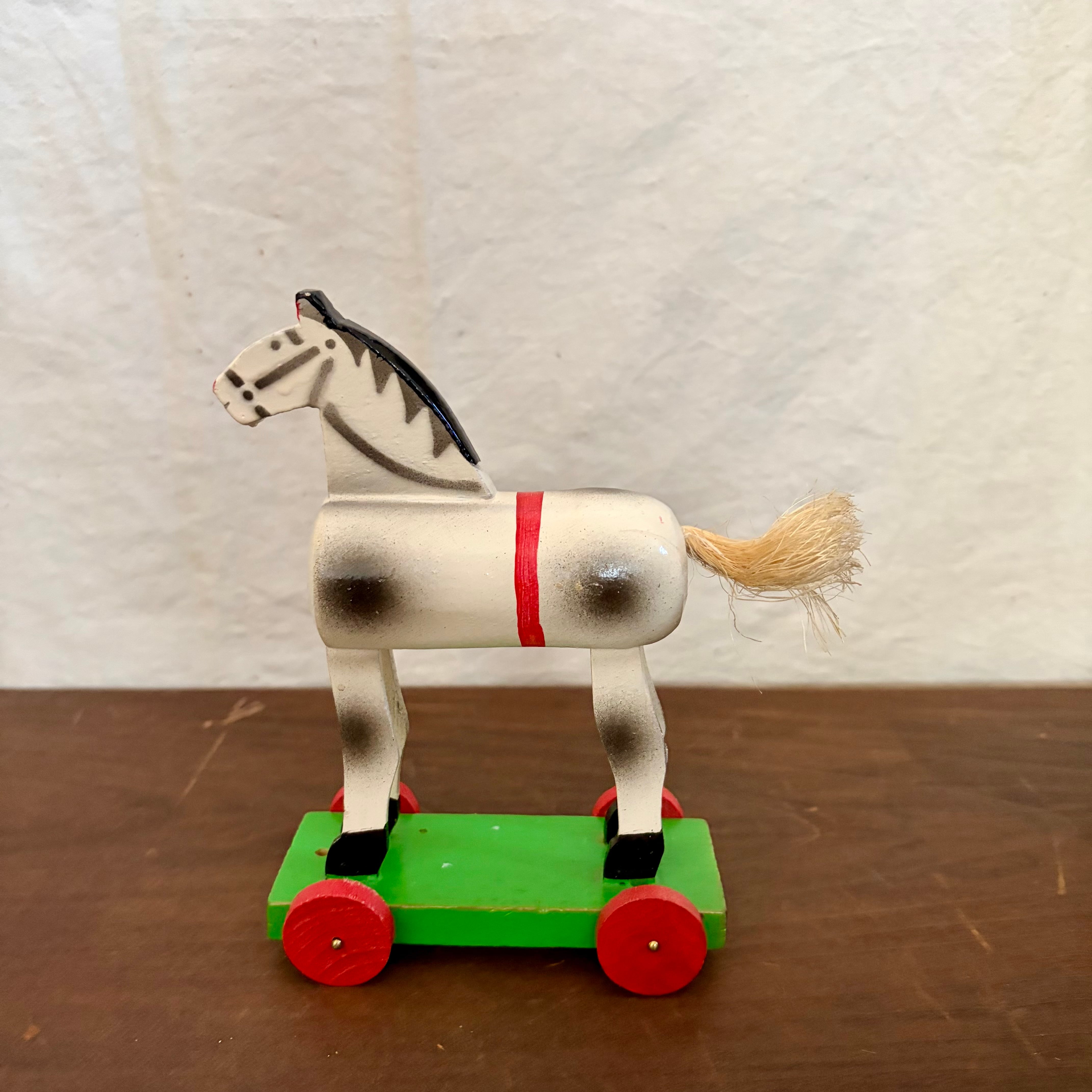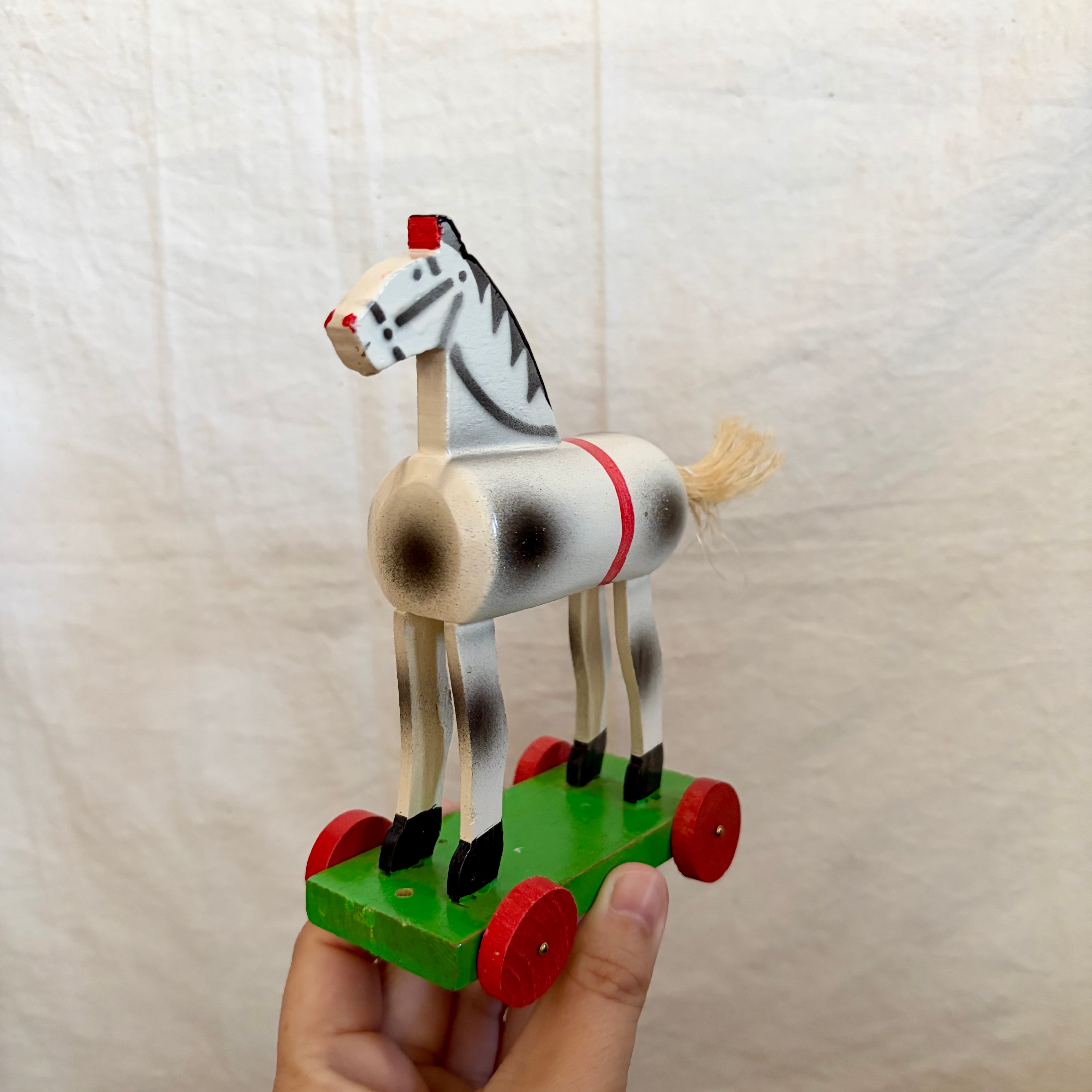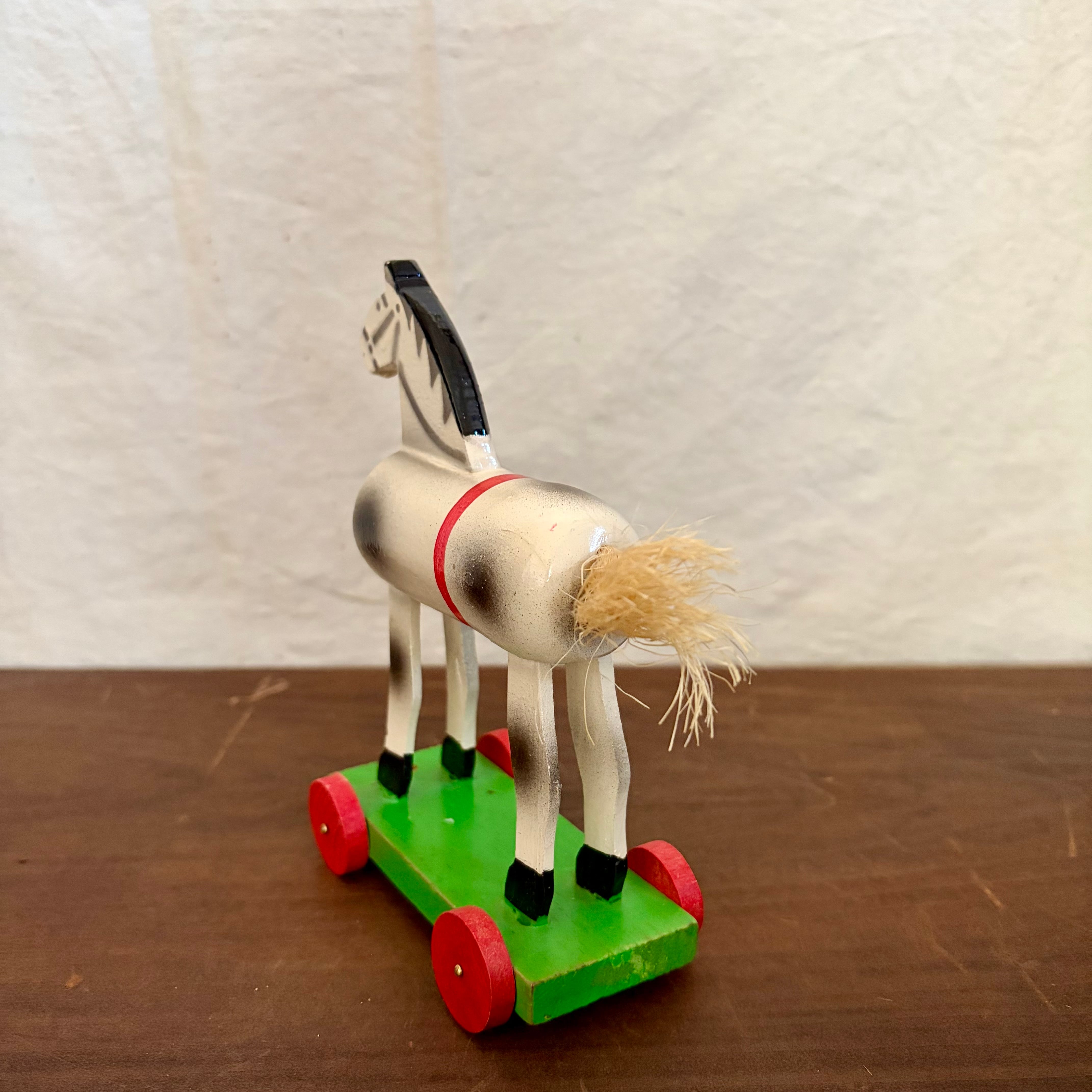 赤いタイヤのついた緑の台車(タイヤはちゃんと回ります)に乗った白馬は、何とも言えない表情としっぽのふさふさが特徴です。