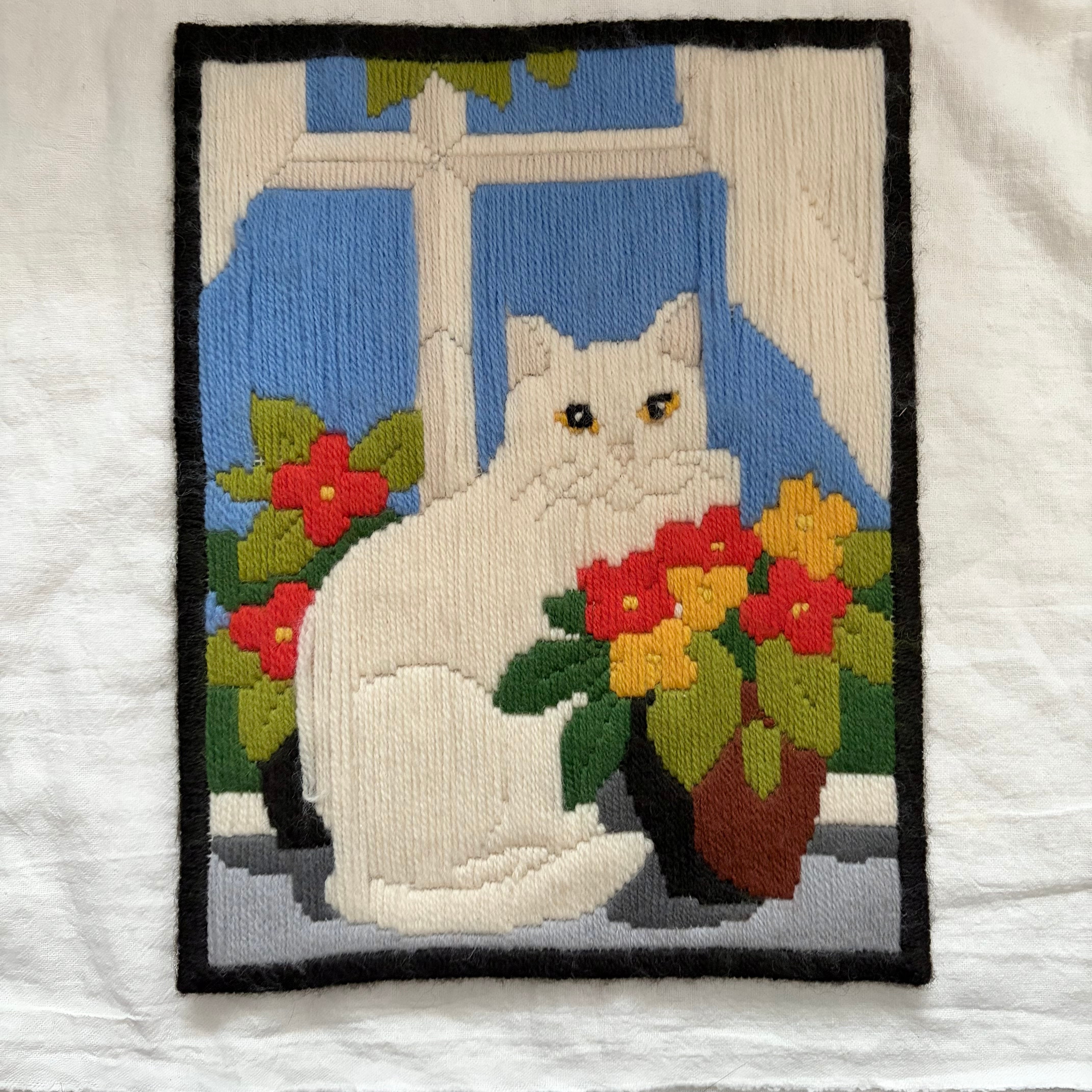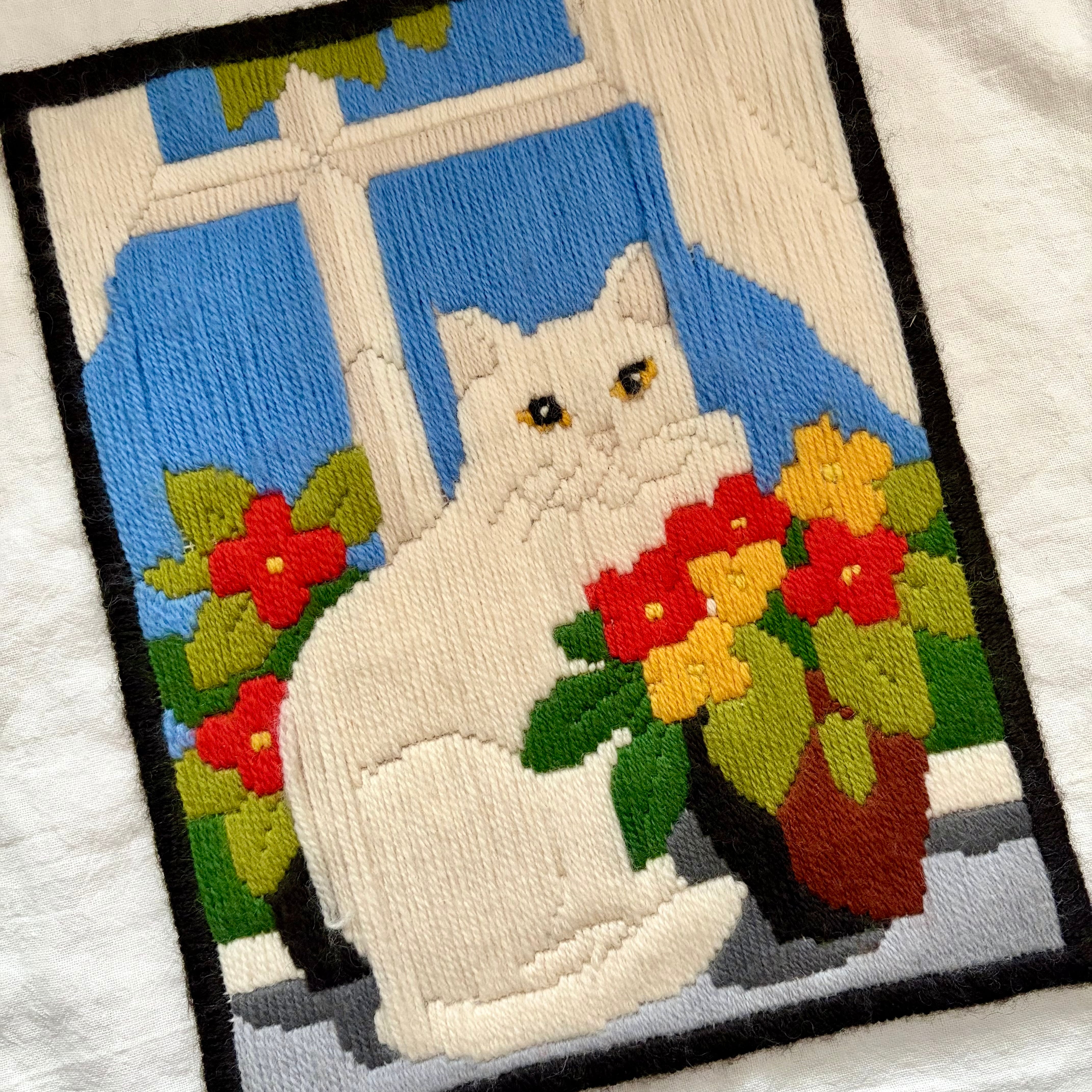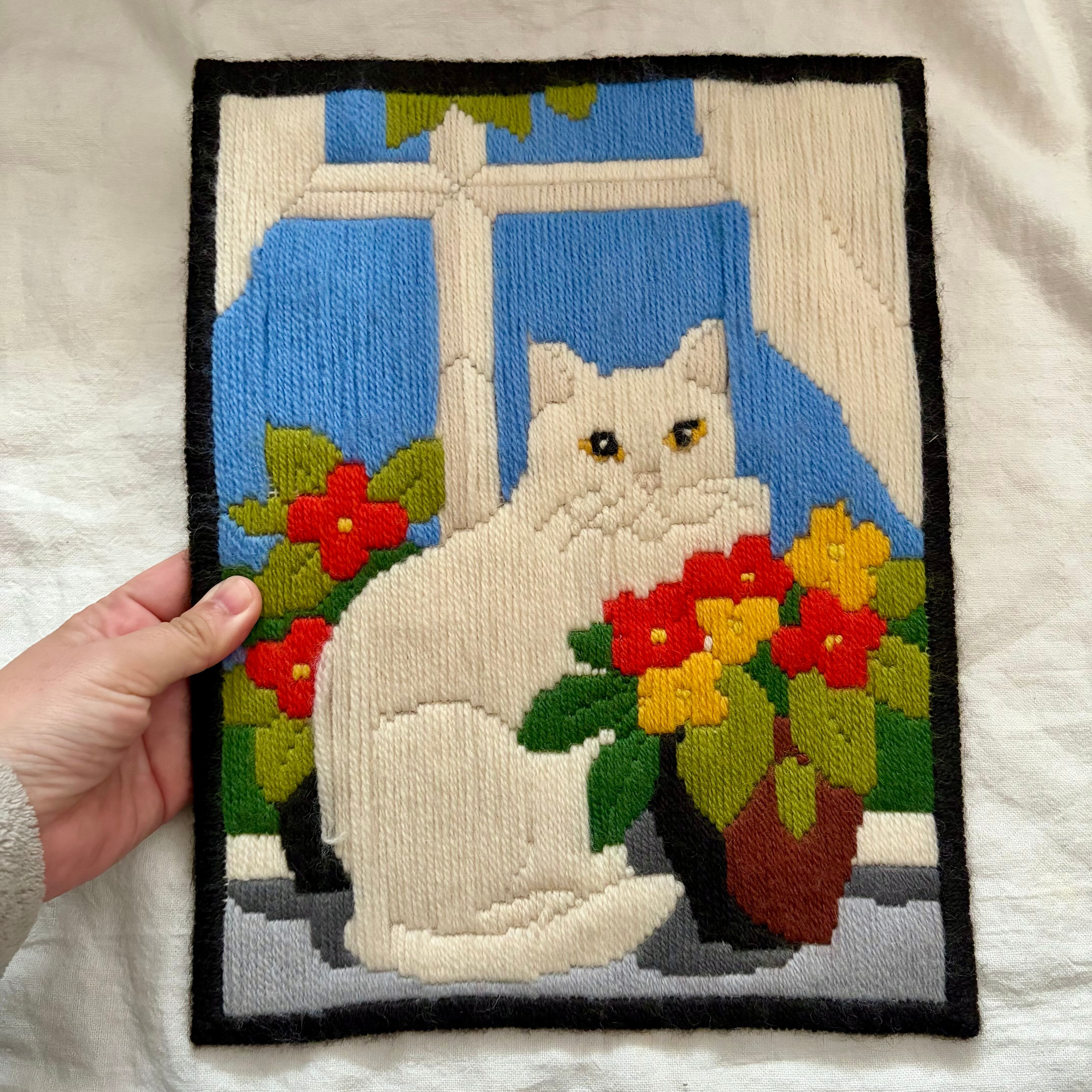 窓辺に佇むネコと花たちが毛糸の刺繍?で表現されています。