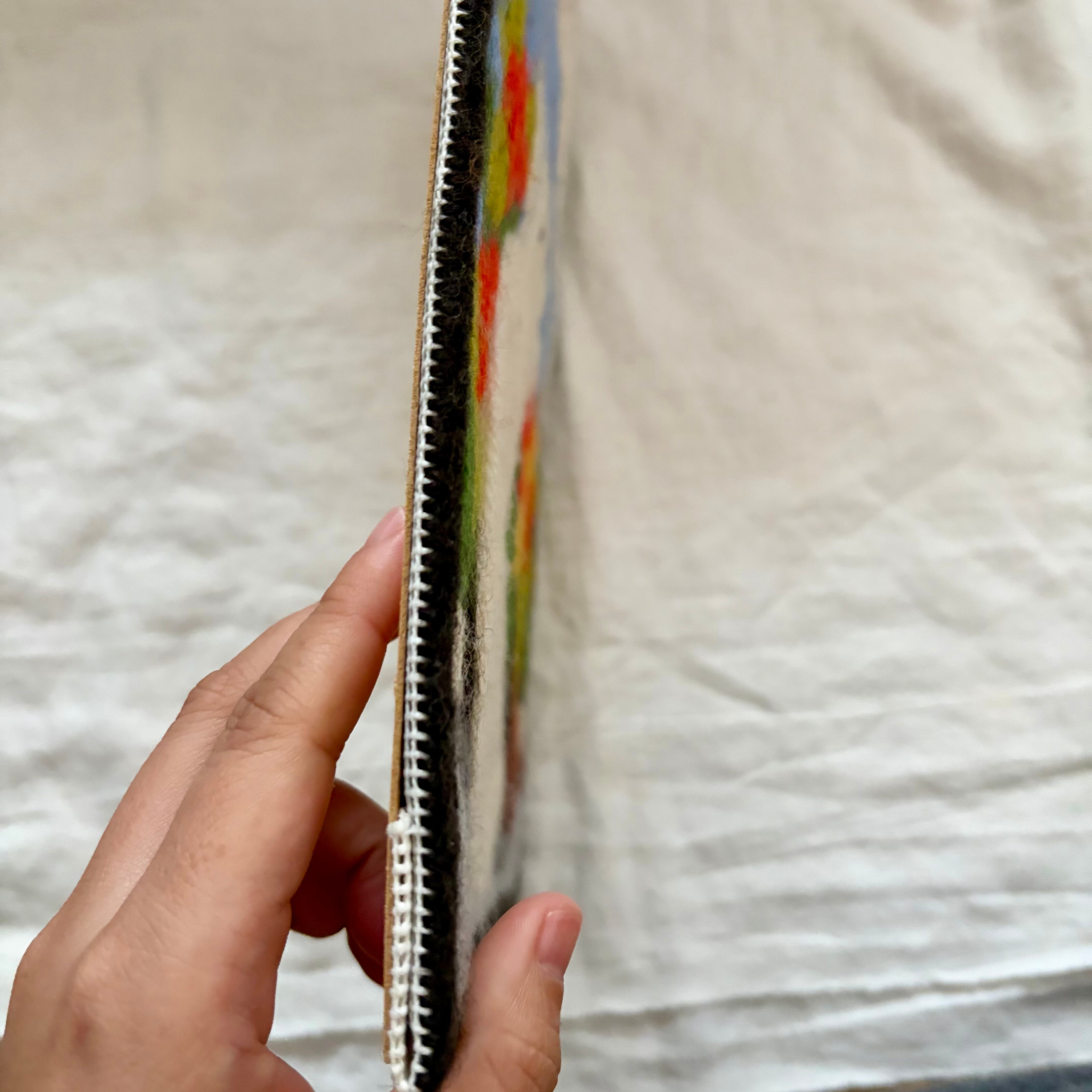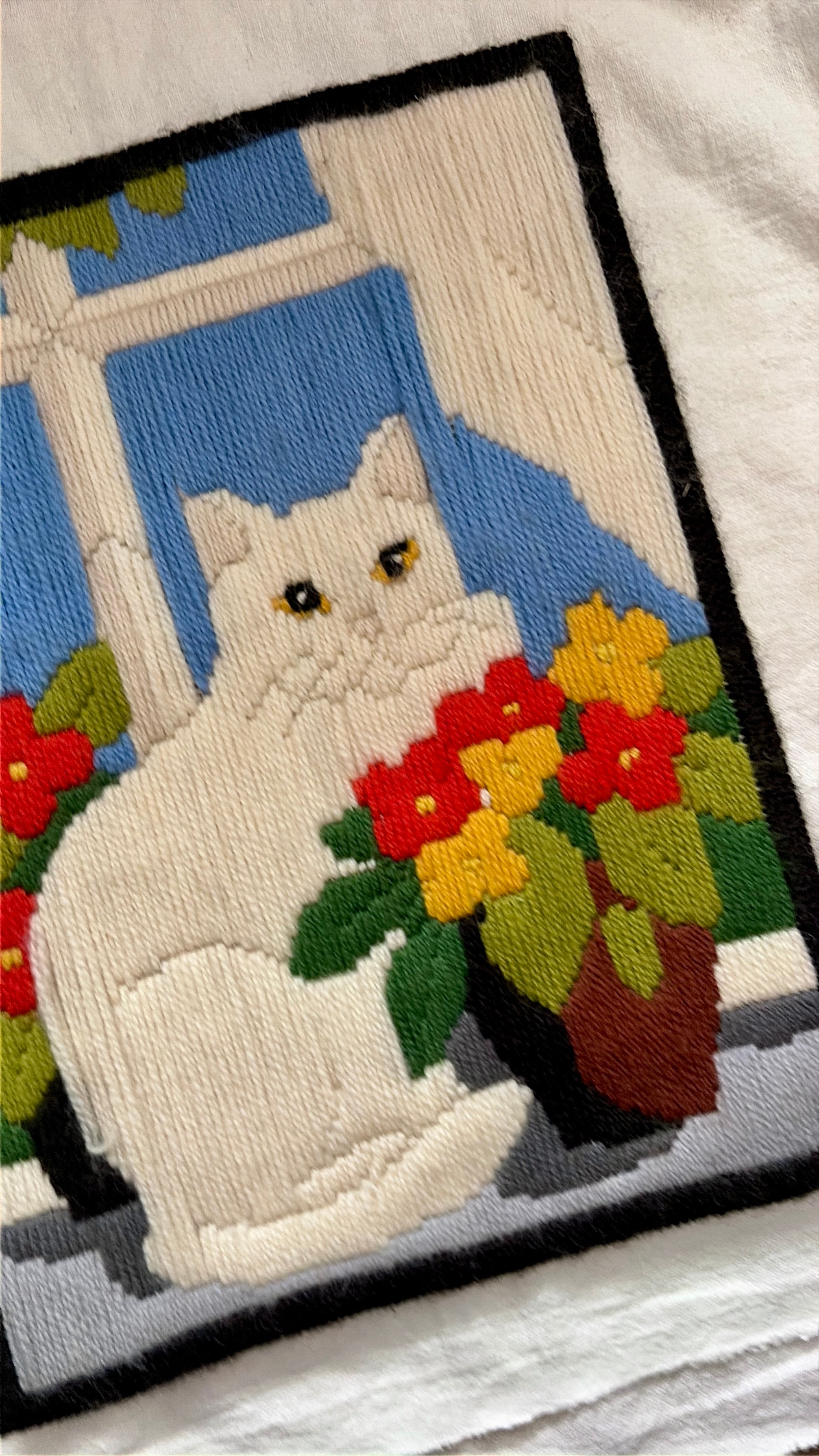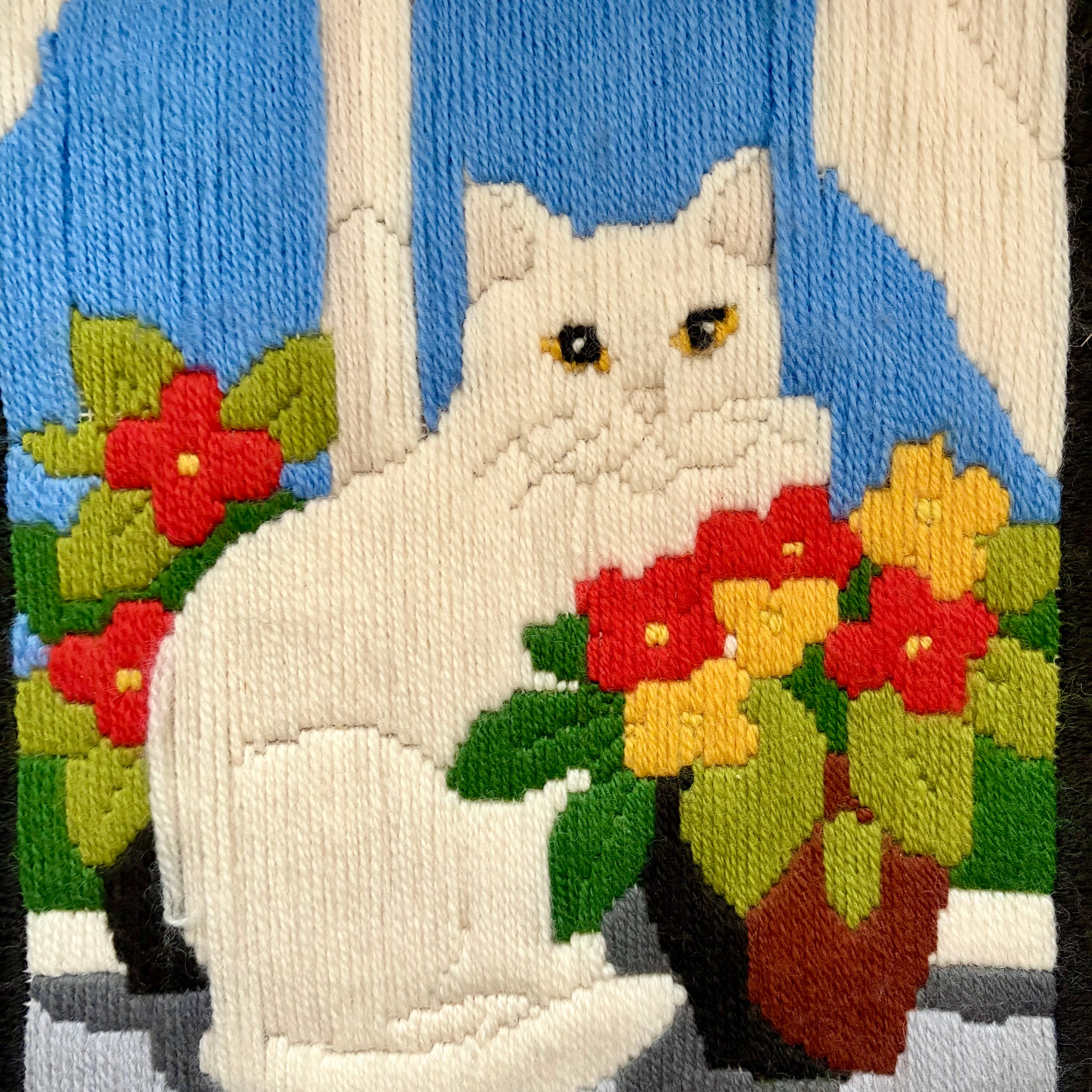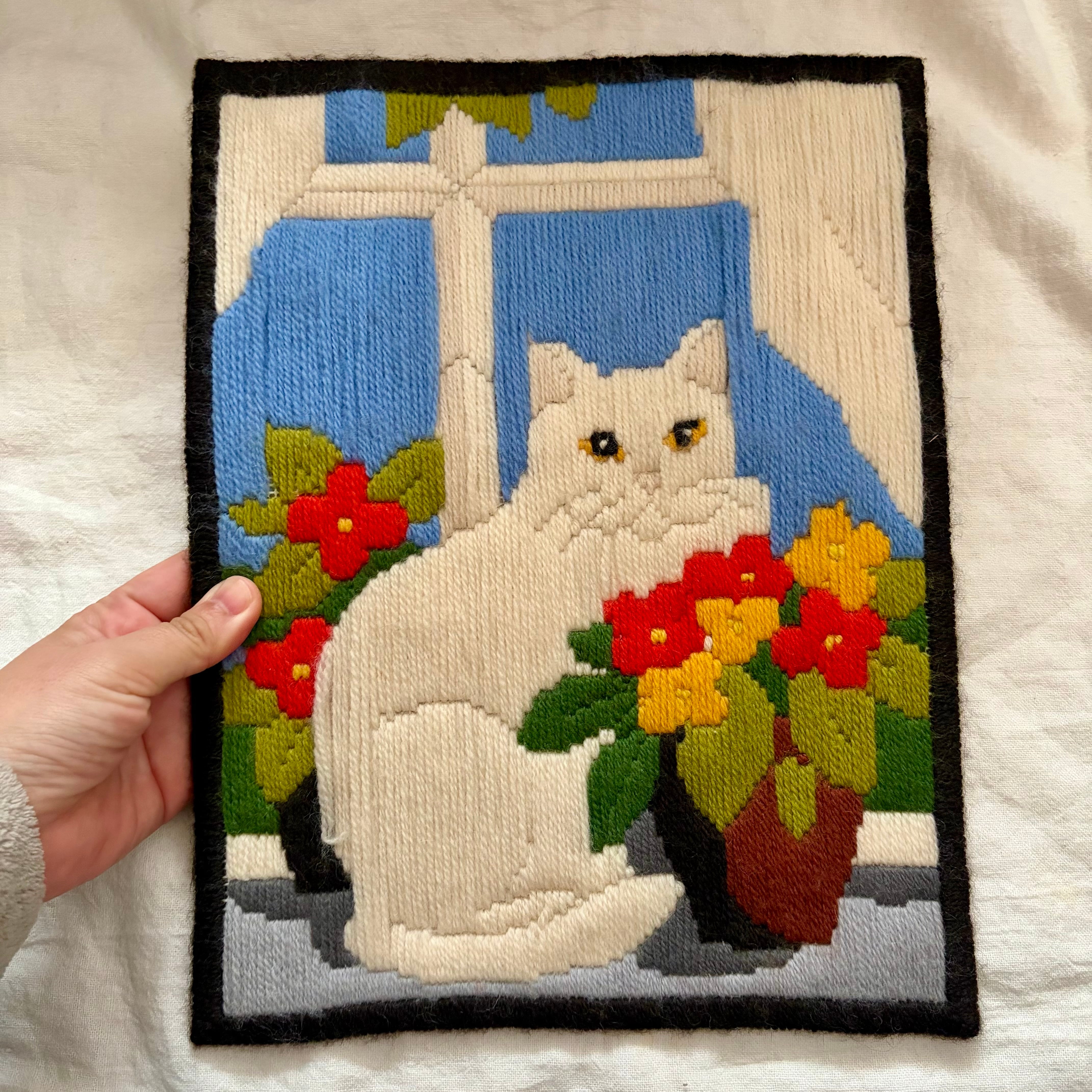 窓辺に佇むネコと花たちが毛糸の刺繍?で表現されています。