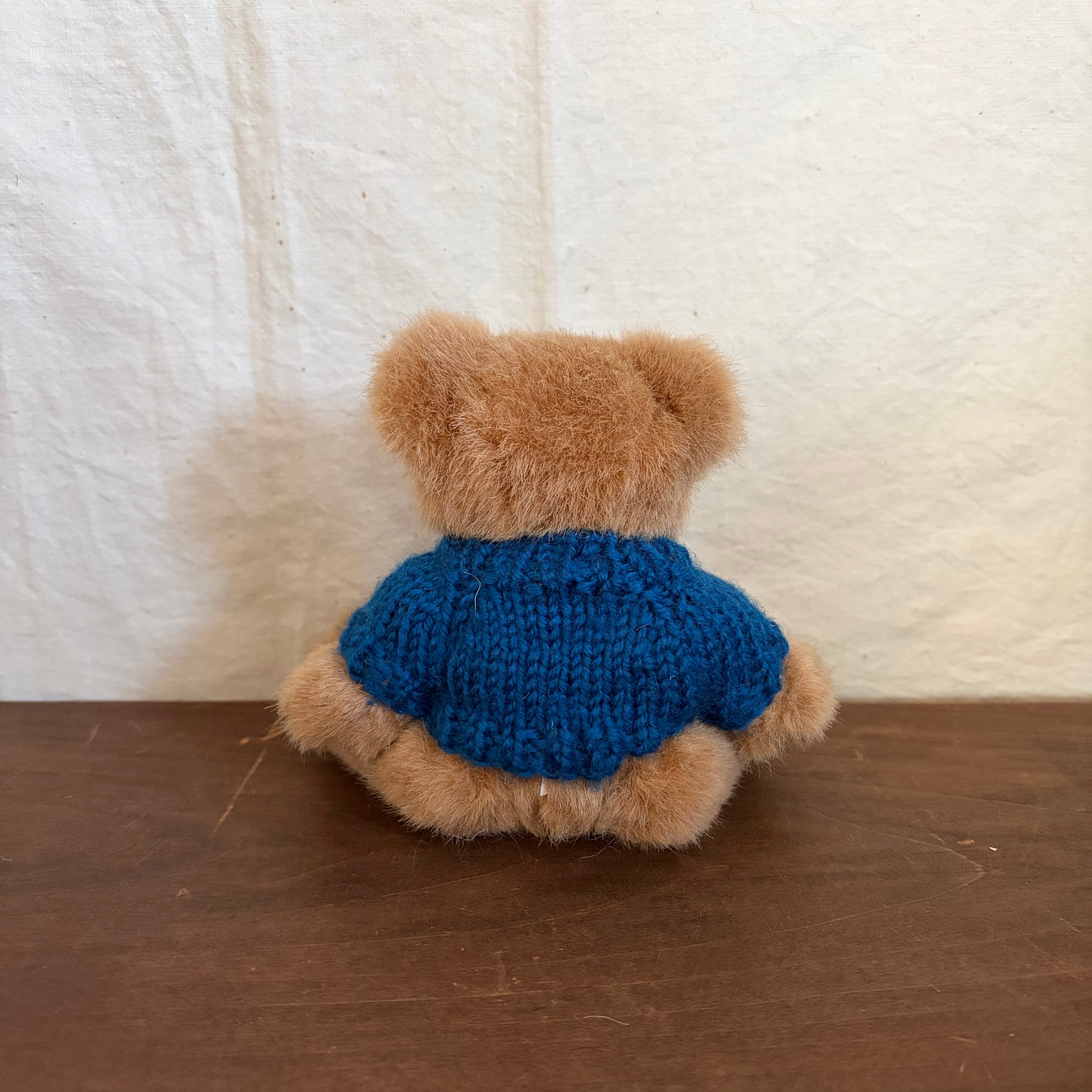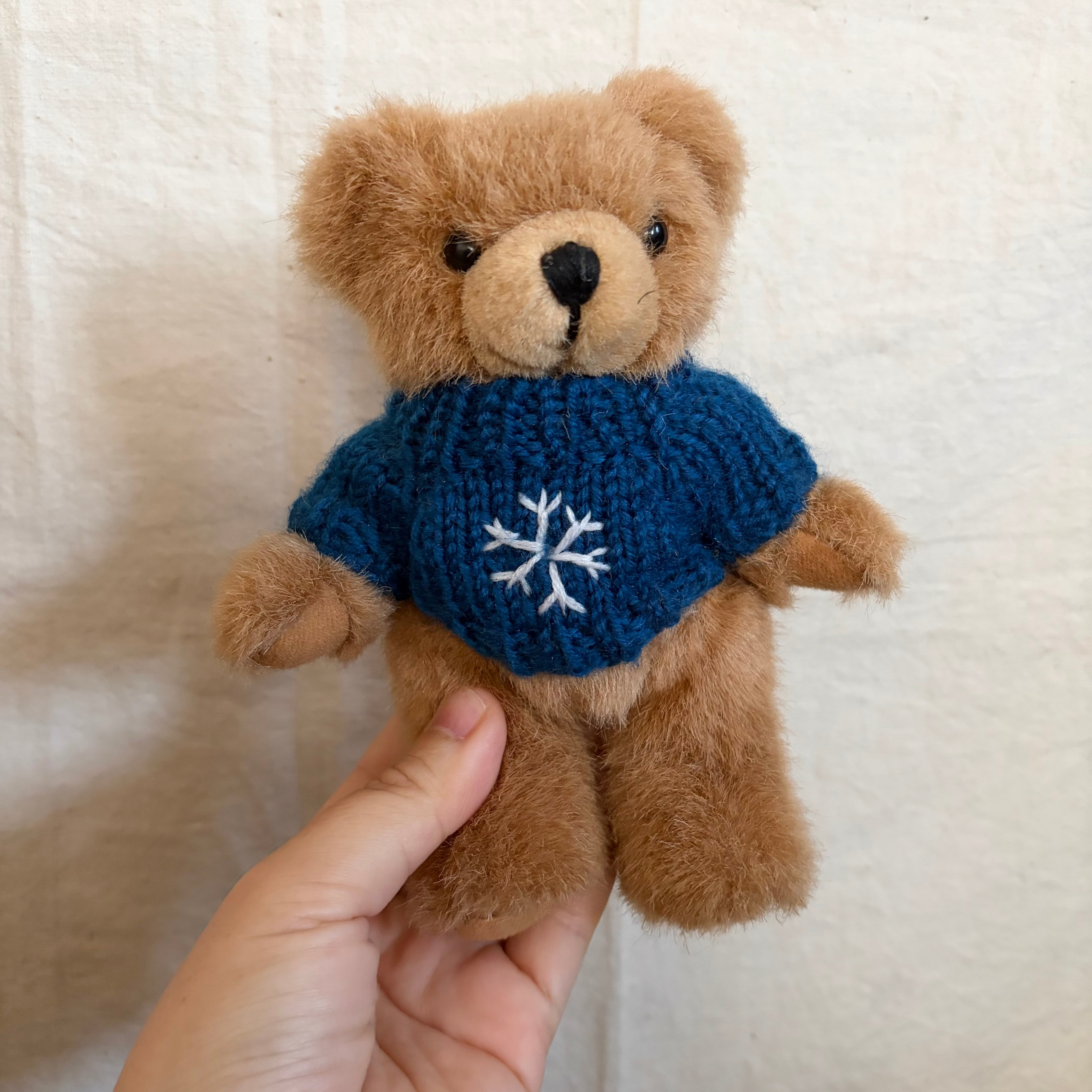 ピッタリサイズの青いセーターをまとったおしゃれなくまです。