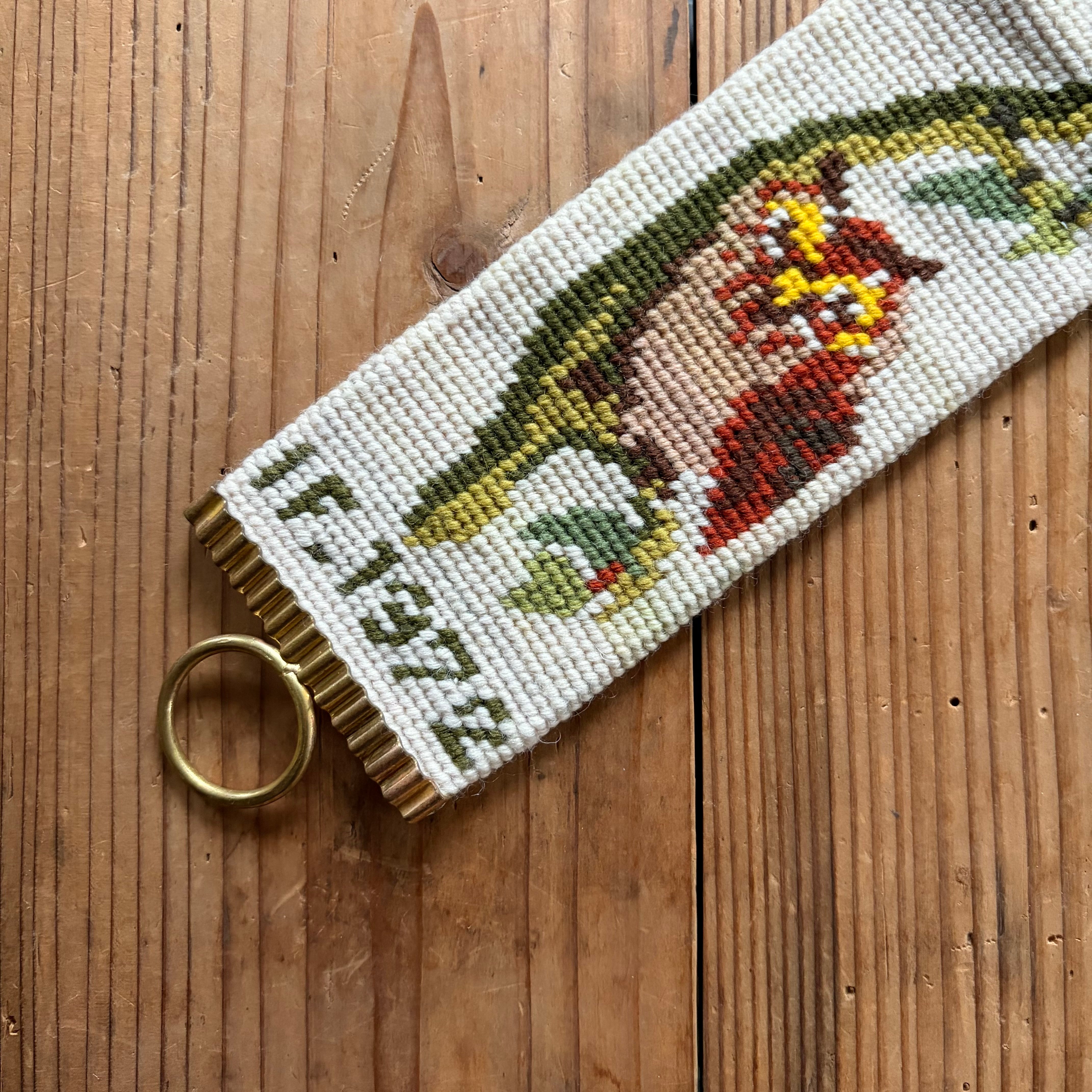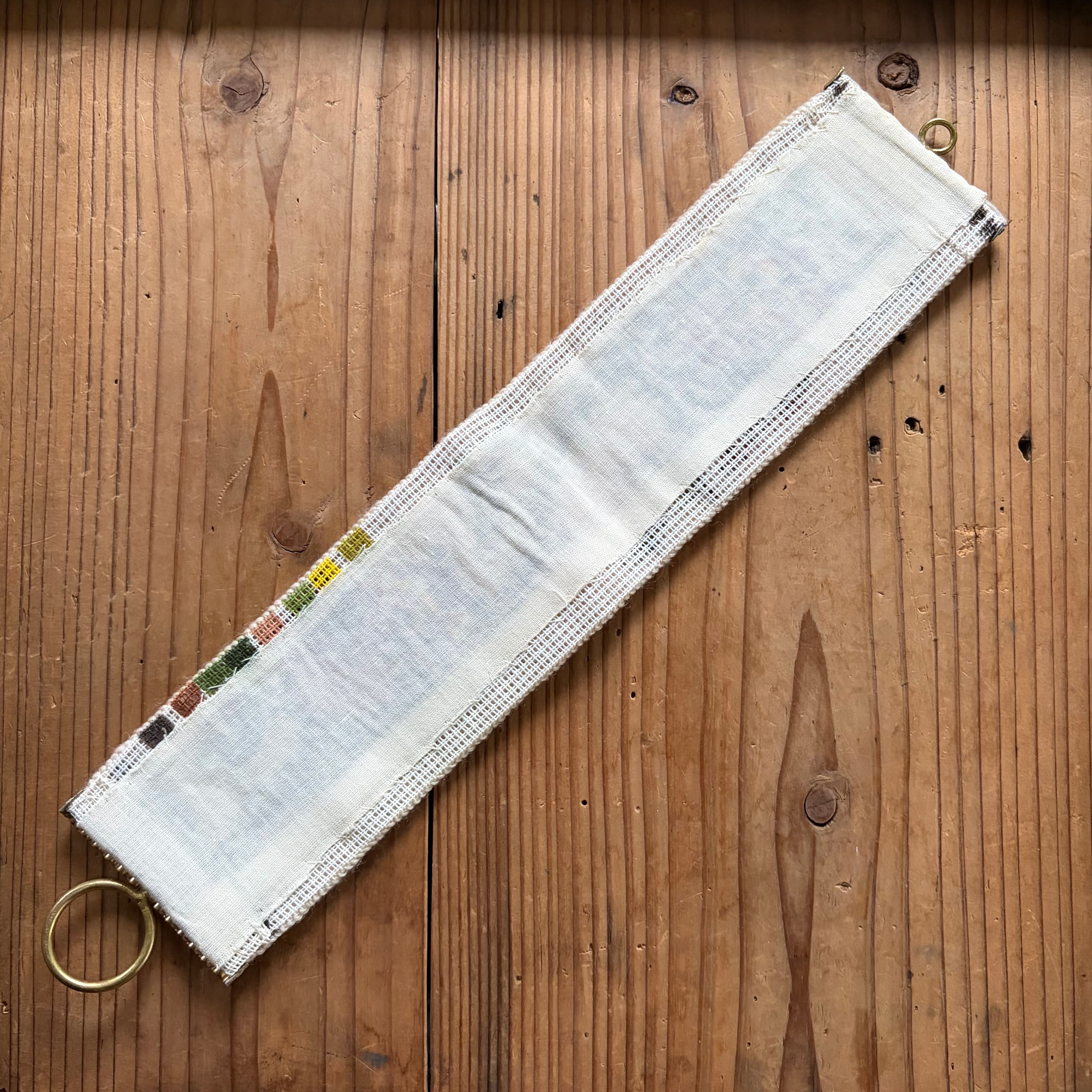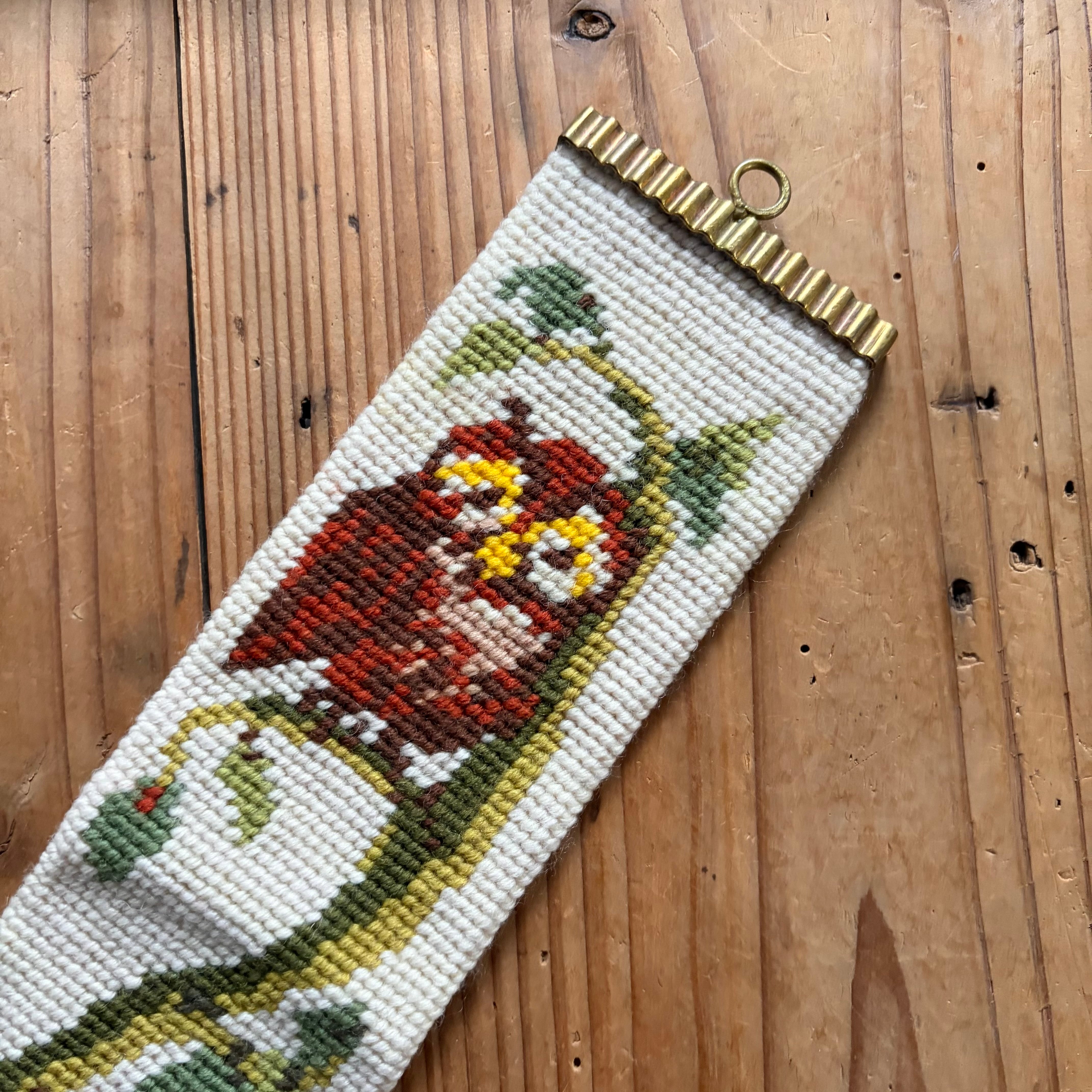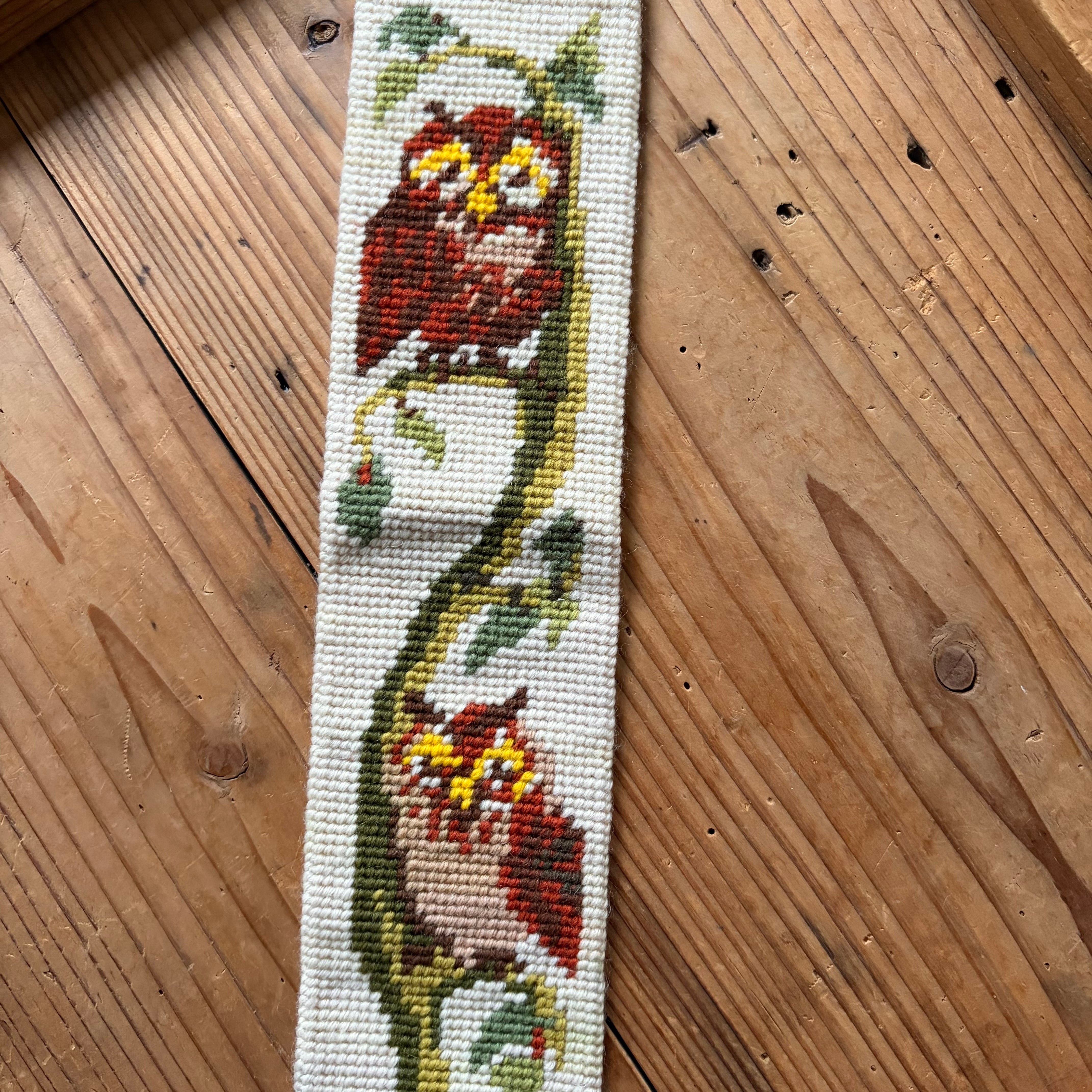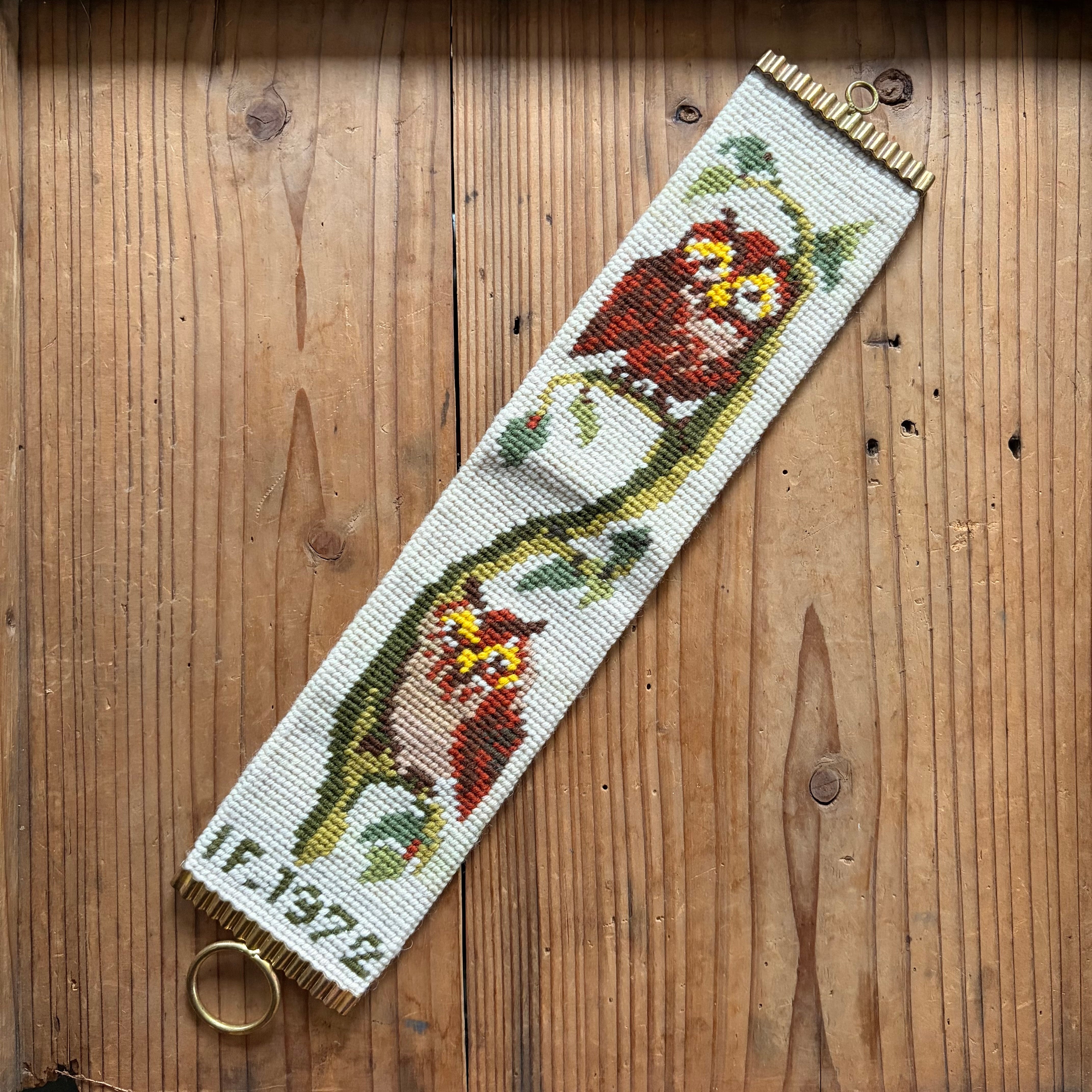 木の枝とフクロウたちが表現された織物でできていて、上下に金具がついているので、壁に飾ってさらにその下にベルをつけたり、チャームをつけたりとアレンジをして楽しむこともできます。