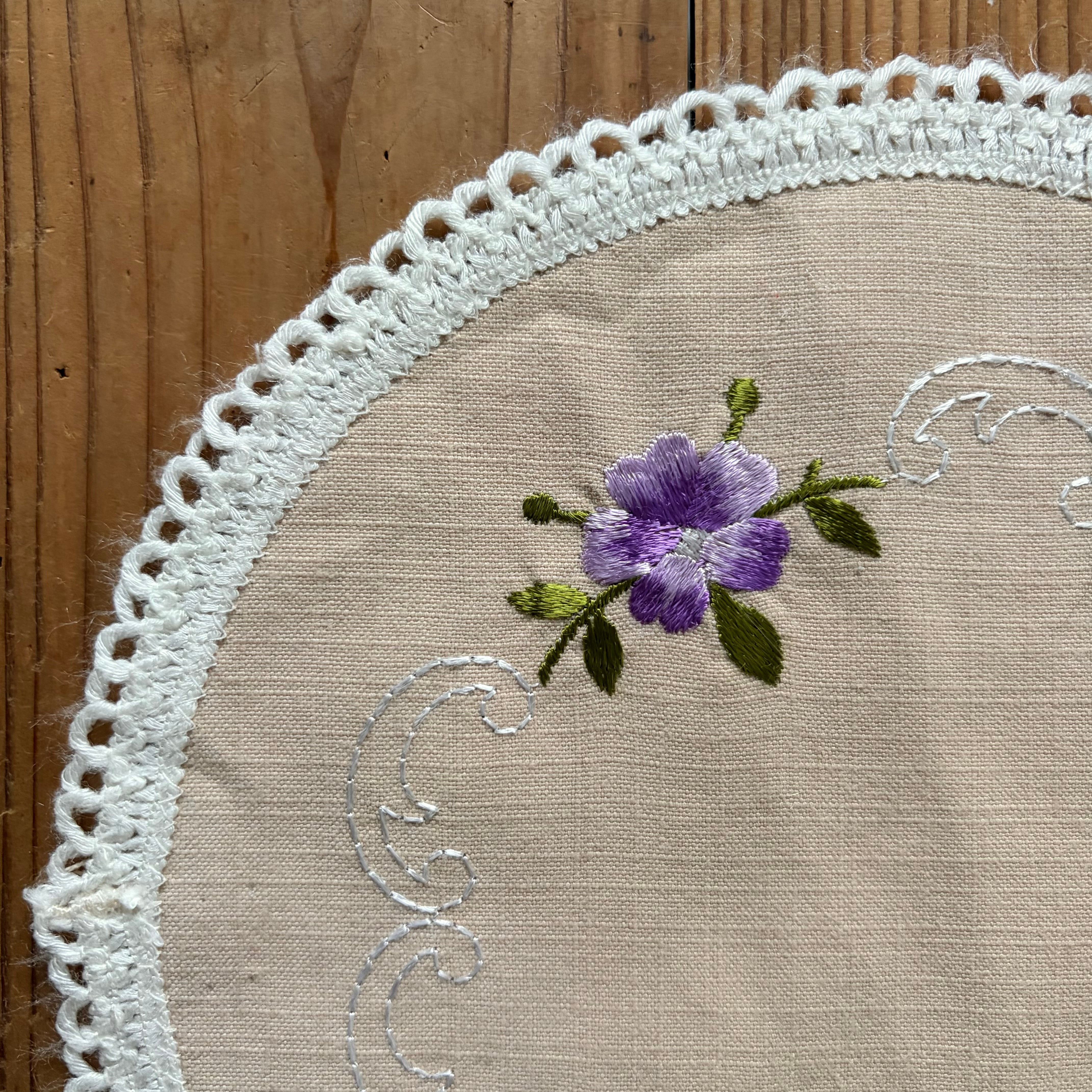 ベージュ地の布に、紫の花が刺繡されています。