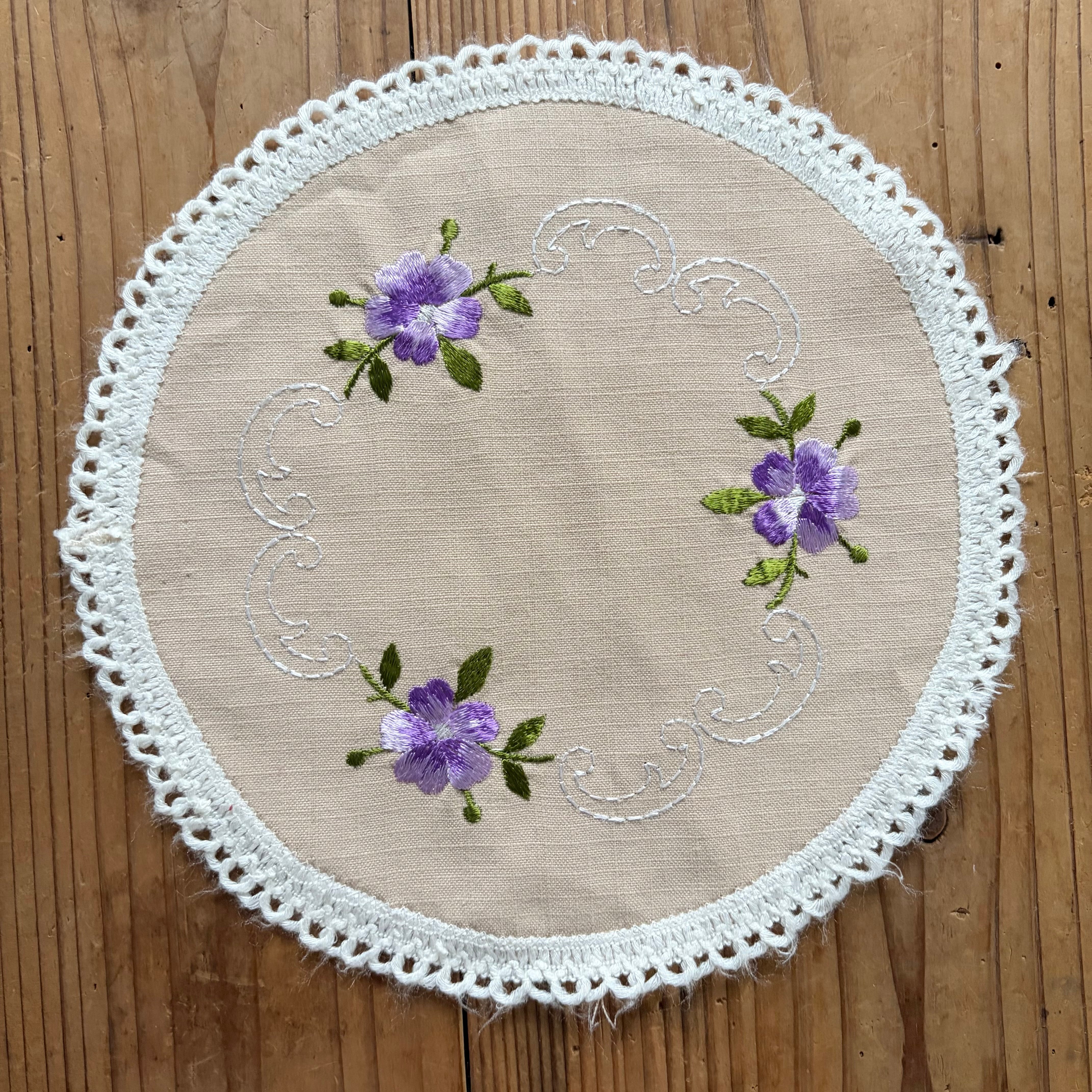 紫の花の刺繍の丸い布