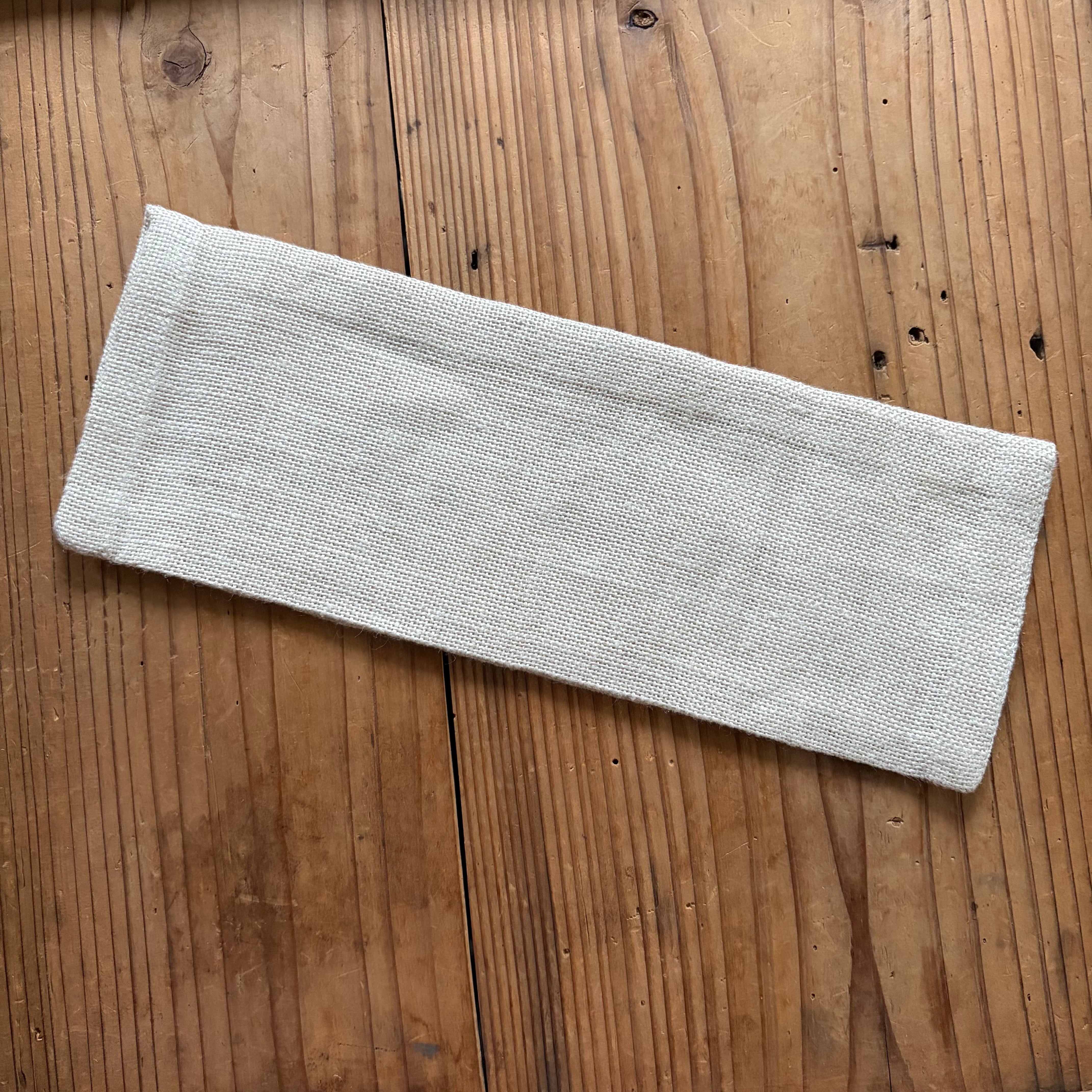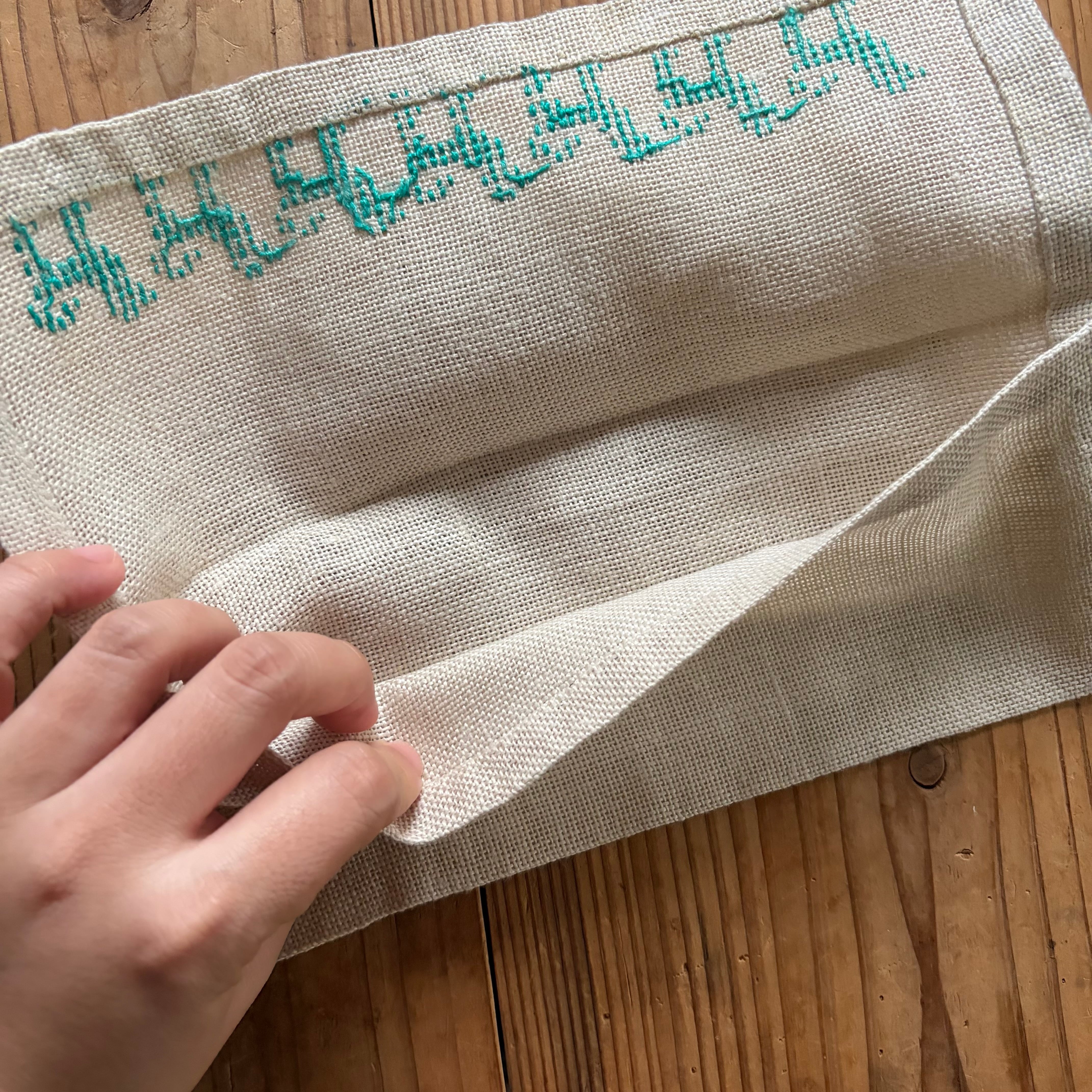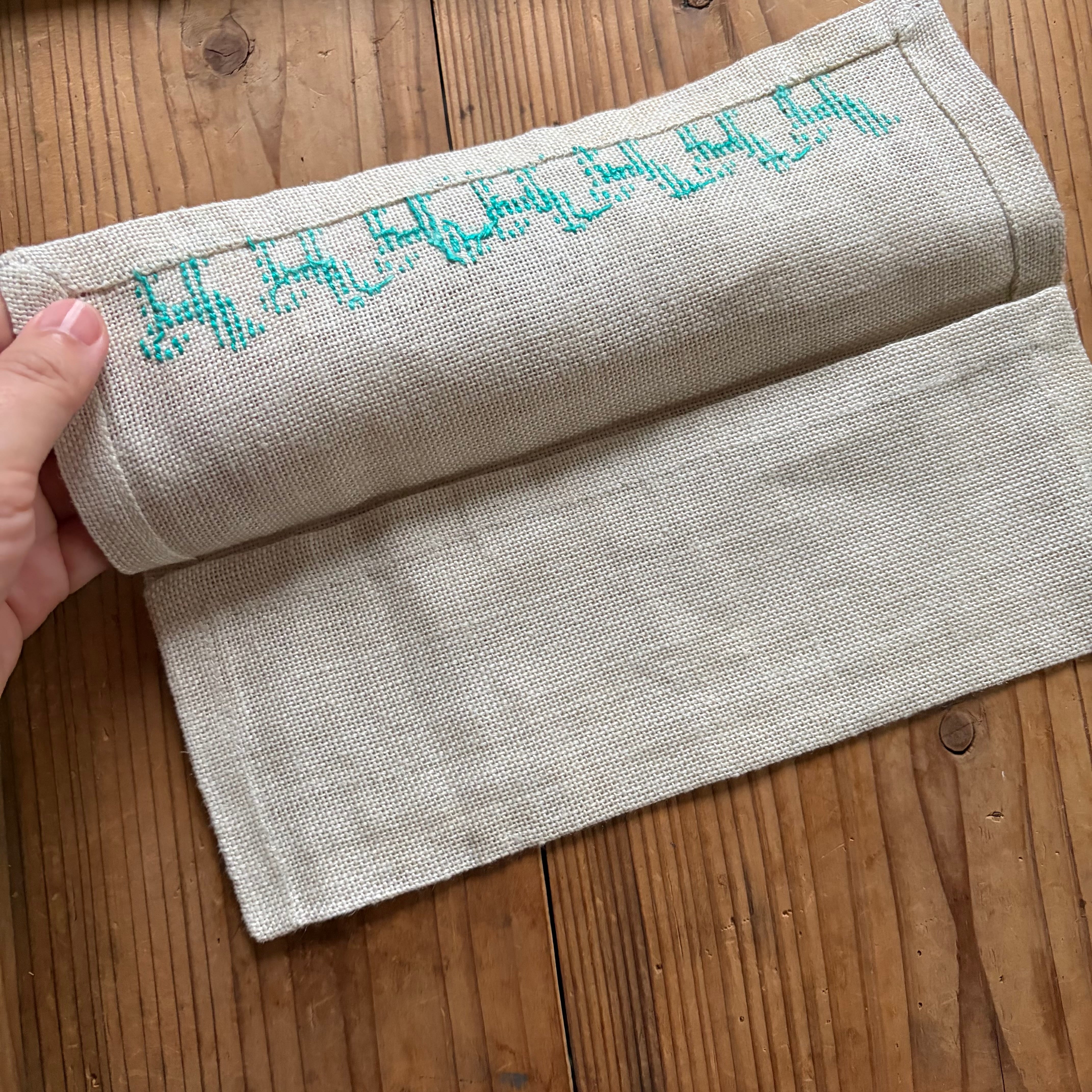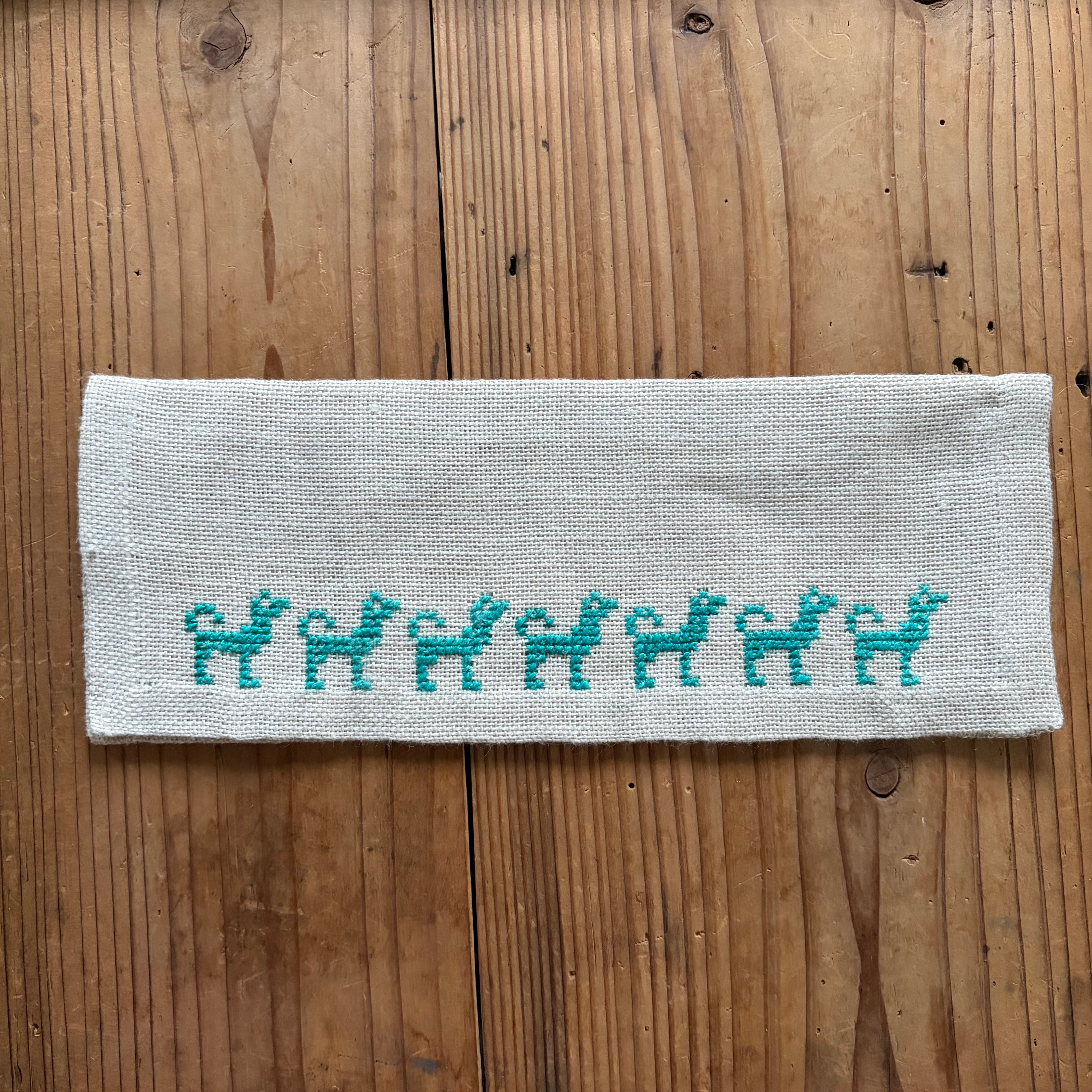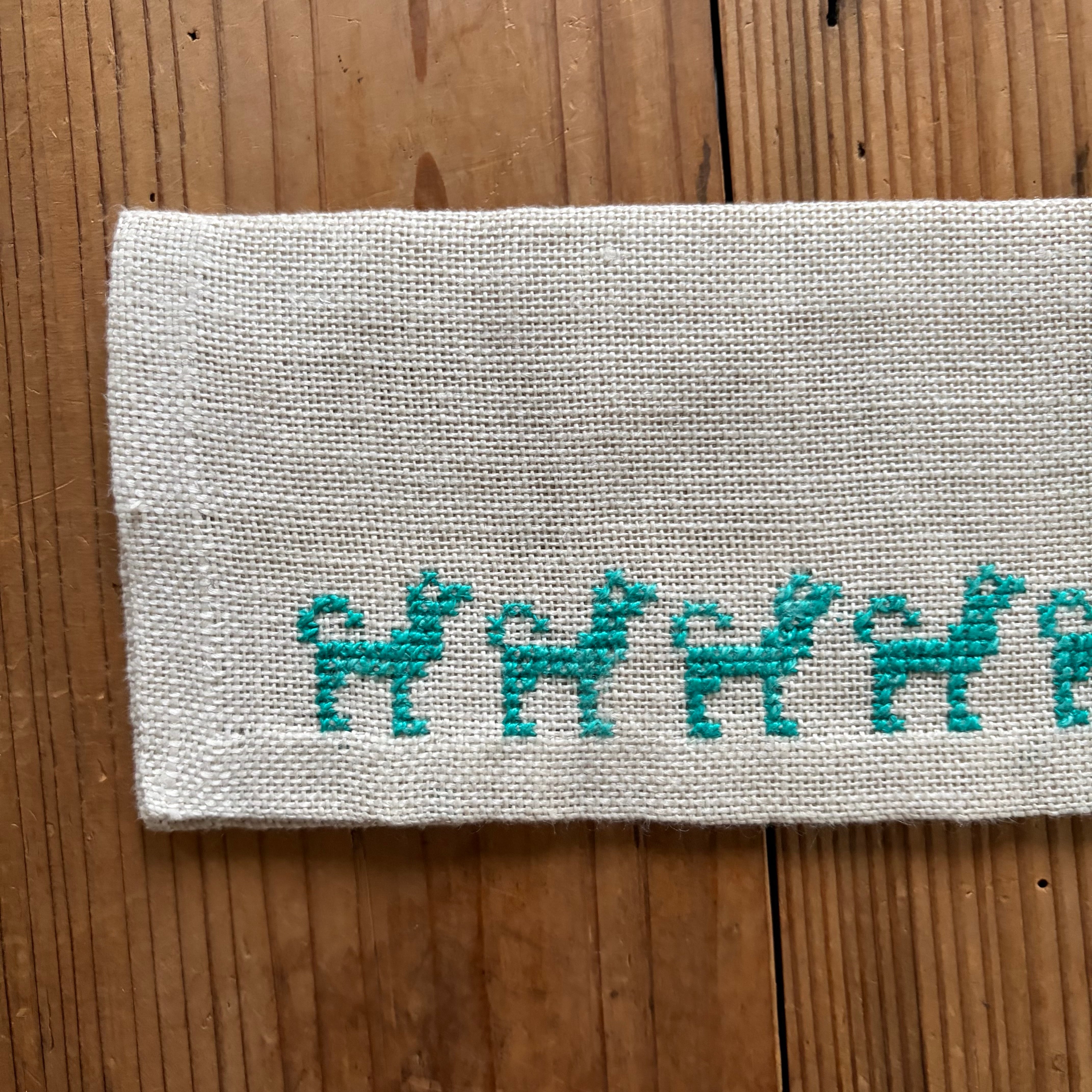 生成り色の布の入れ物は、青緑色でクロスステッチ刺繍された犬7匹が可愛いです。