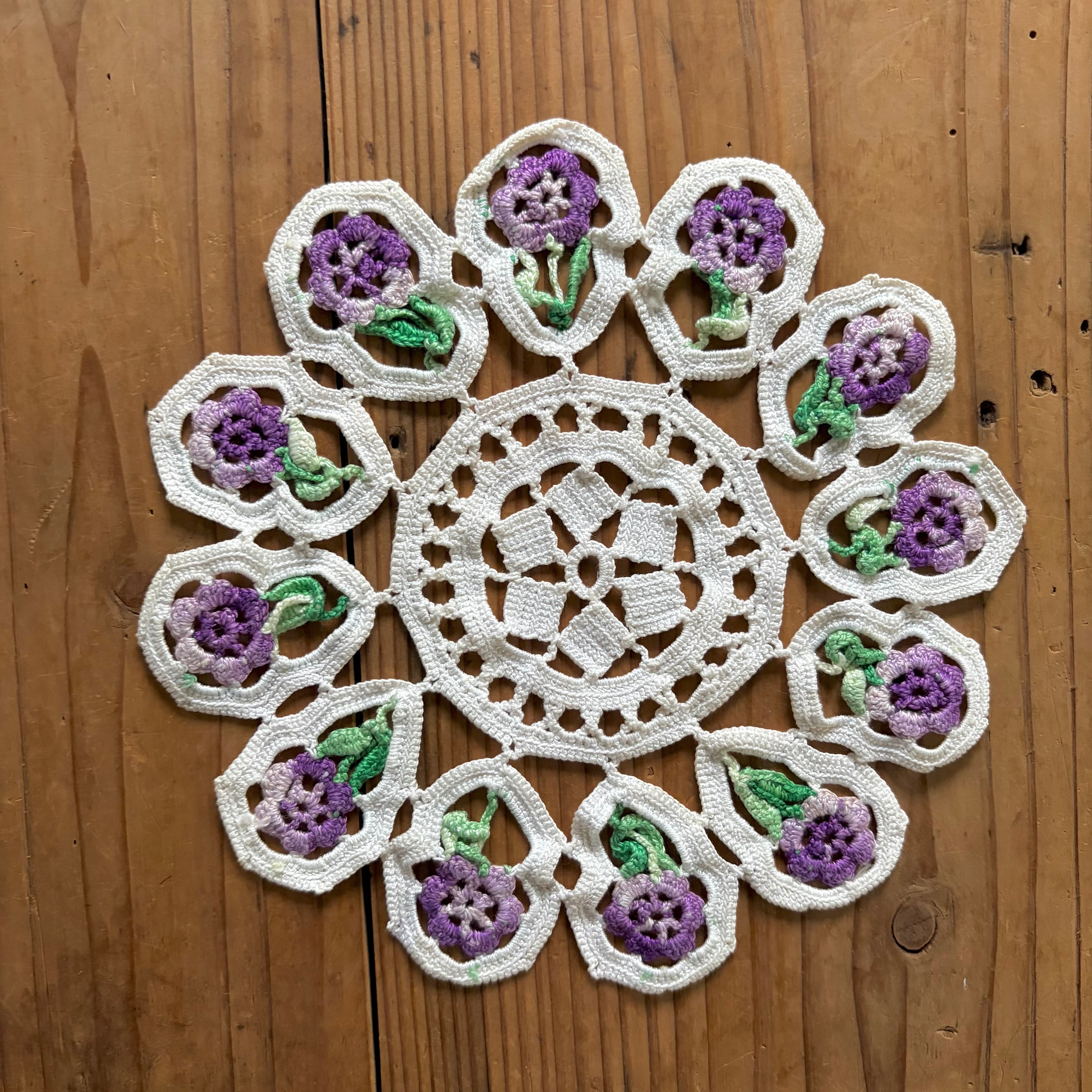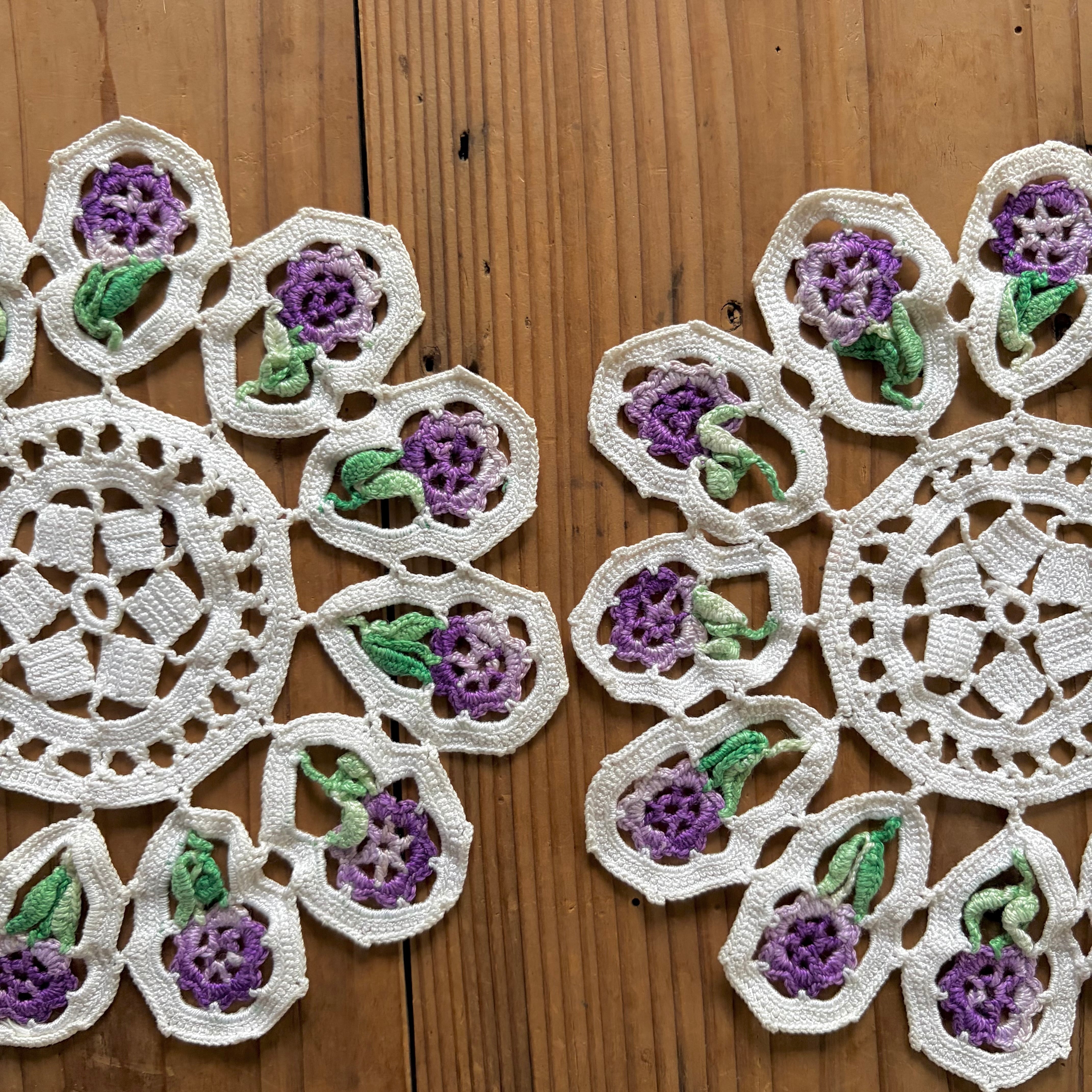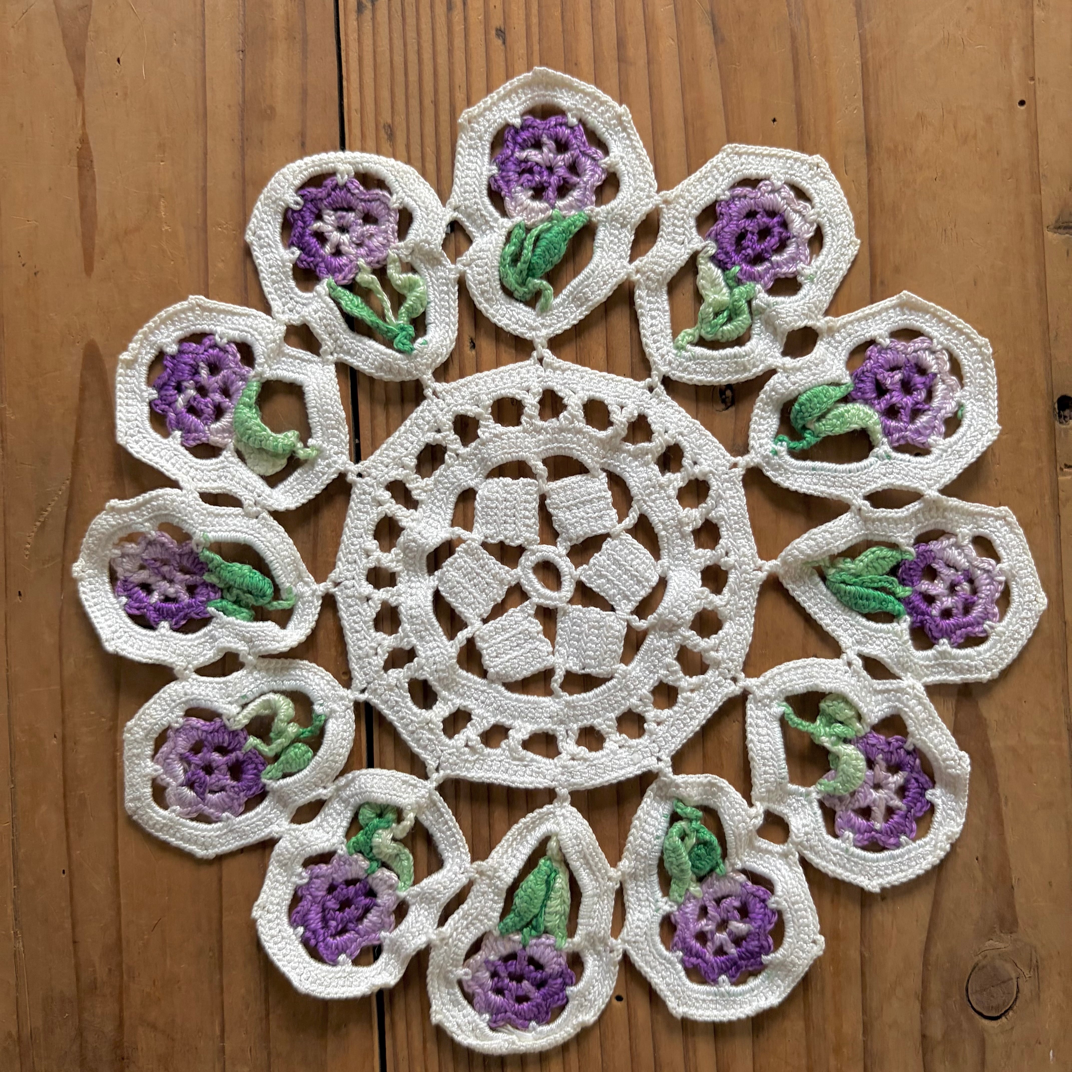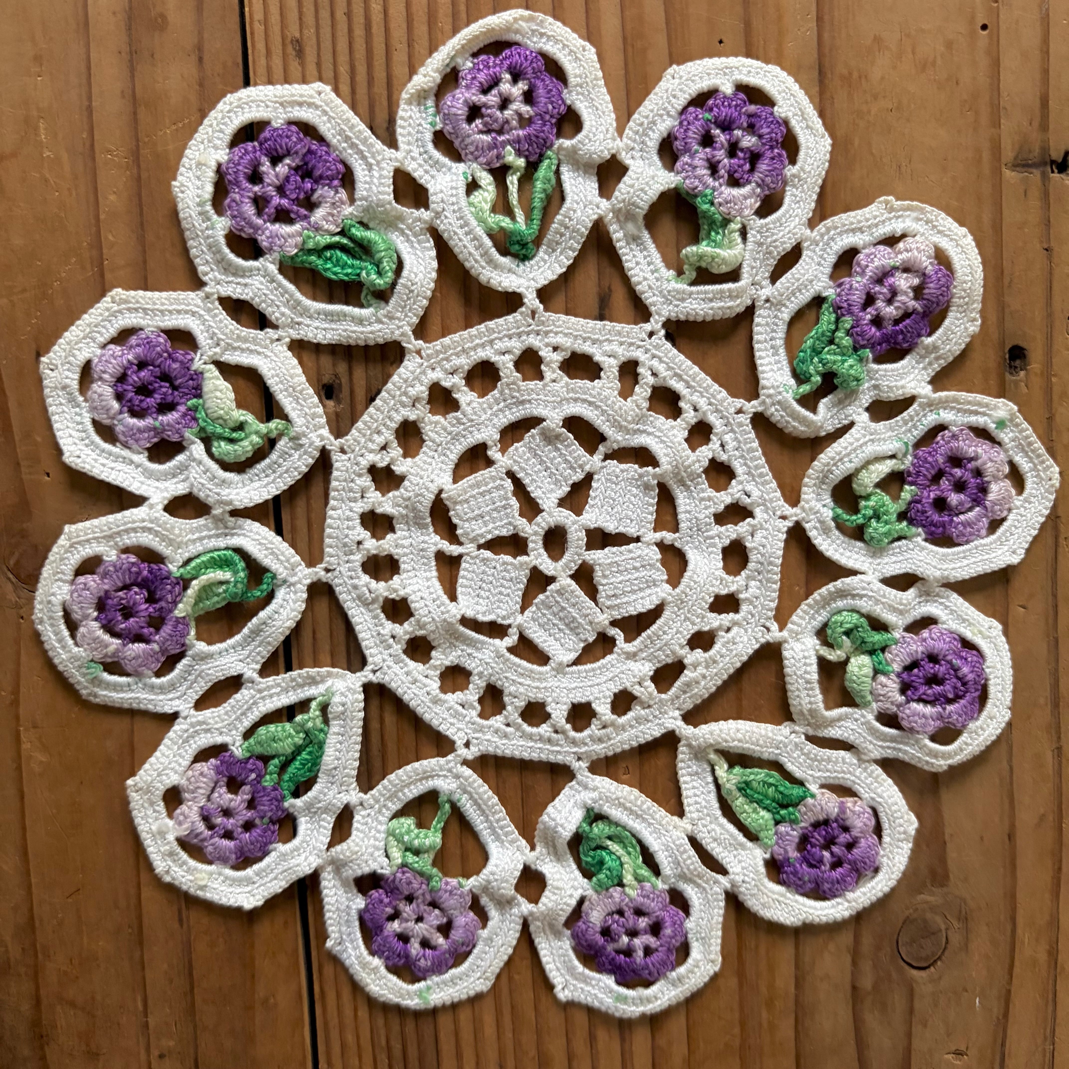 紫の花が可愛らしくて個性的なドイリーです。