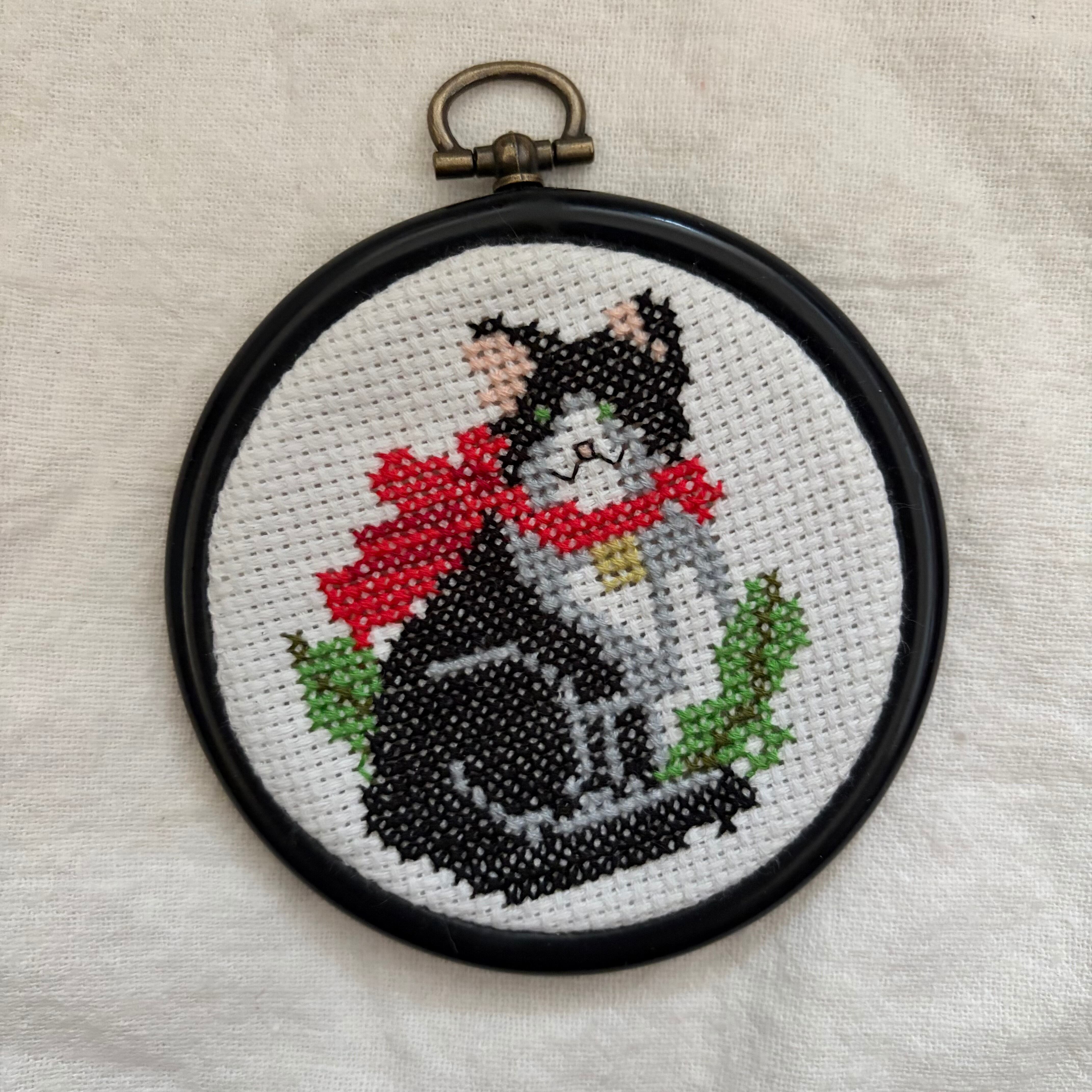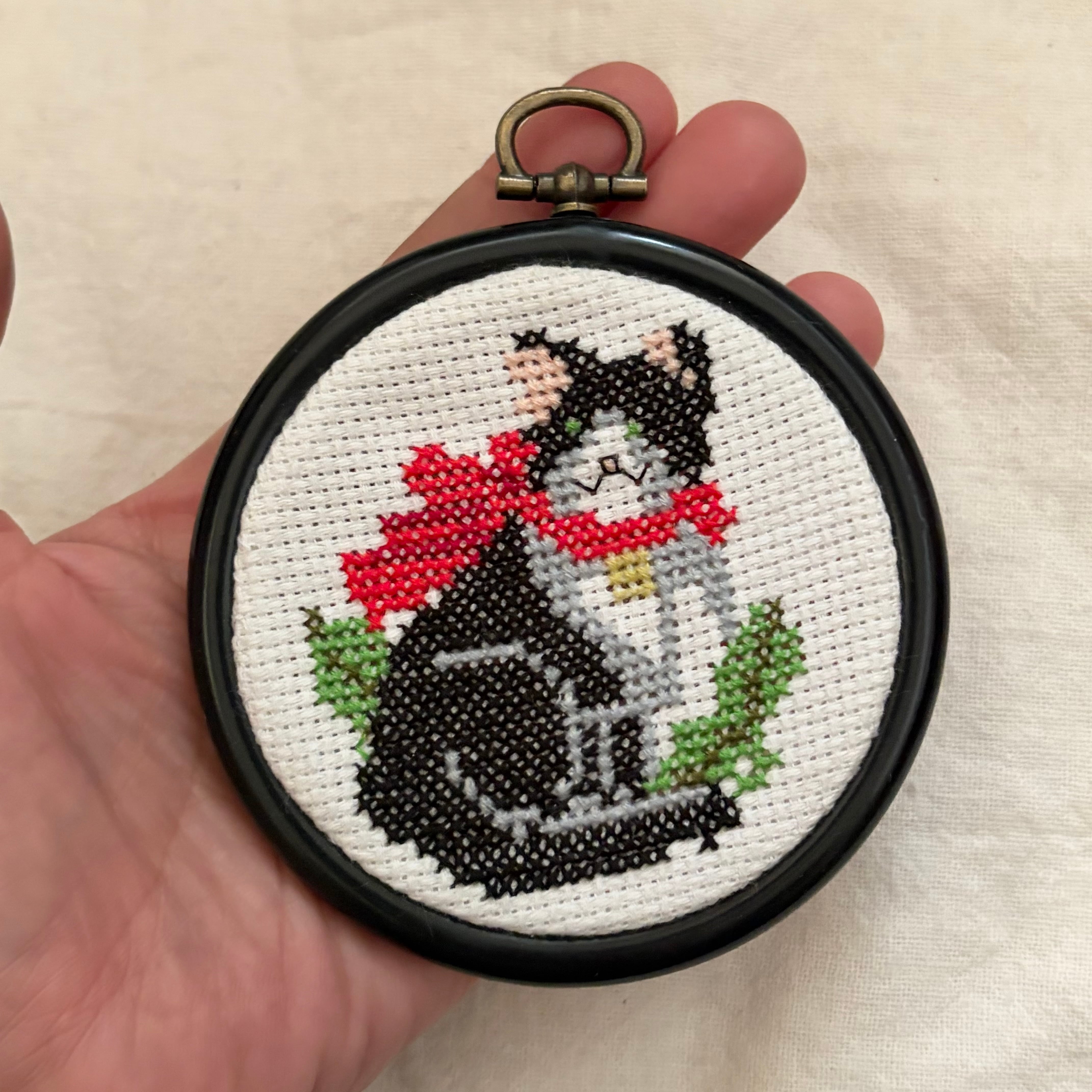クロスステッチ刺繡の黒猫の壁飾り