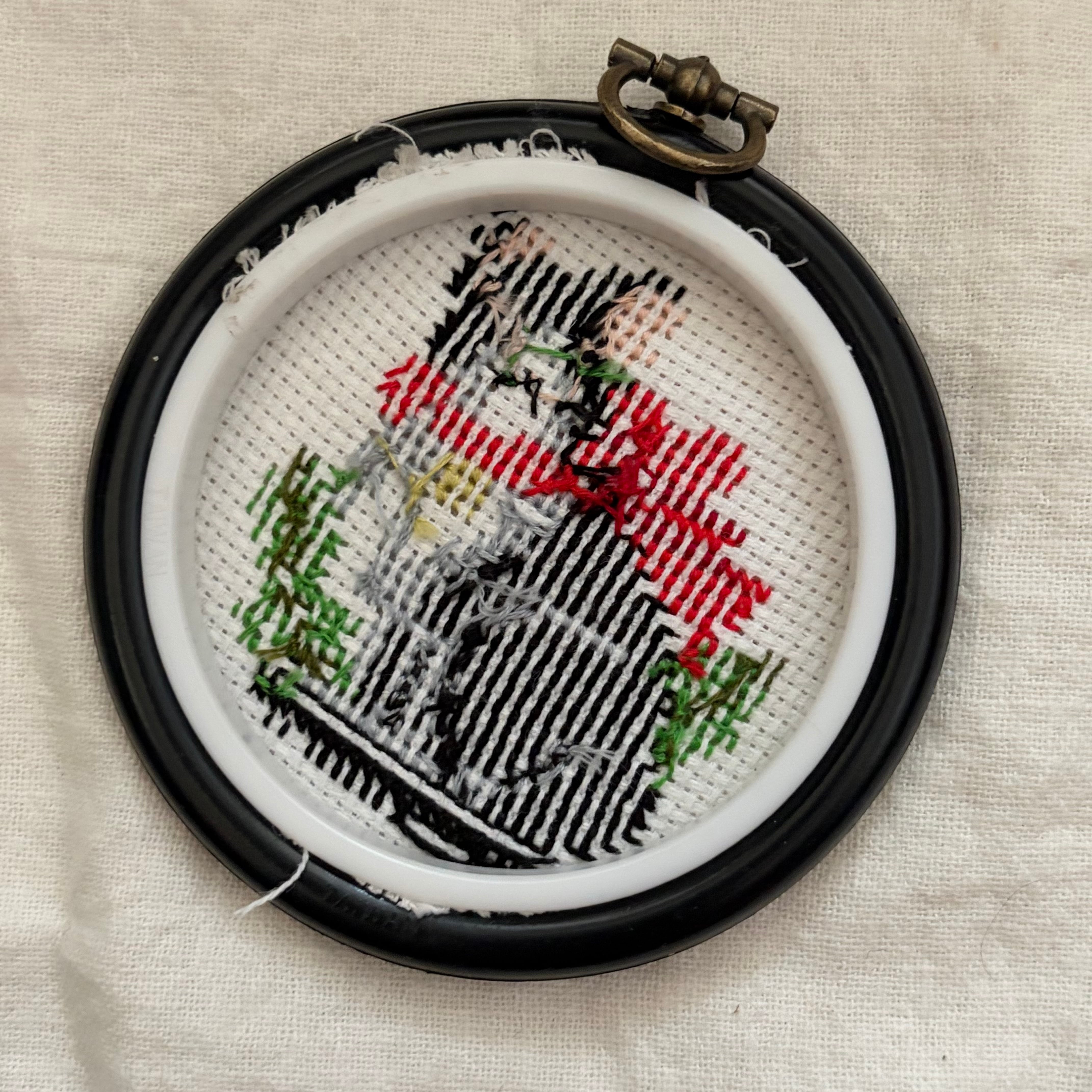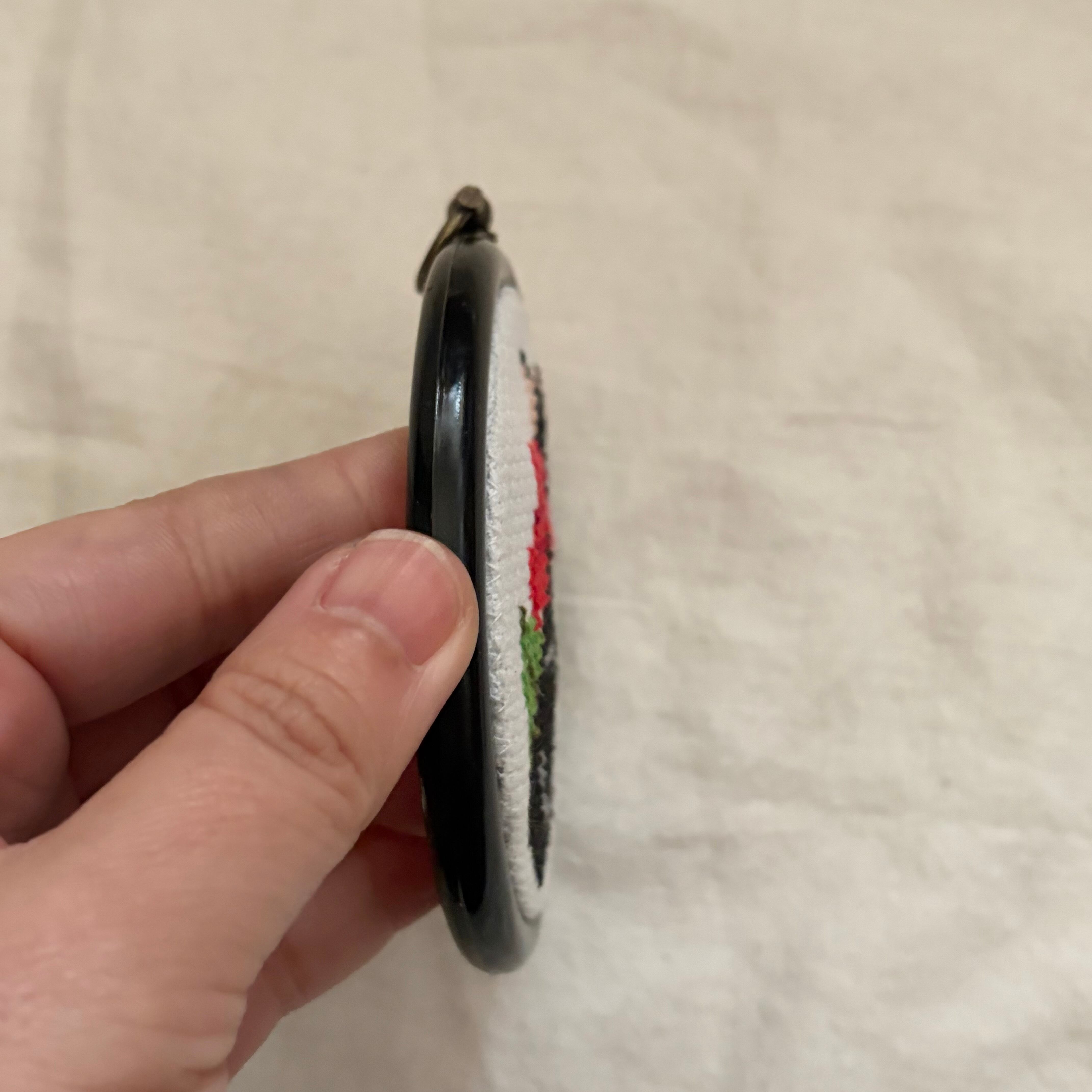 黒いゴム製のフレームに、赤いリボンをした黒猫がクロスステッチ刺繡で表現されています。