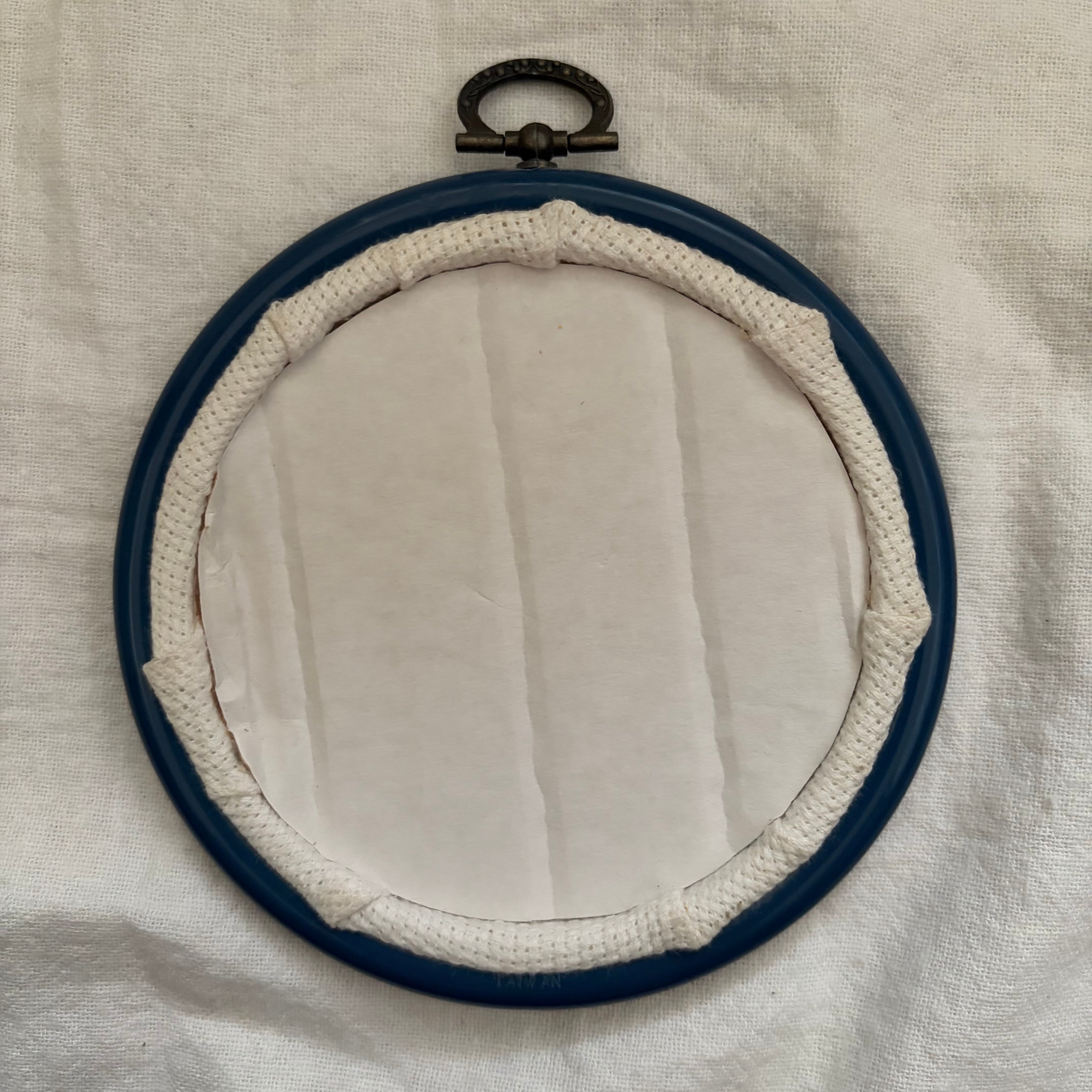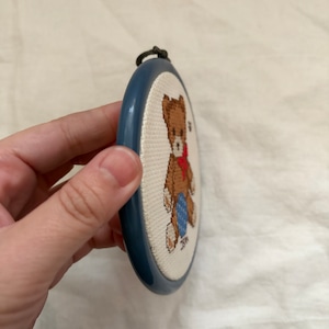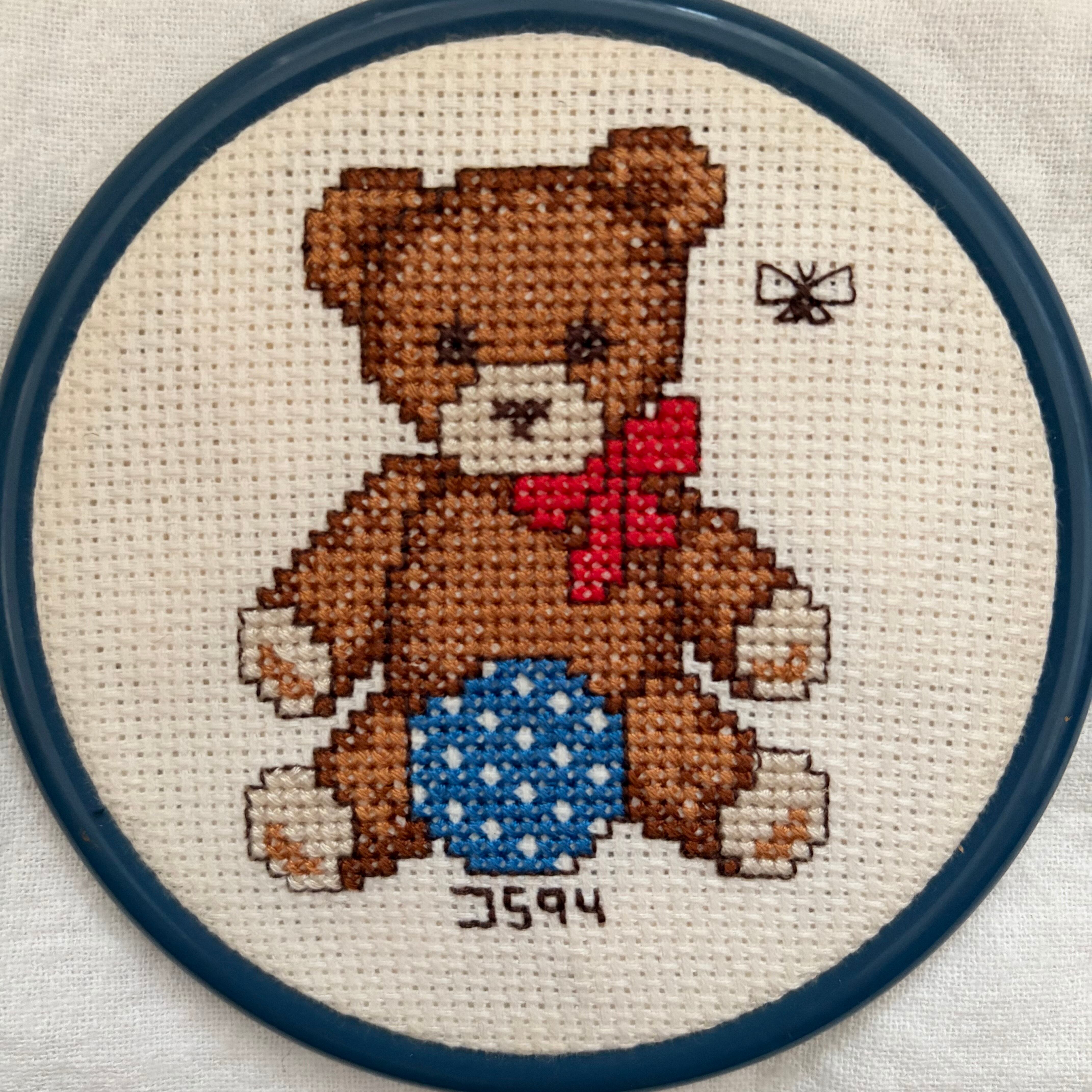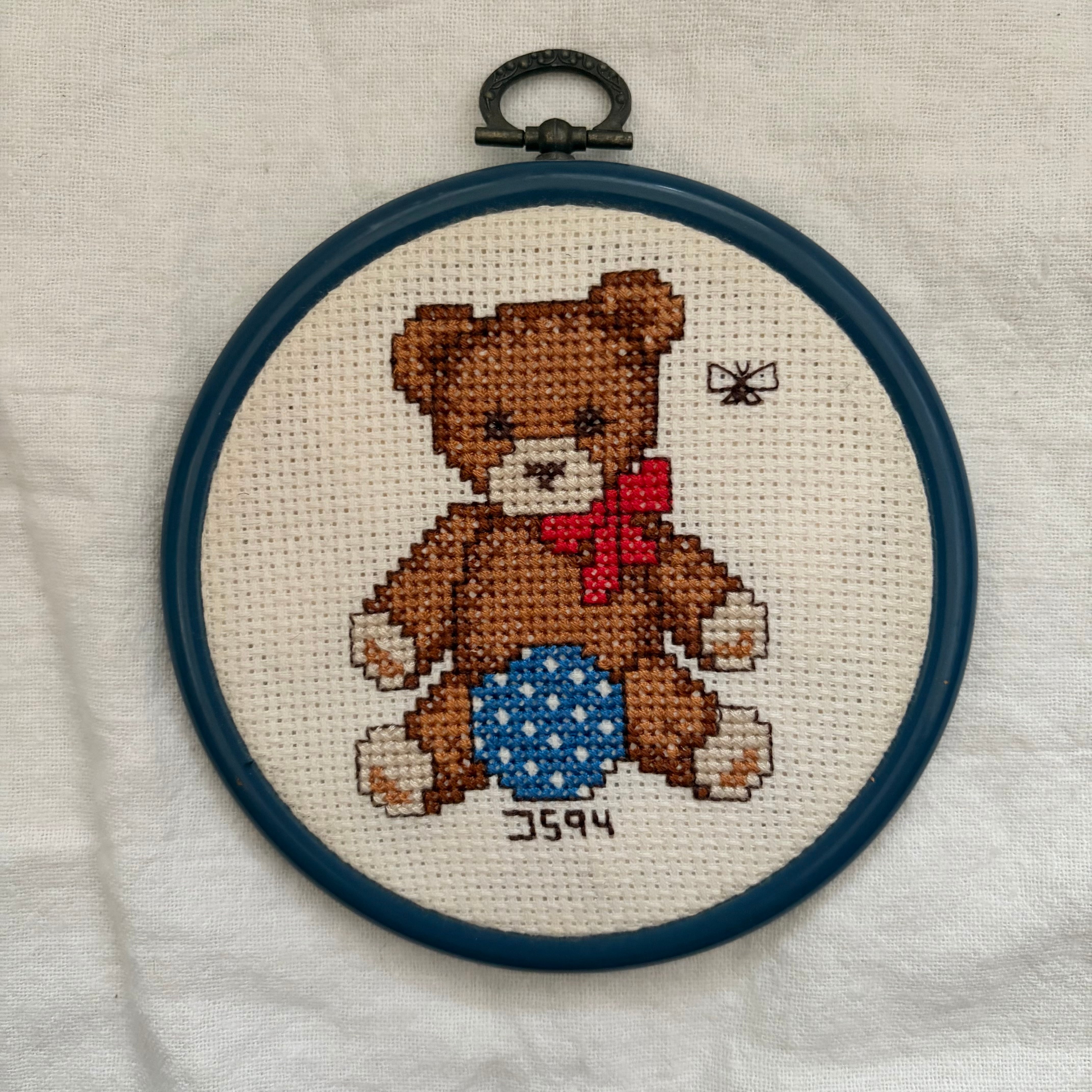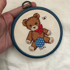 ゴム製のフレームに、クロスステッチ刺繡を使いながらくまのぬいぐるみとボールと小さな蝶が表現されています。