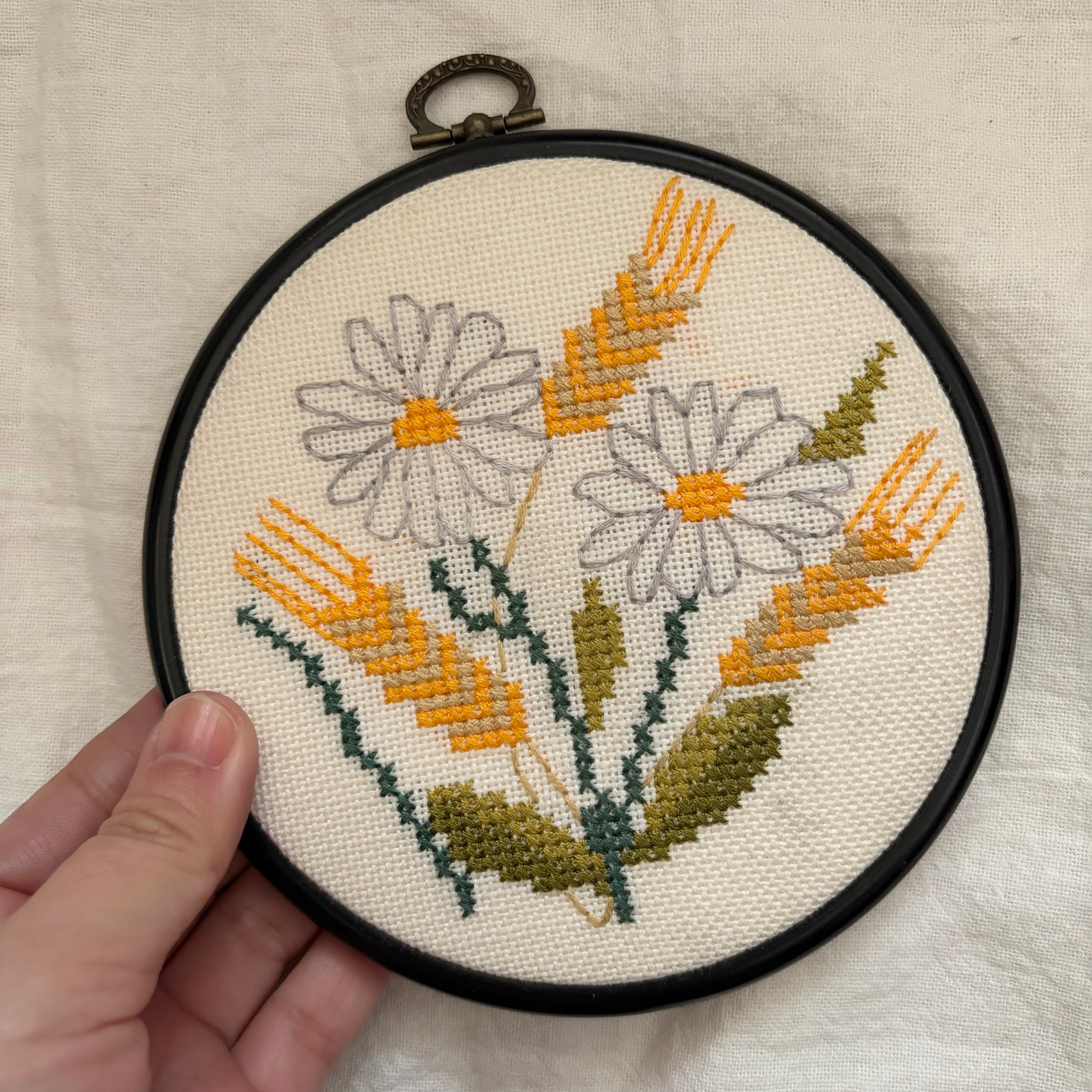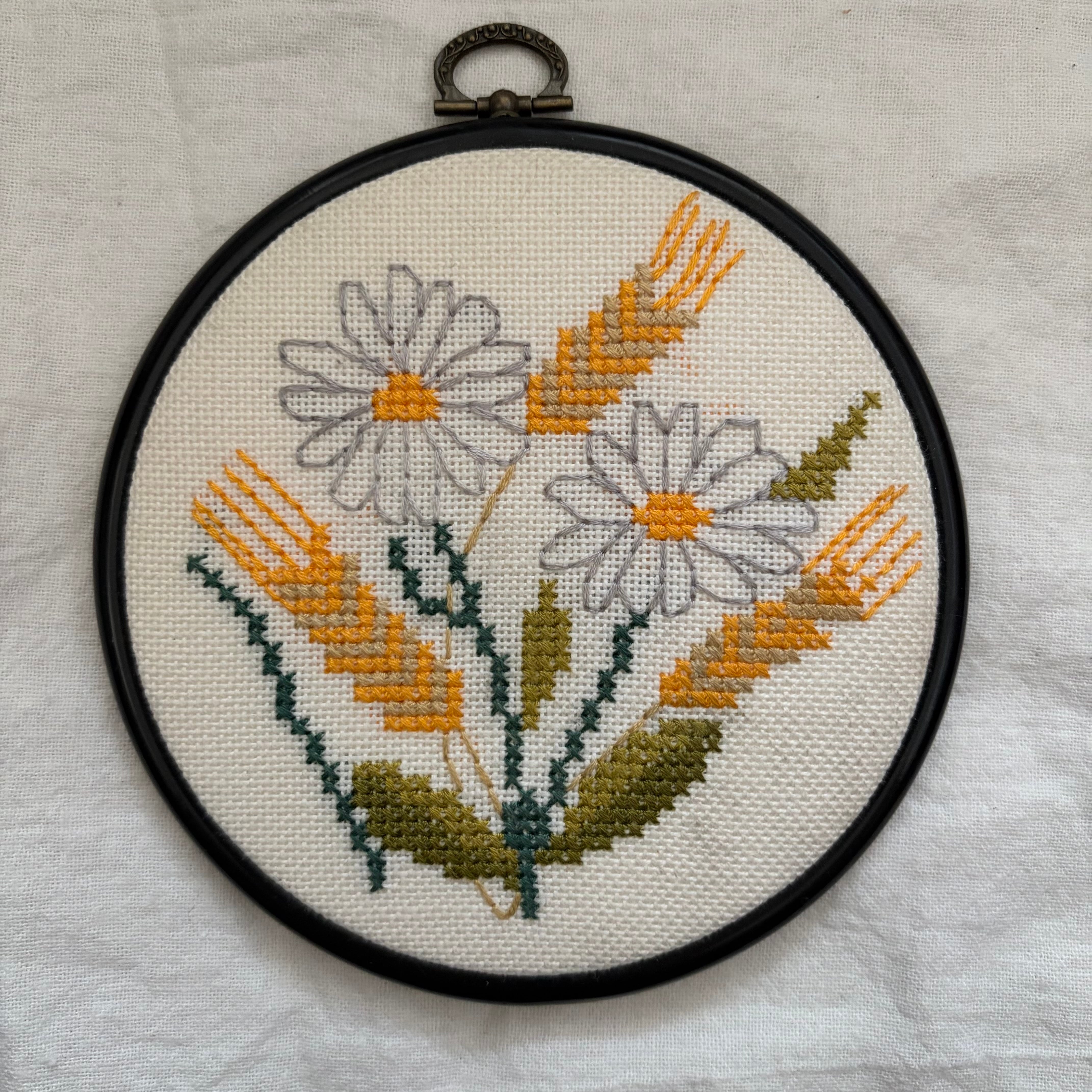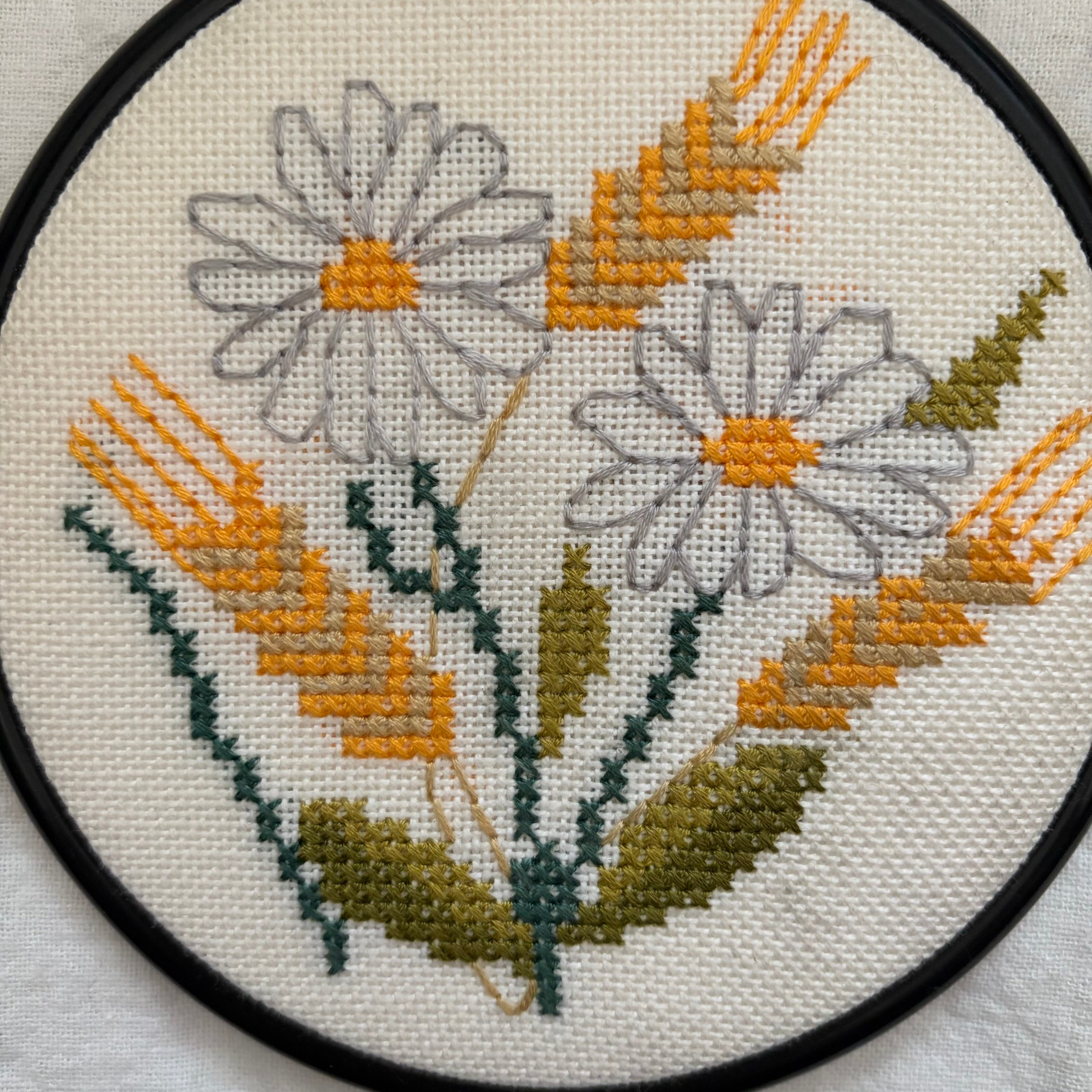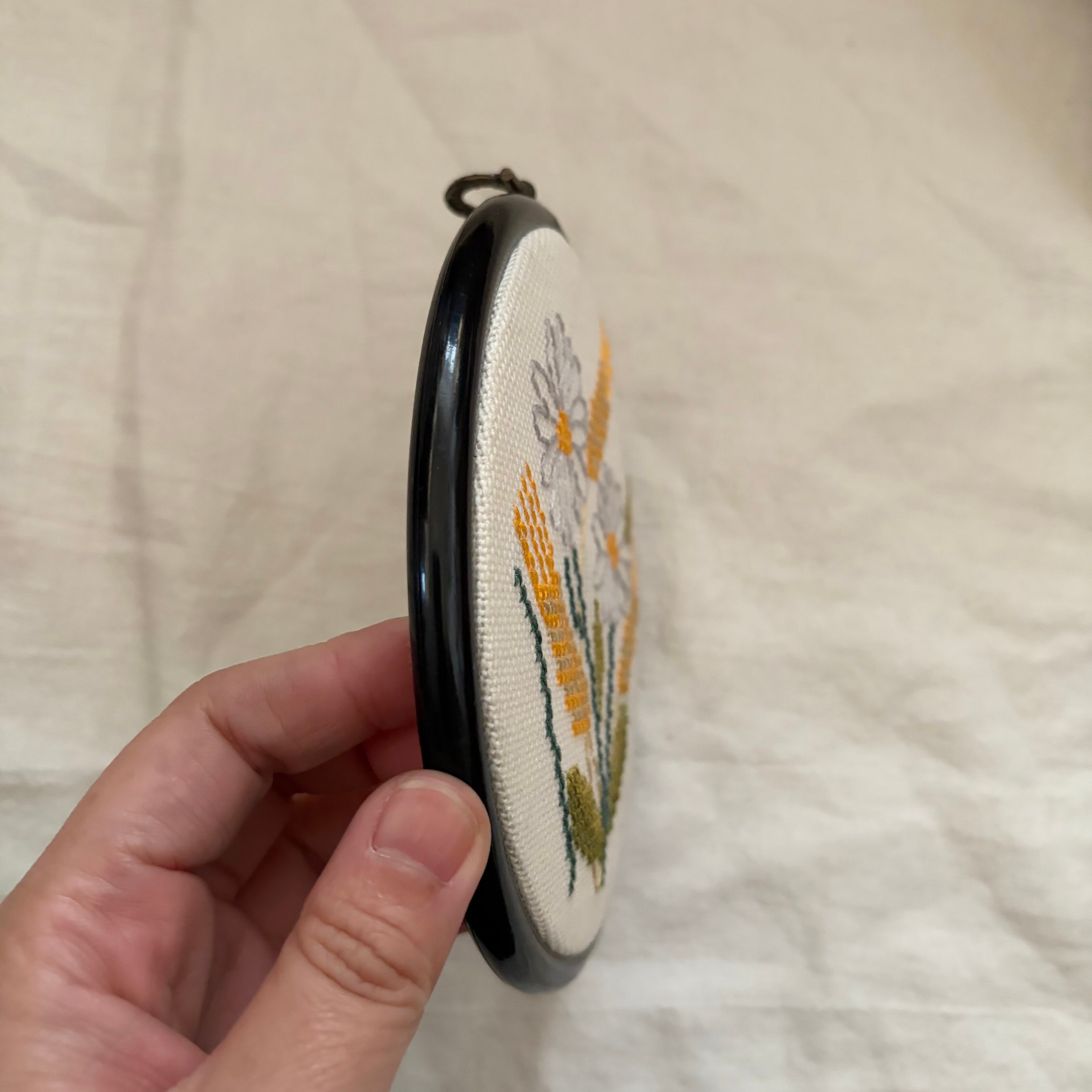 ゴム製のフレームに、デイジーの花と麦の穂が刺繍されています。