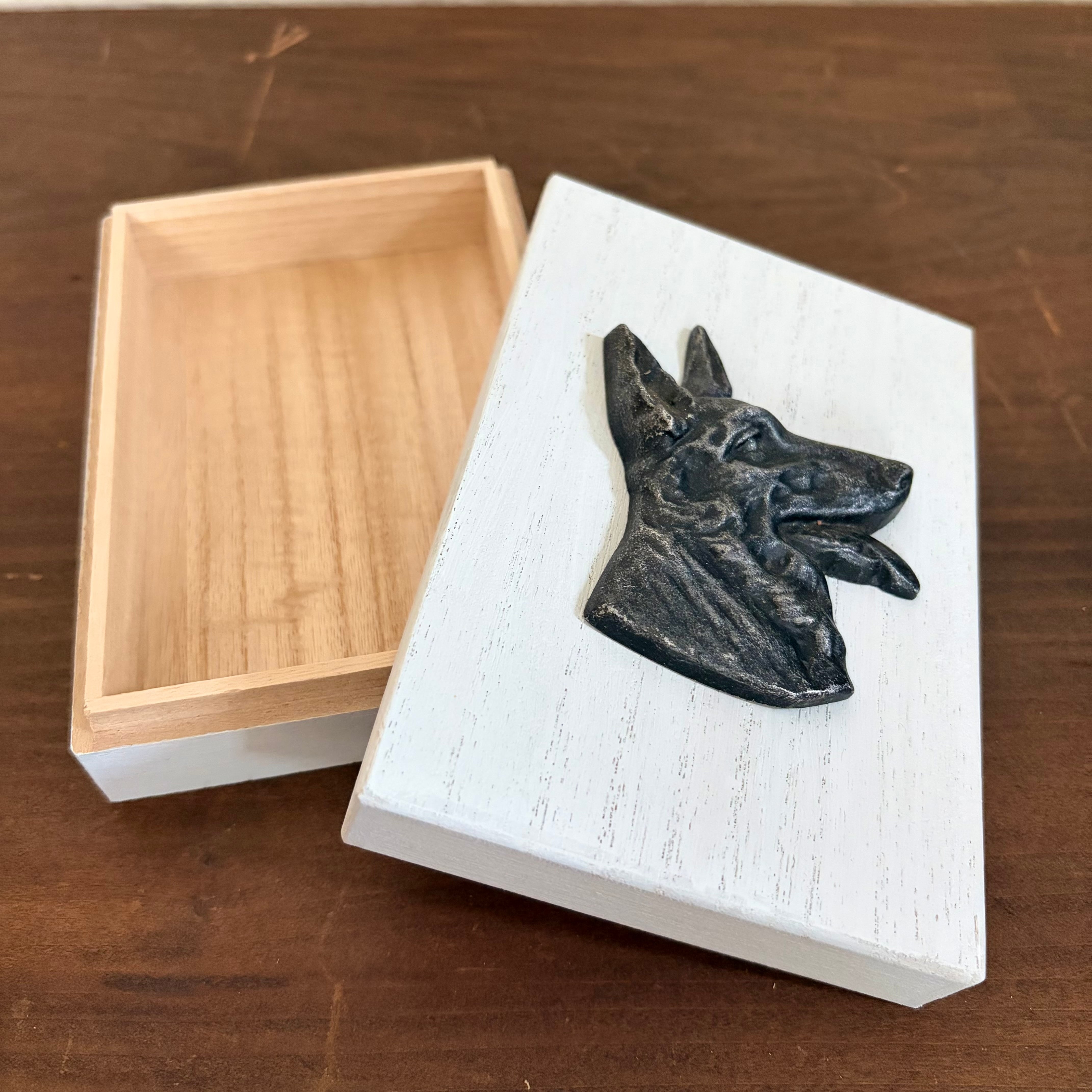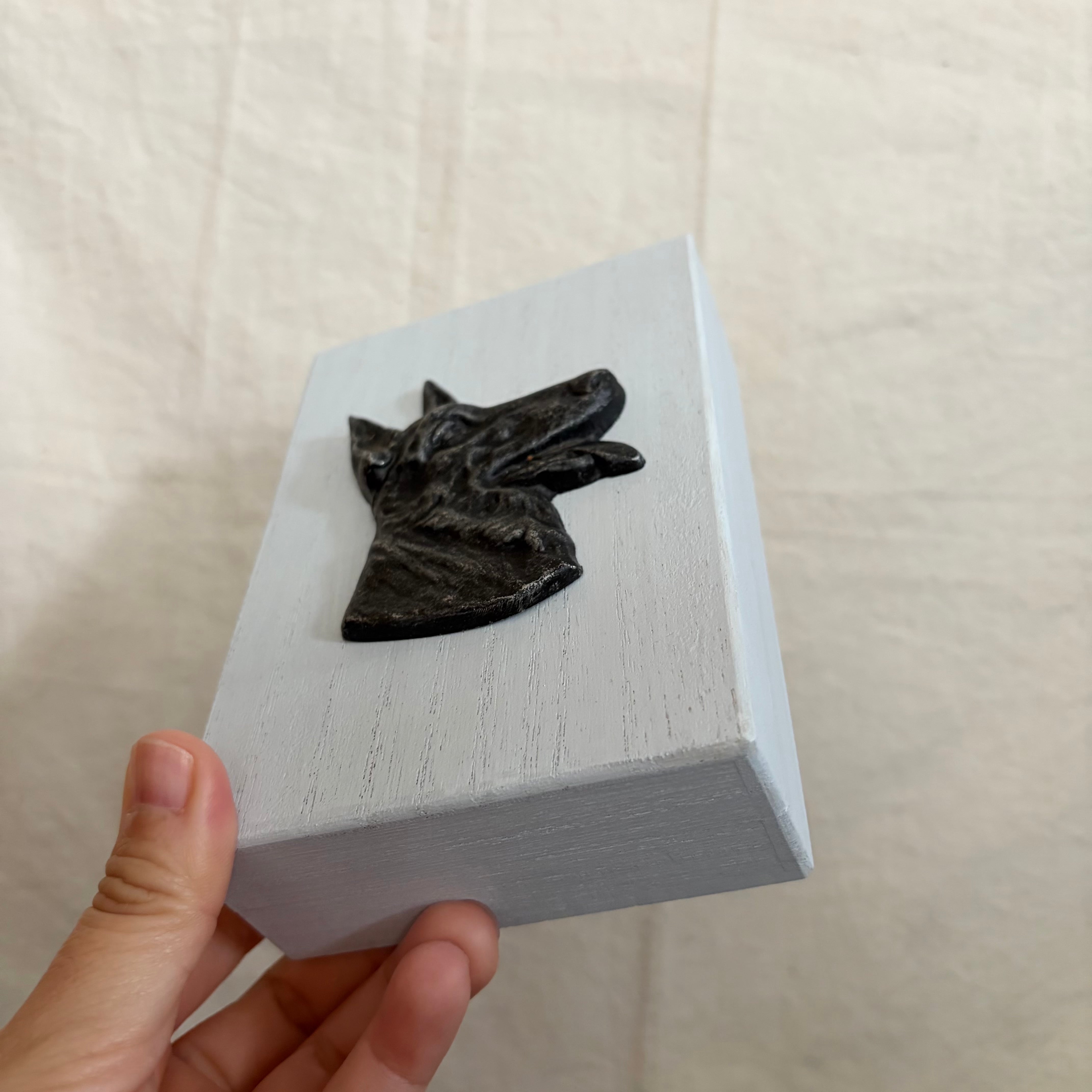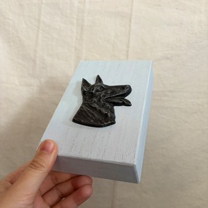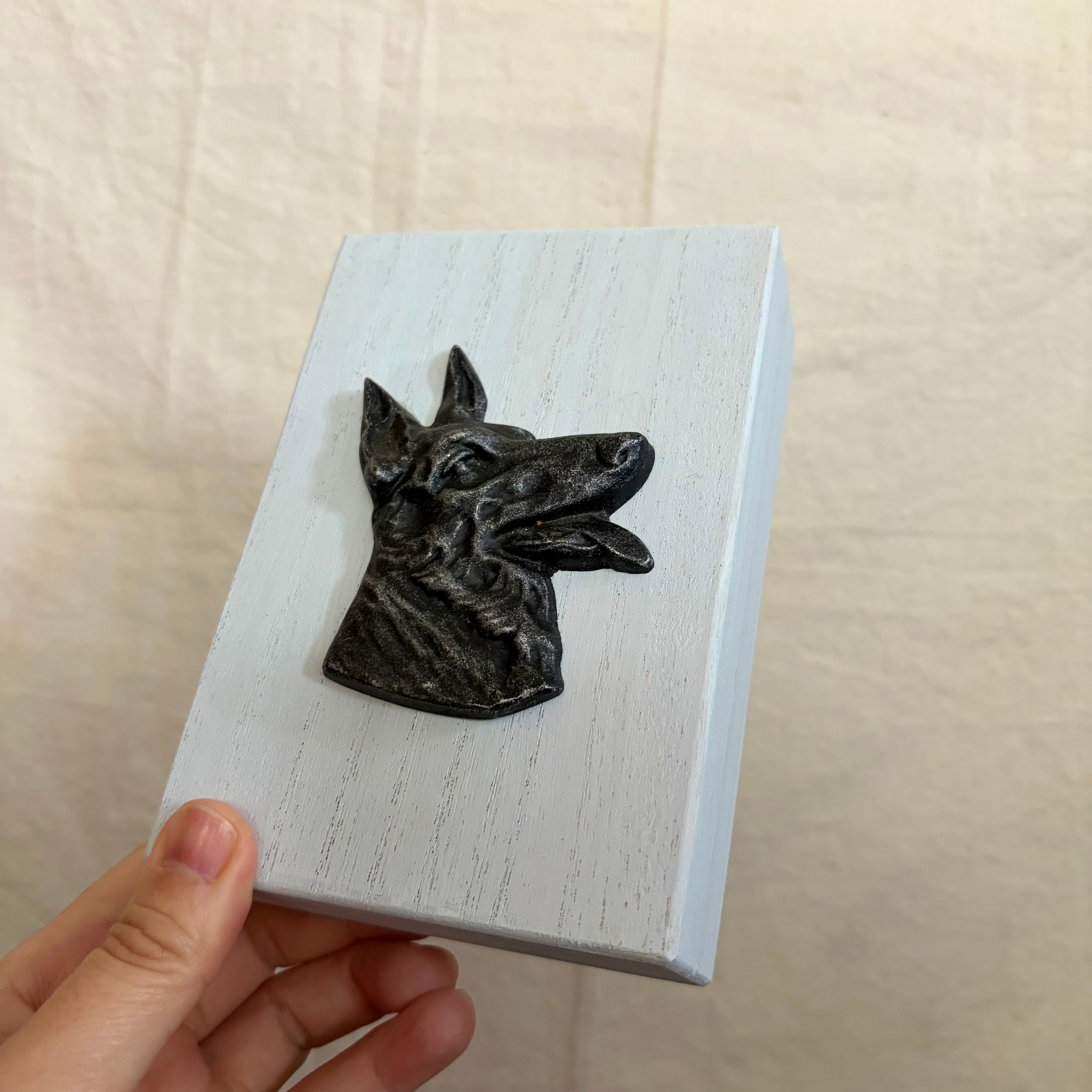 桐製の箱に薄いブルーを塗り、その上にドイツで見つけた金属製の犬の顔を乗せました。