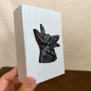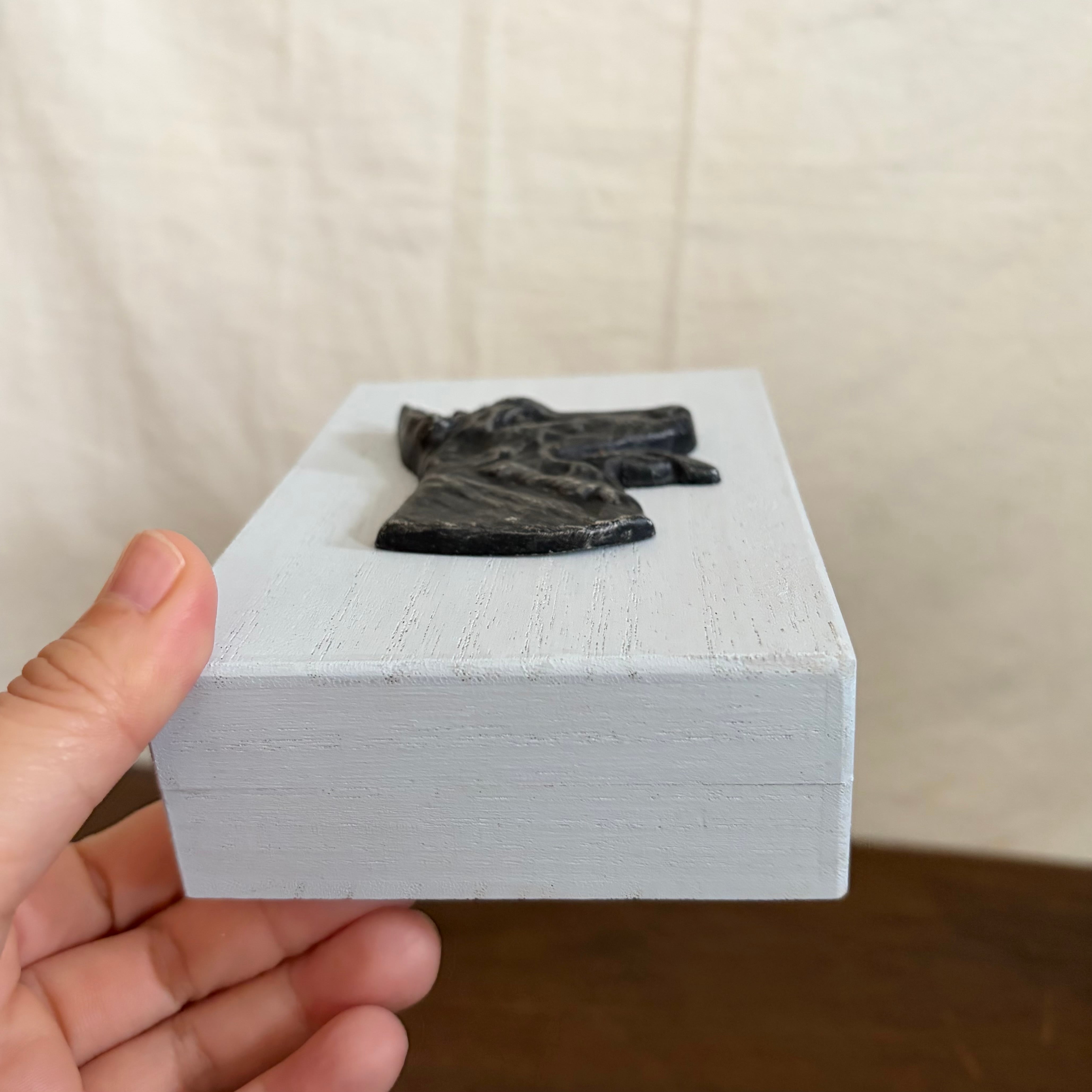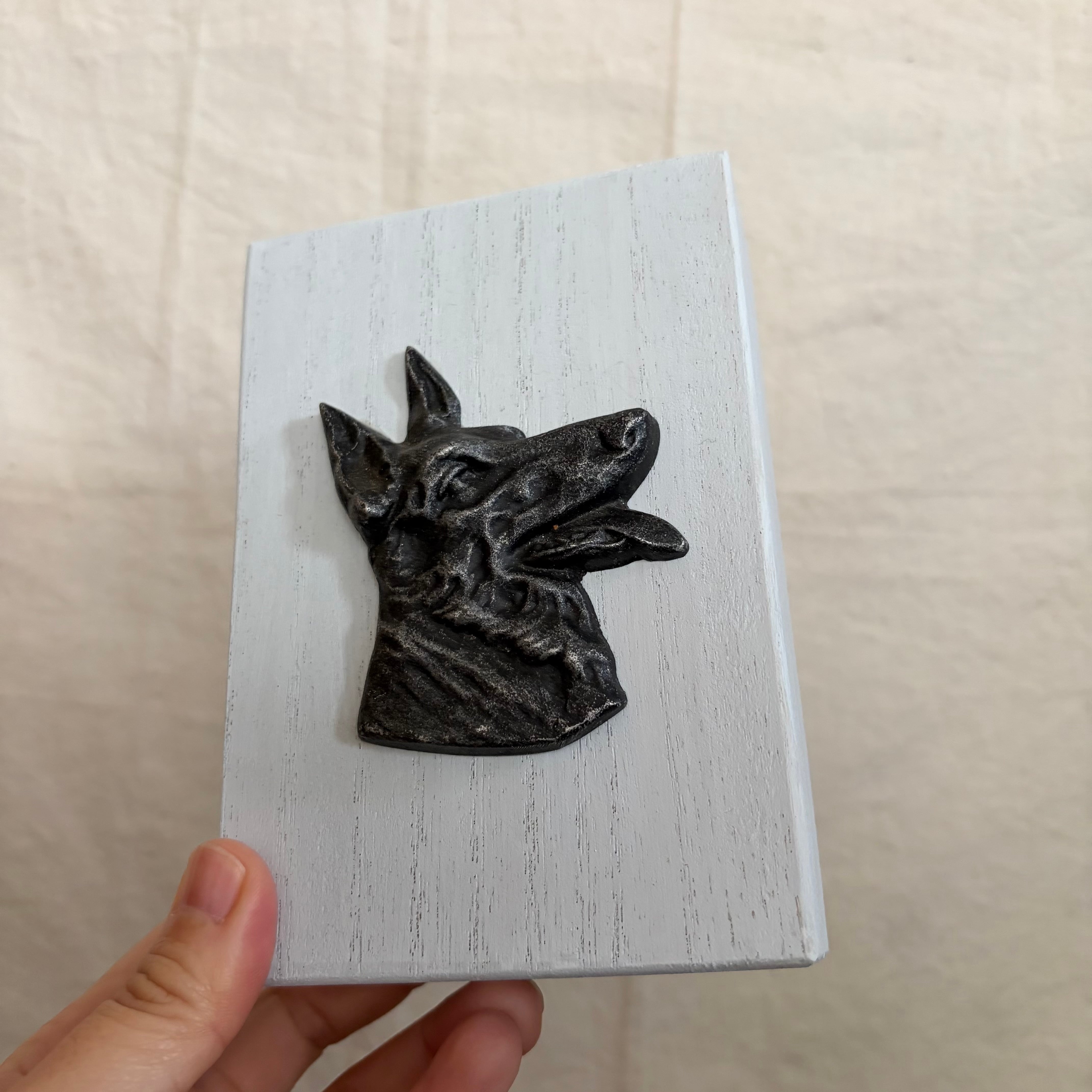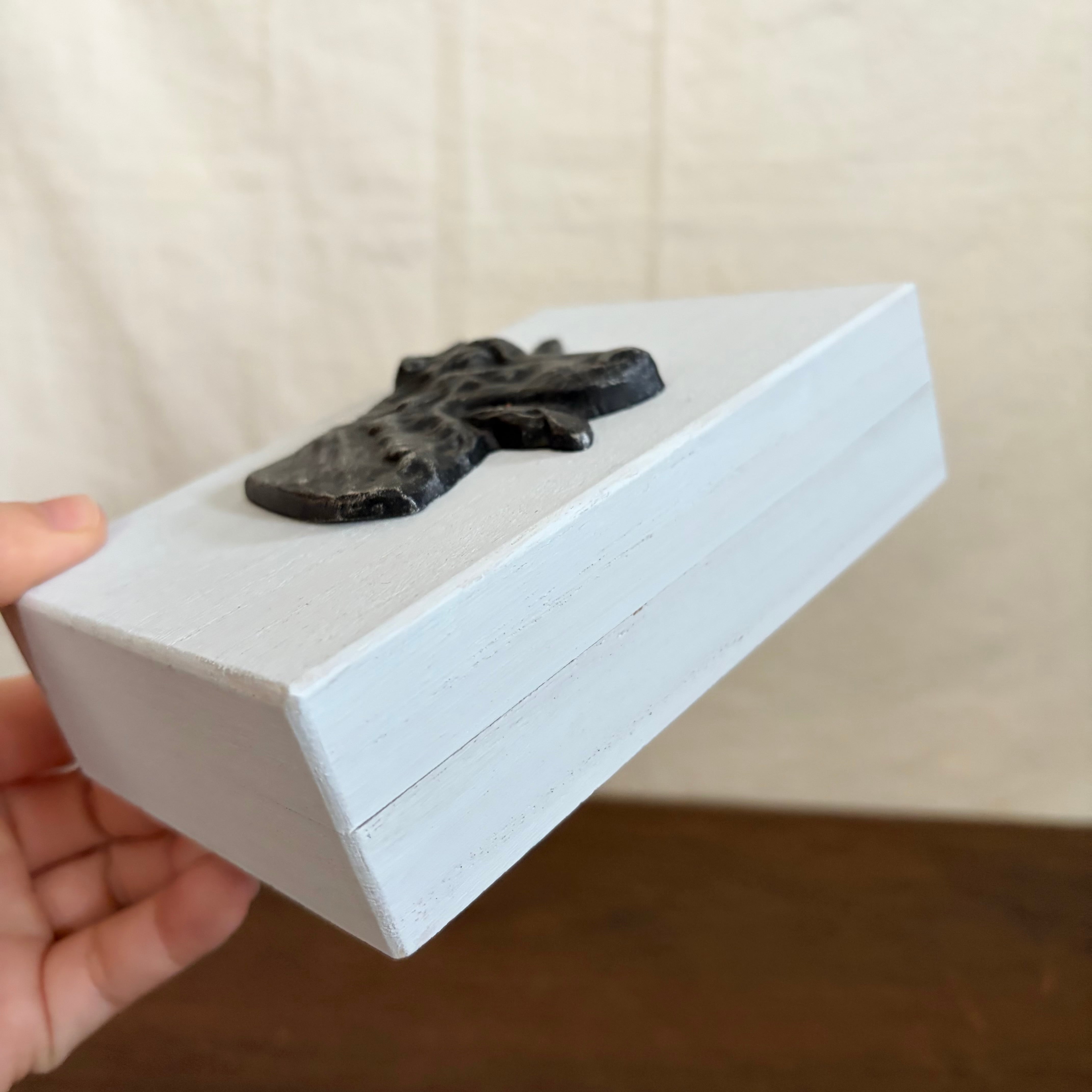 桐製の箱に薄いブルーを塗り、その上にドイツで見つけた金属製の犬の顔を乗せました。