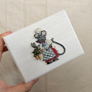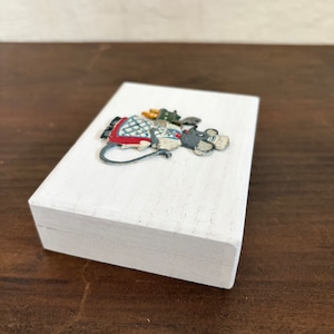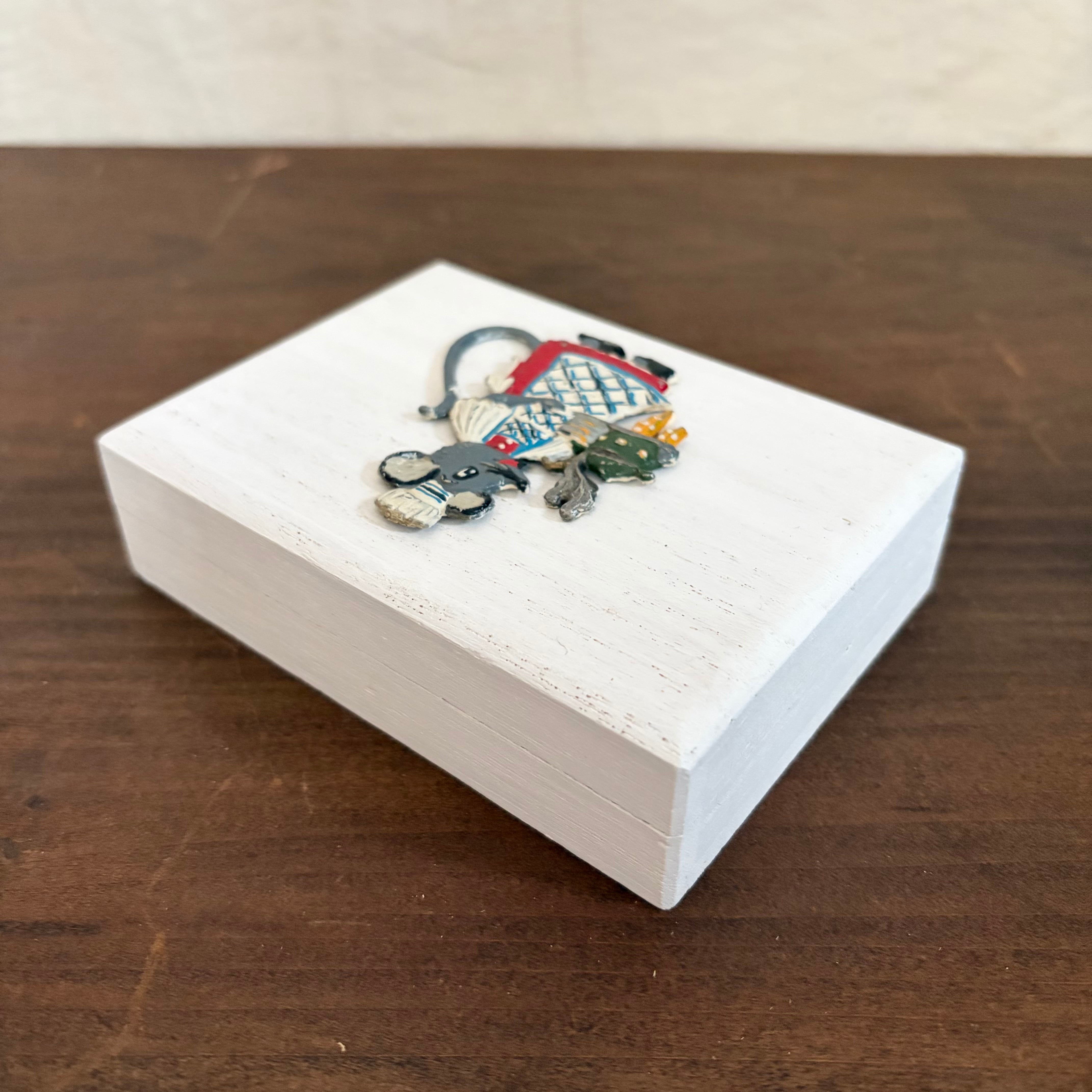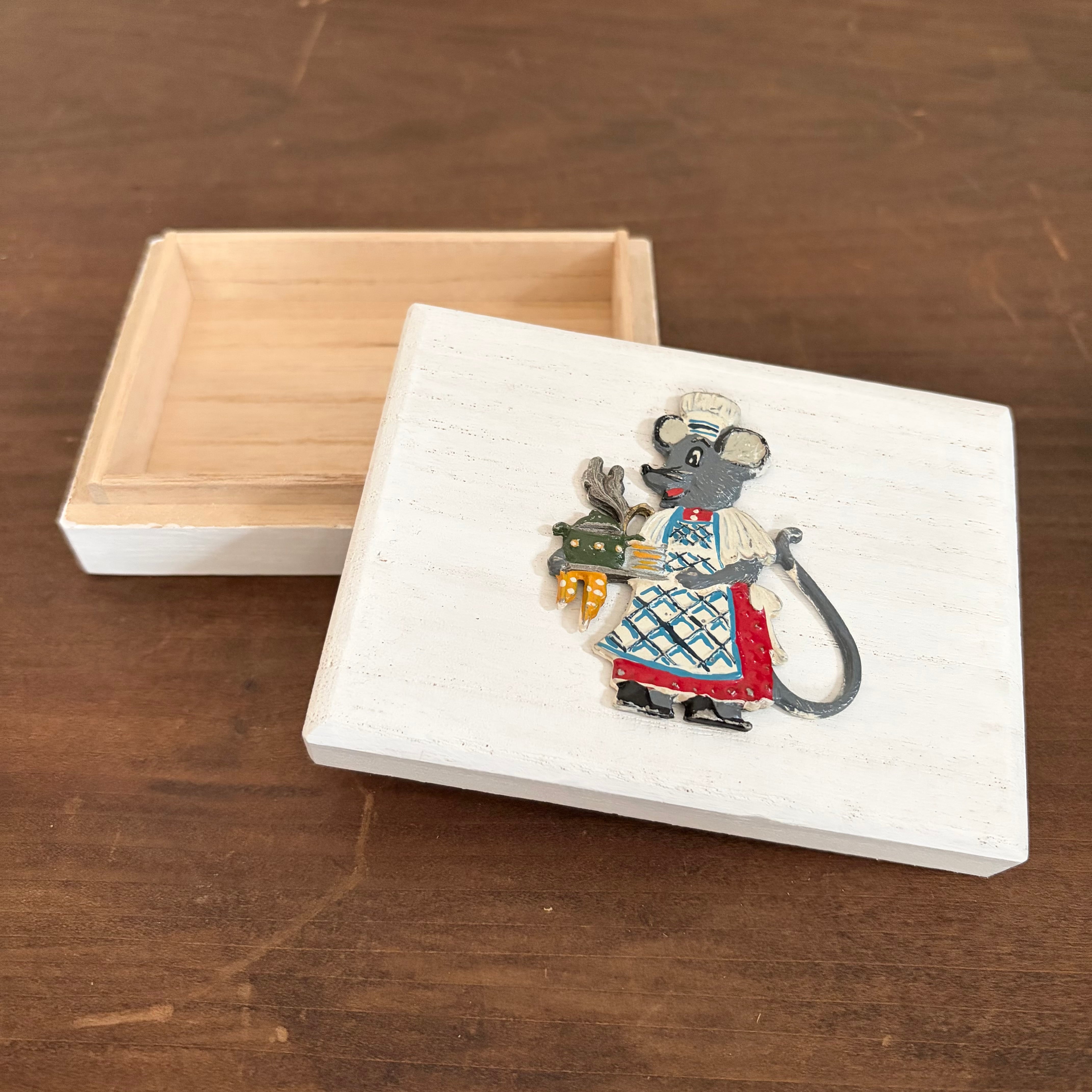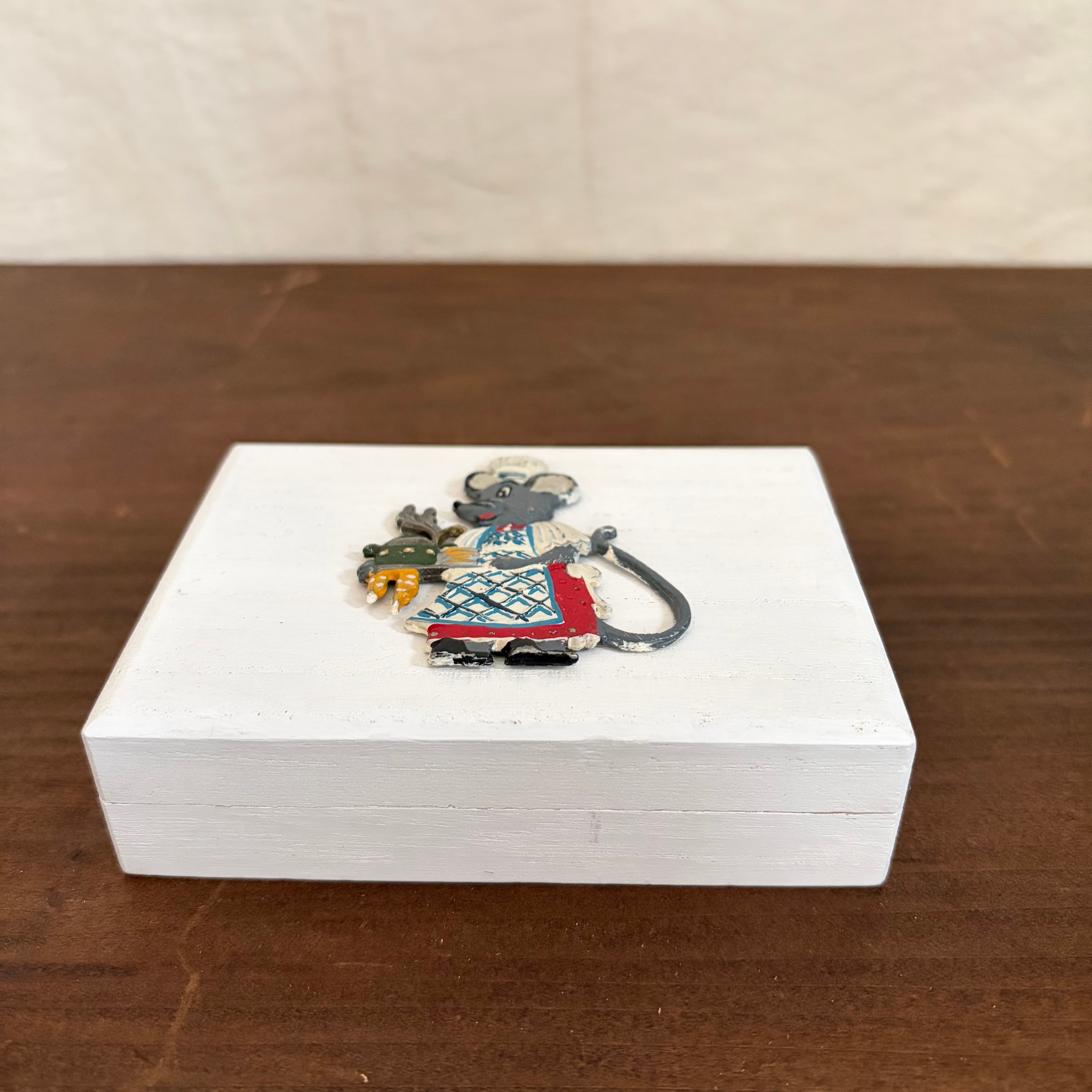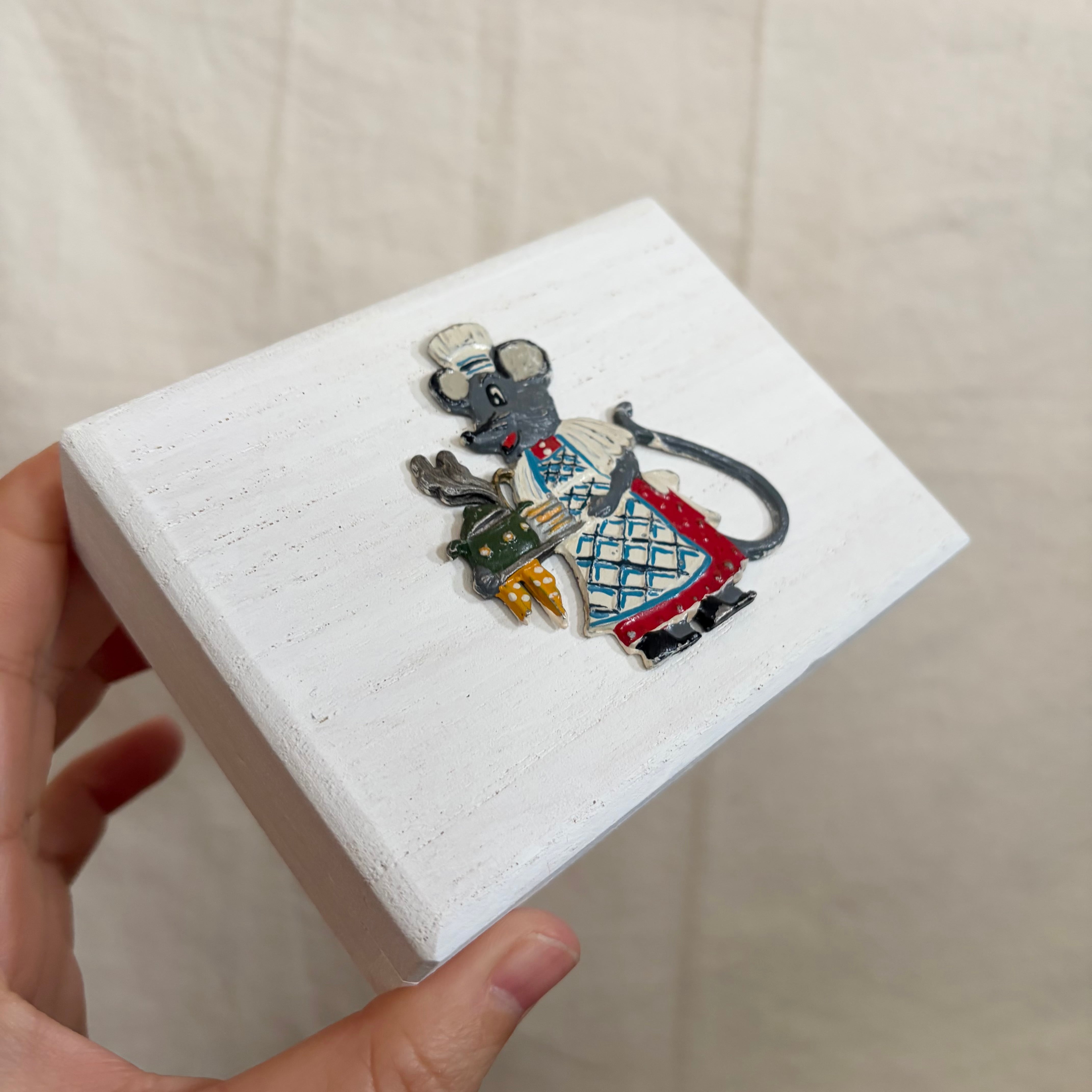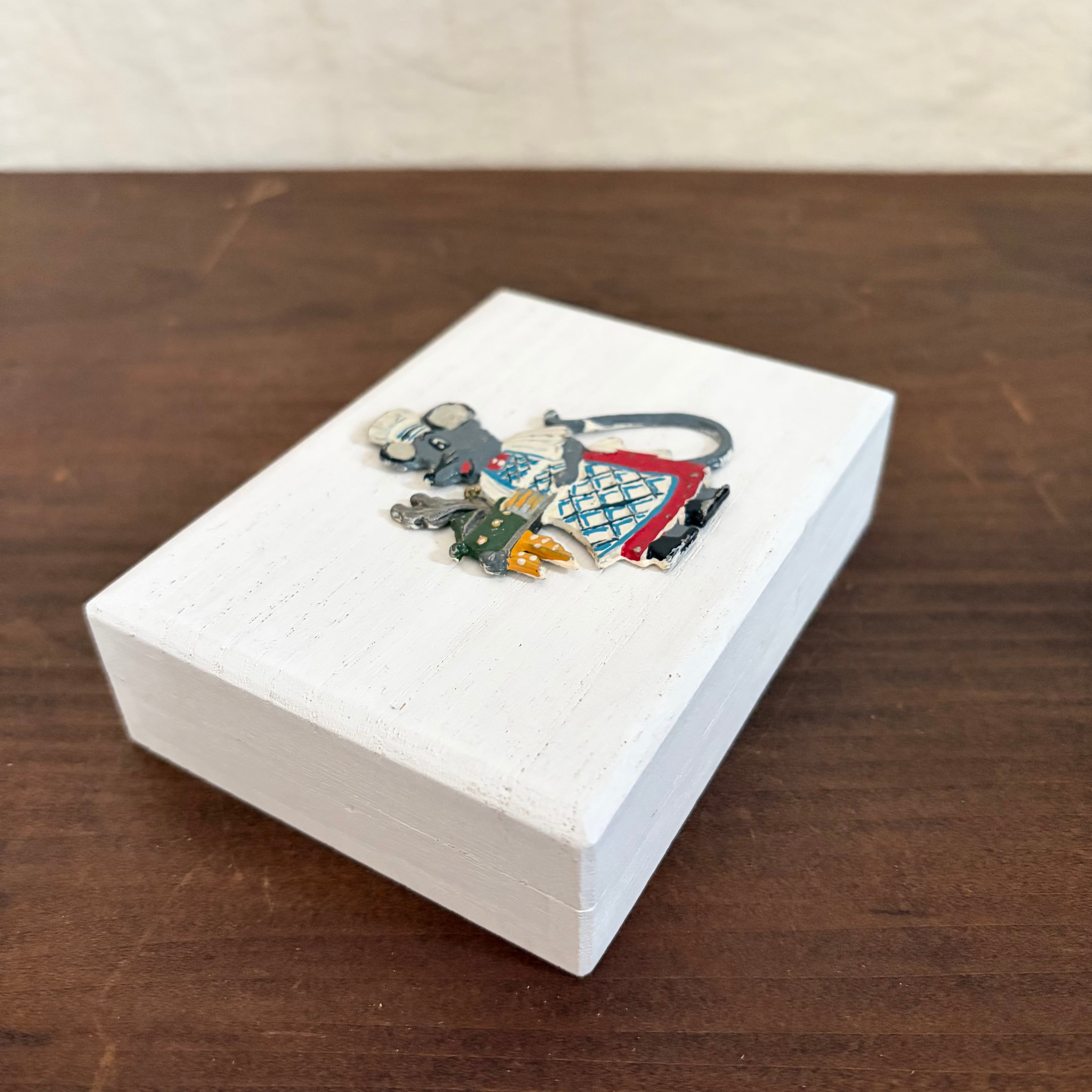 桐製の箱に白色を塗り、その上にドイツで見つけたピューター製のネズミを乗せました。