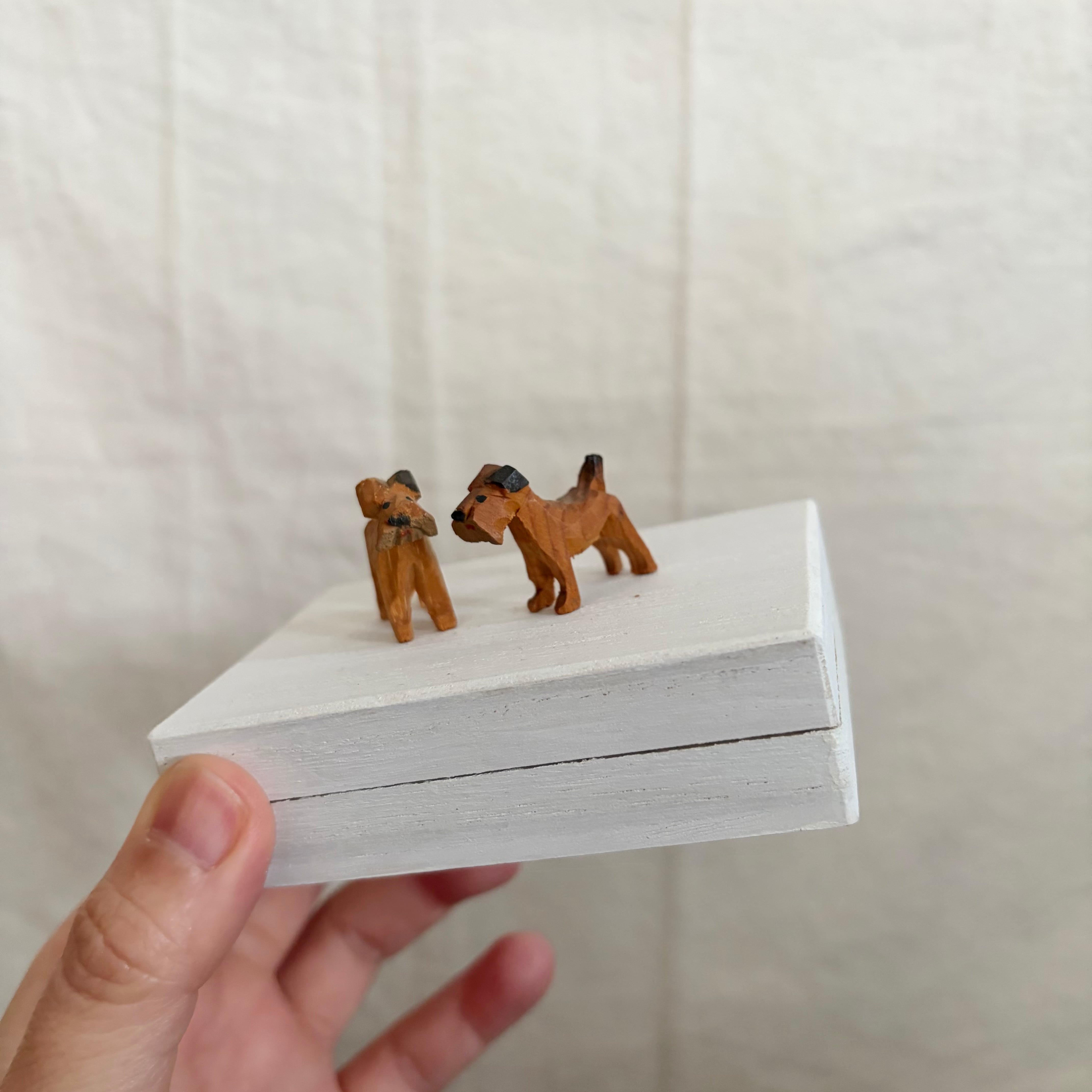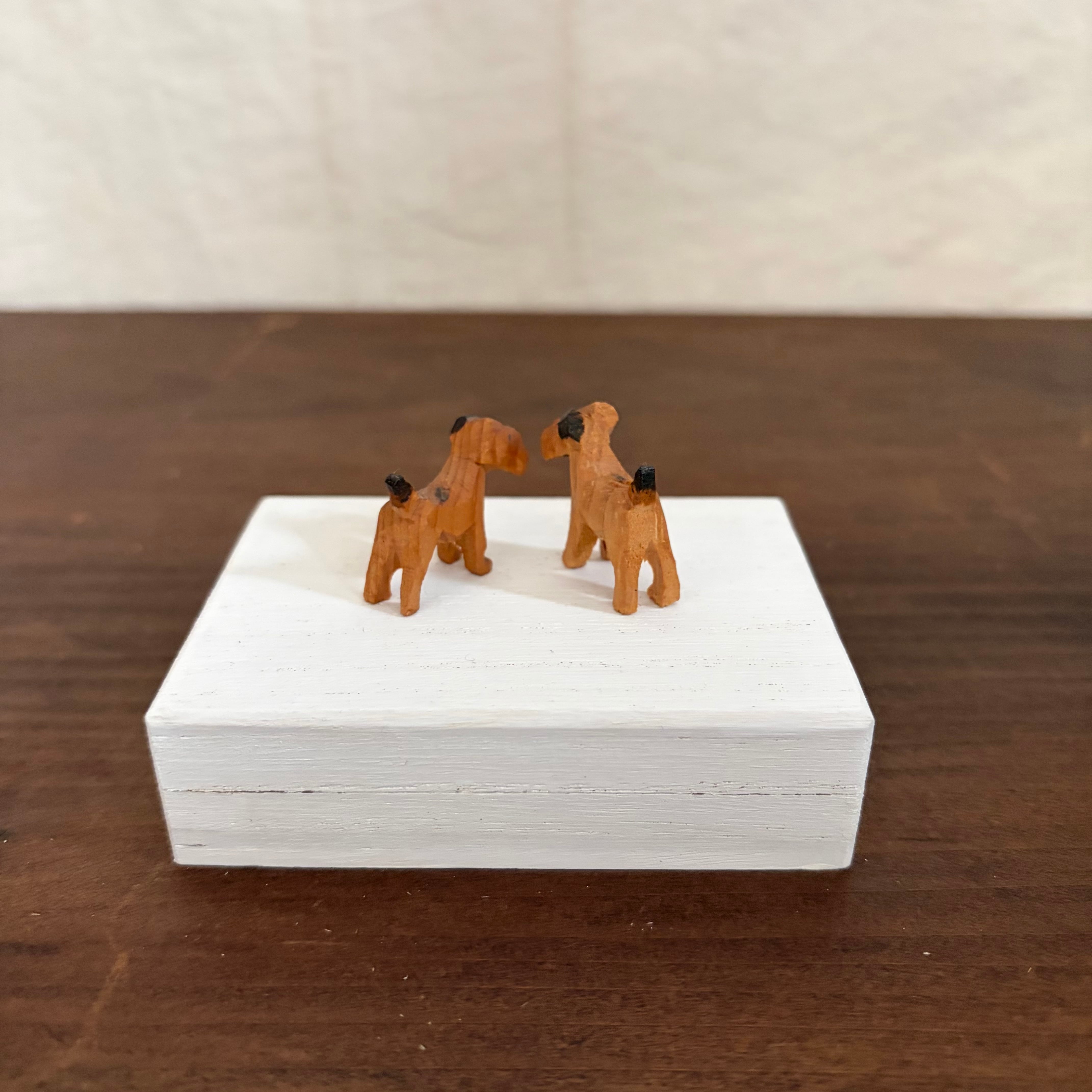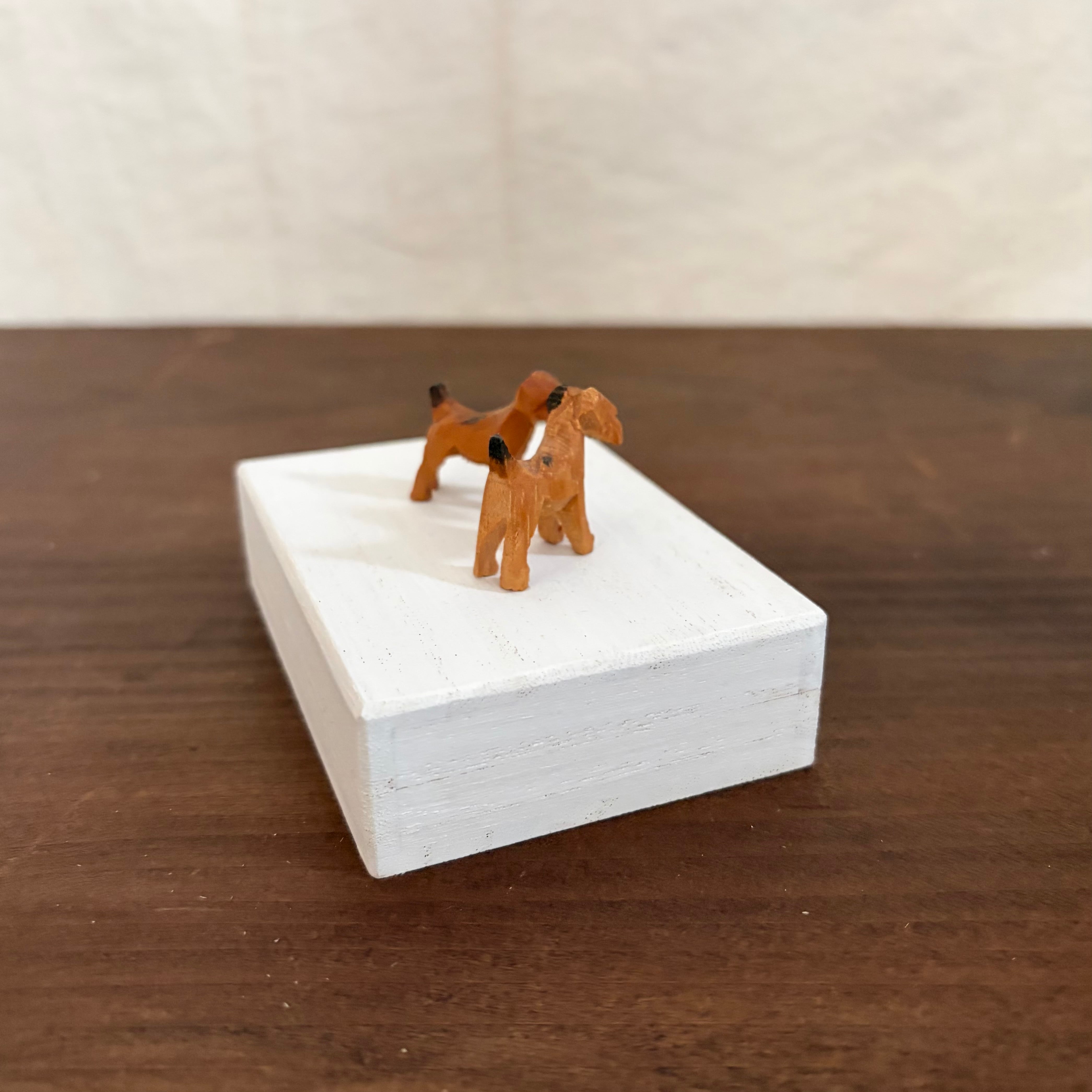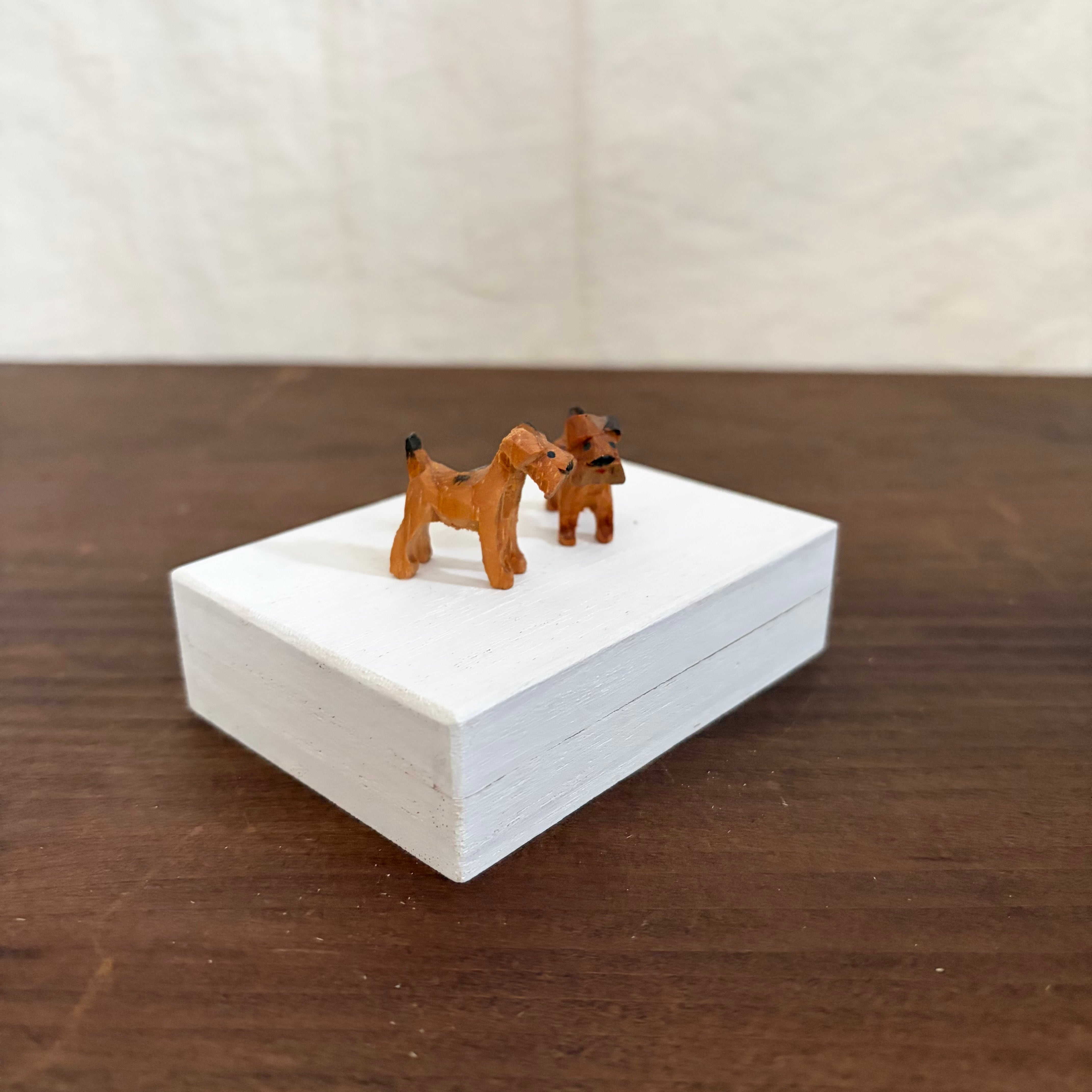 桐製の箱に白色を塗り、その上にドイツで見つけた木製の犬を2匹乗せました。