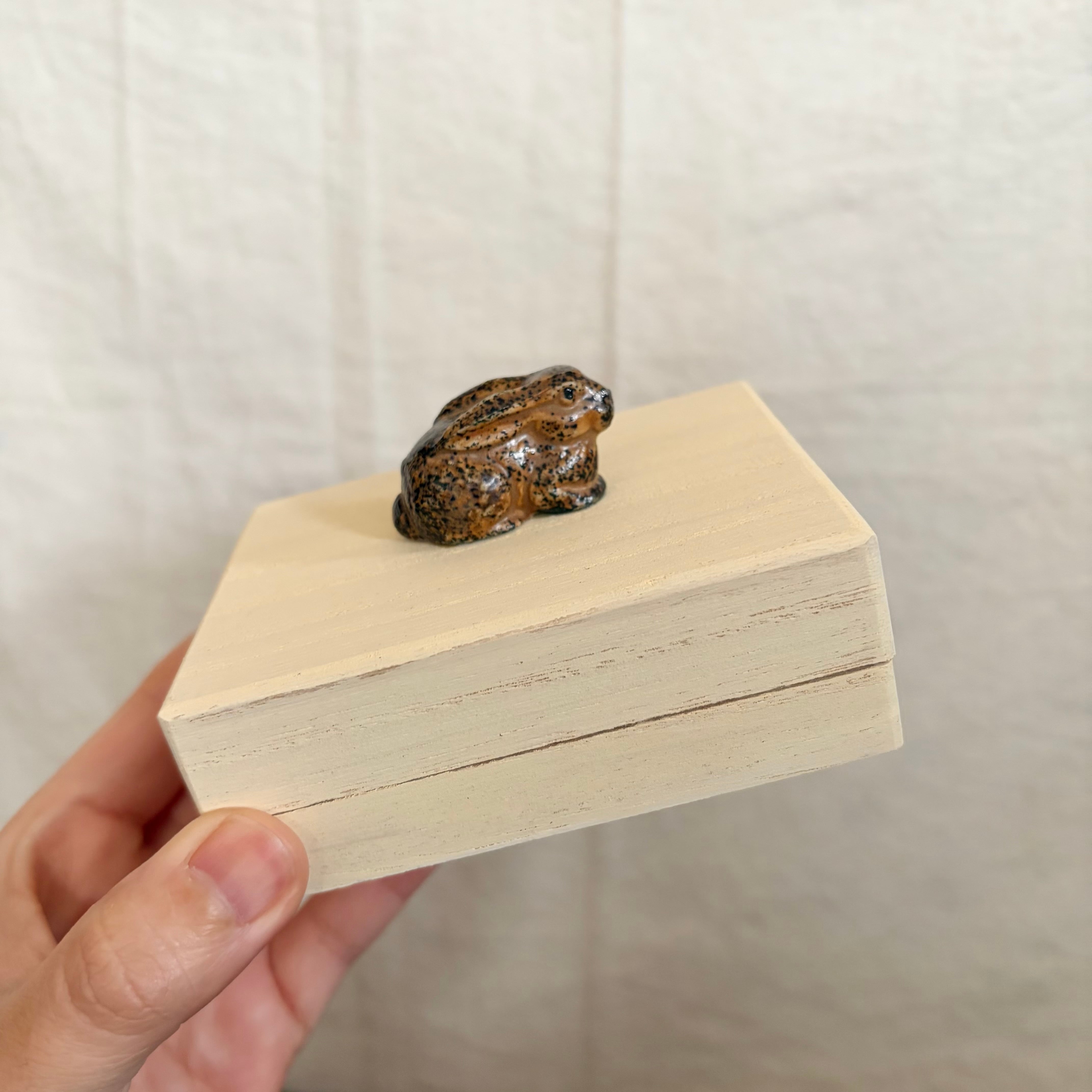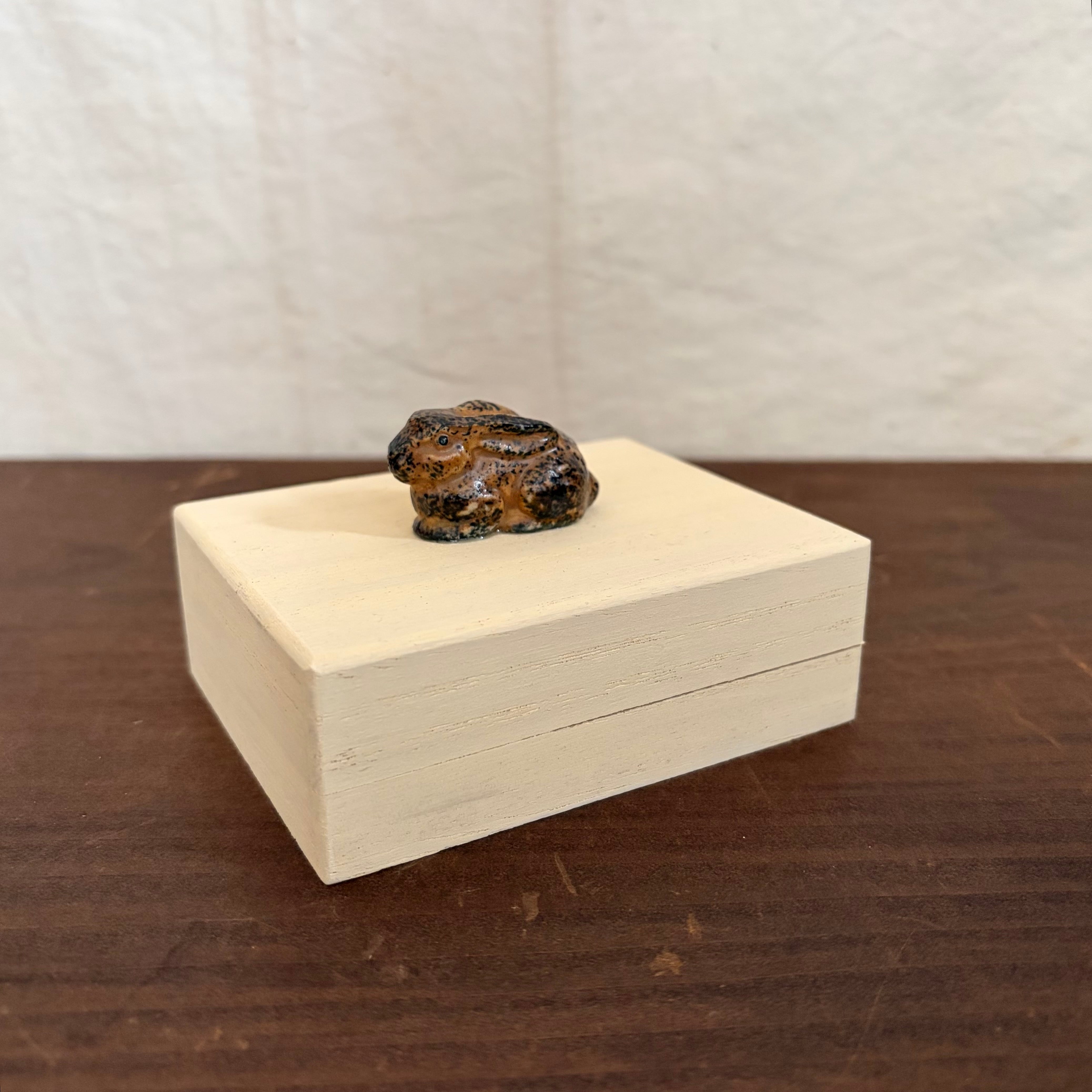 桐製の箱にベージュ色を塗り、その上にオランダで見つけた陶器製のウサギを乗せました。