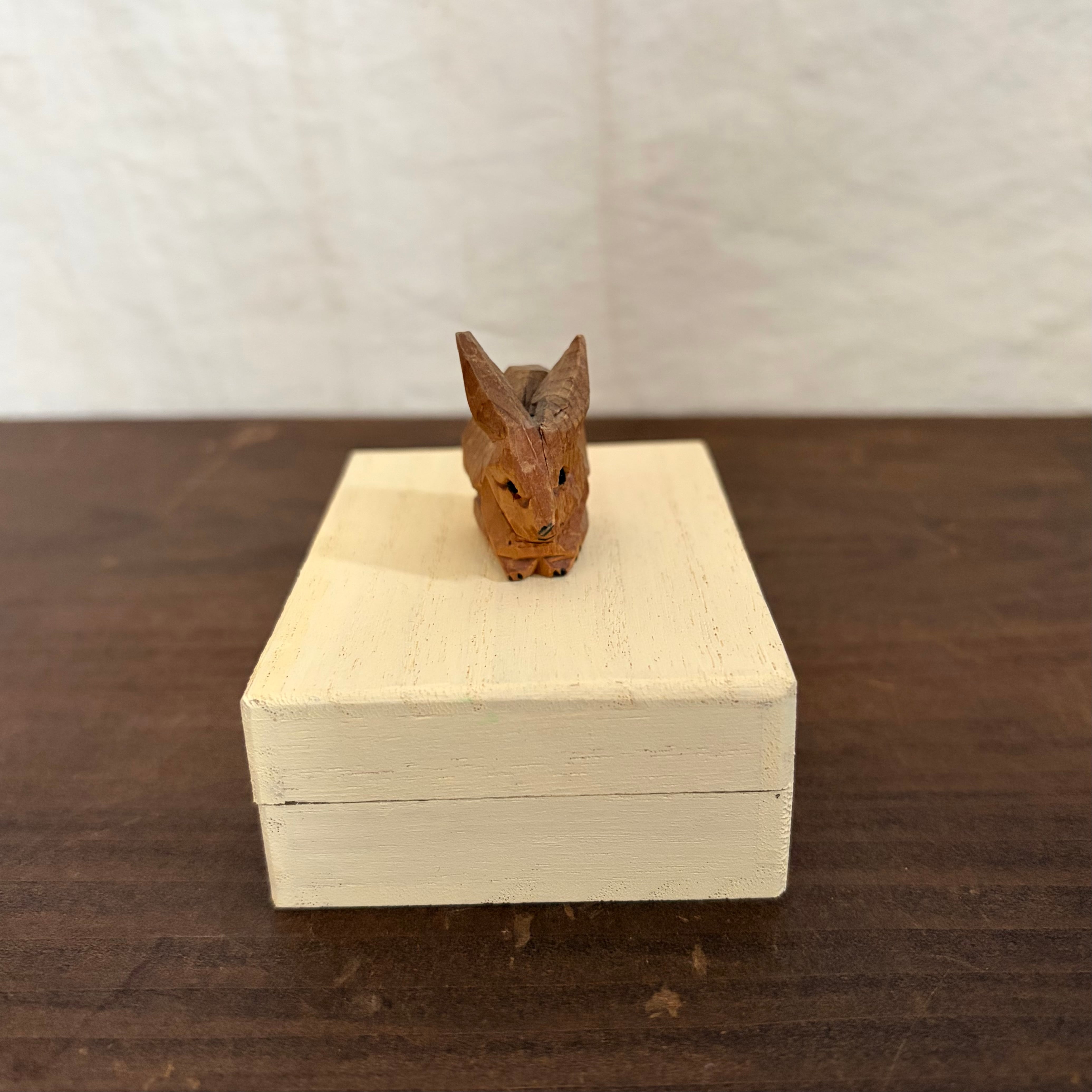桐製の箱にベージュ色を塗り、その上にオランダで見つけた木彫りのウサギを乗せました。