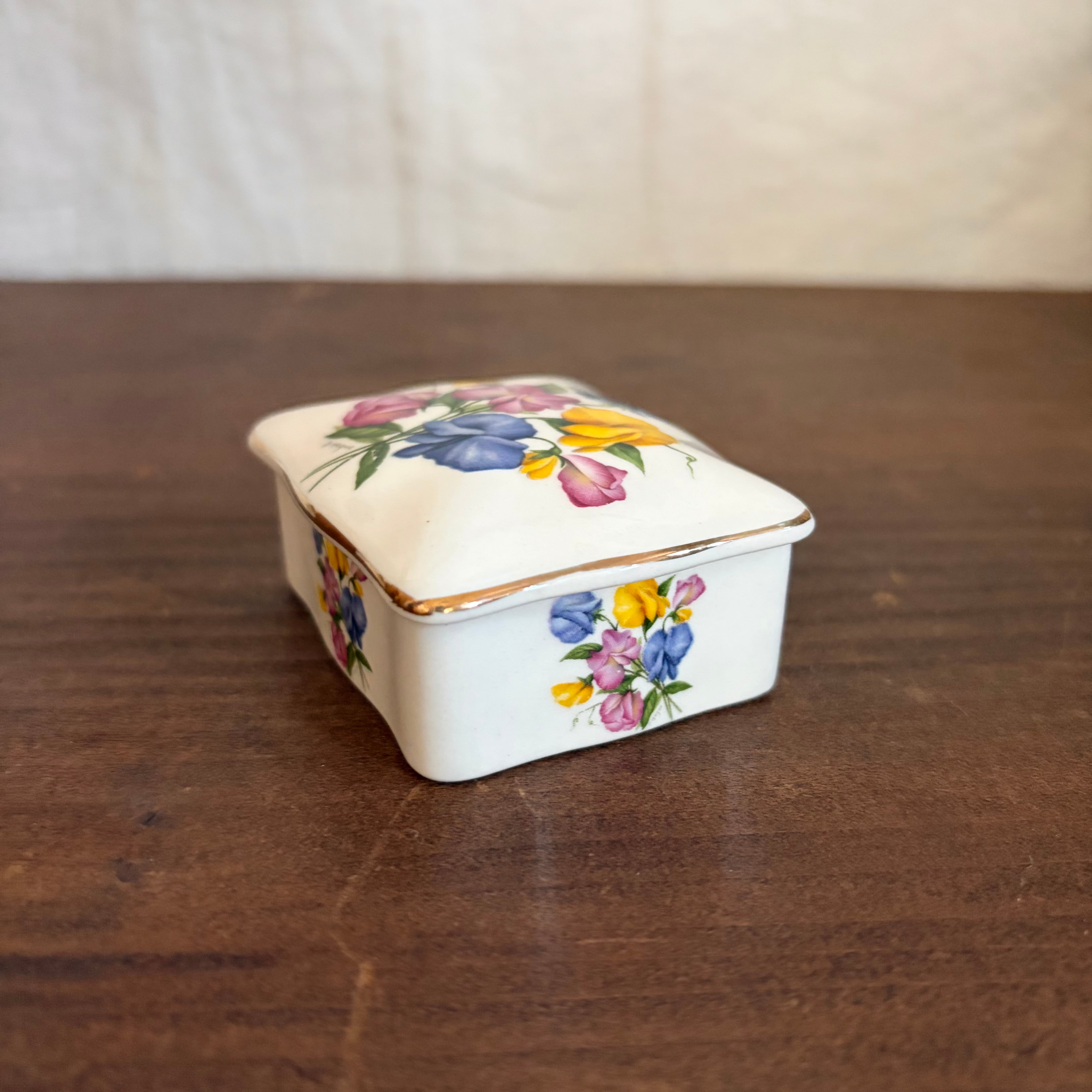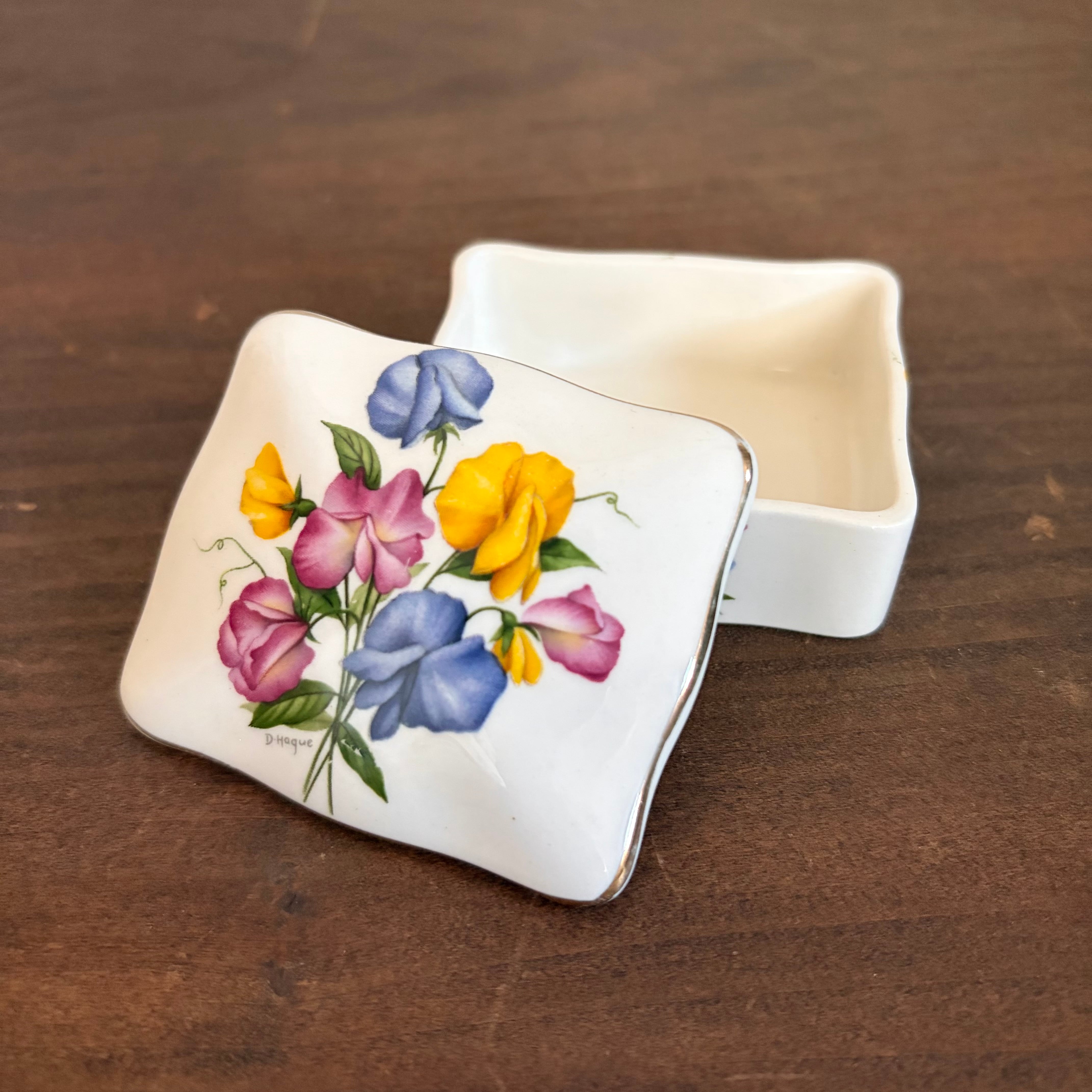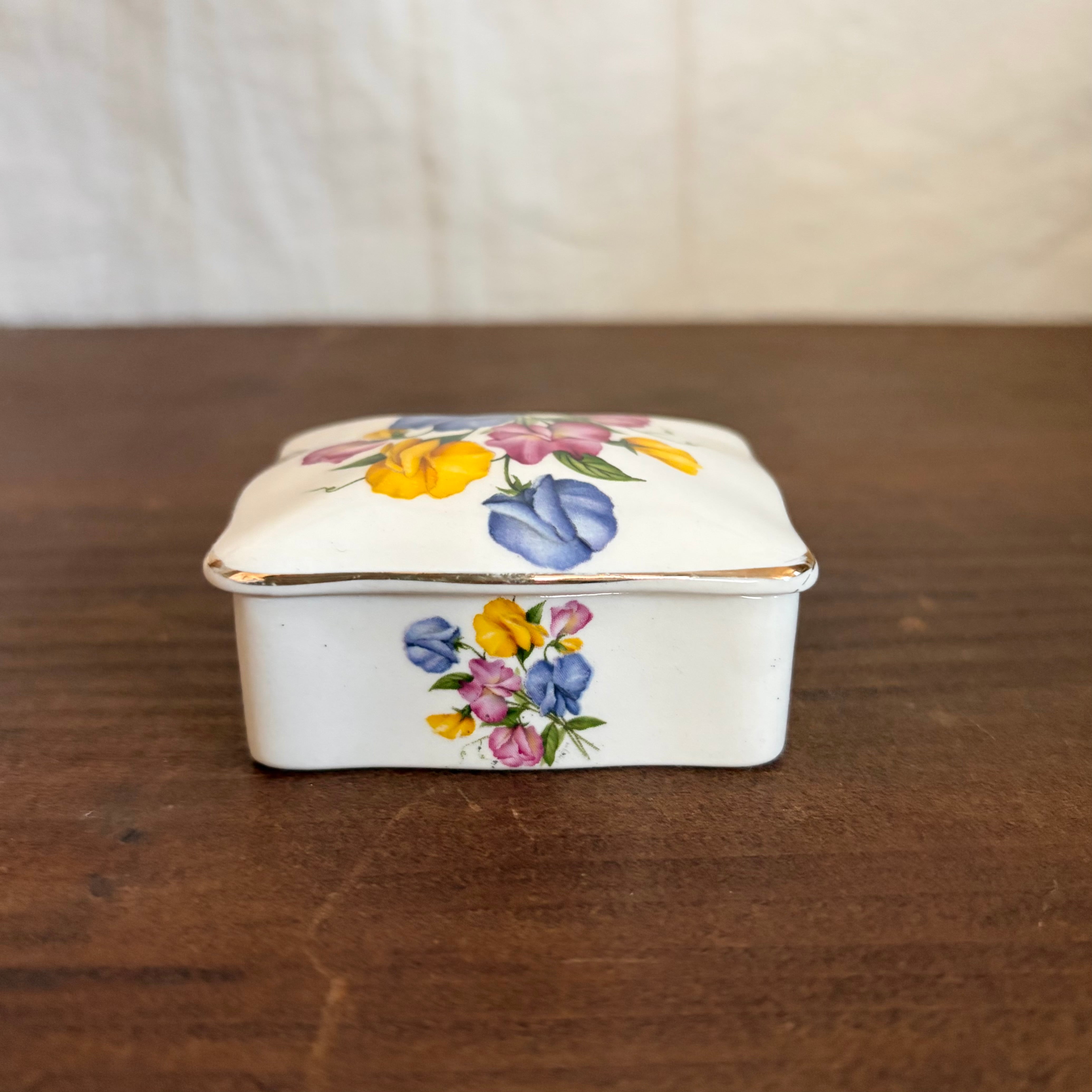 リントンズという紅茶メーカーの蓋つきの入れ物は、小さいけど蓋と側面にスイートピーの花たちが表現されていてすごく華やかです。