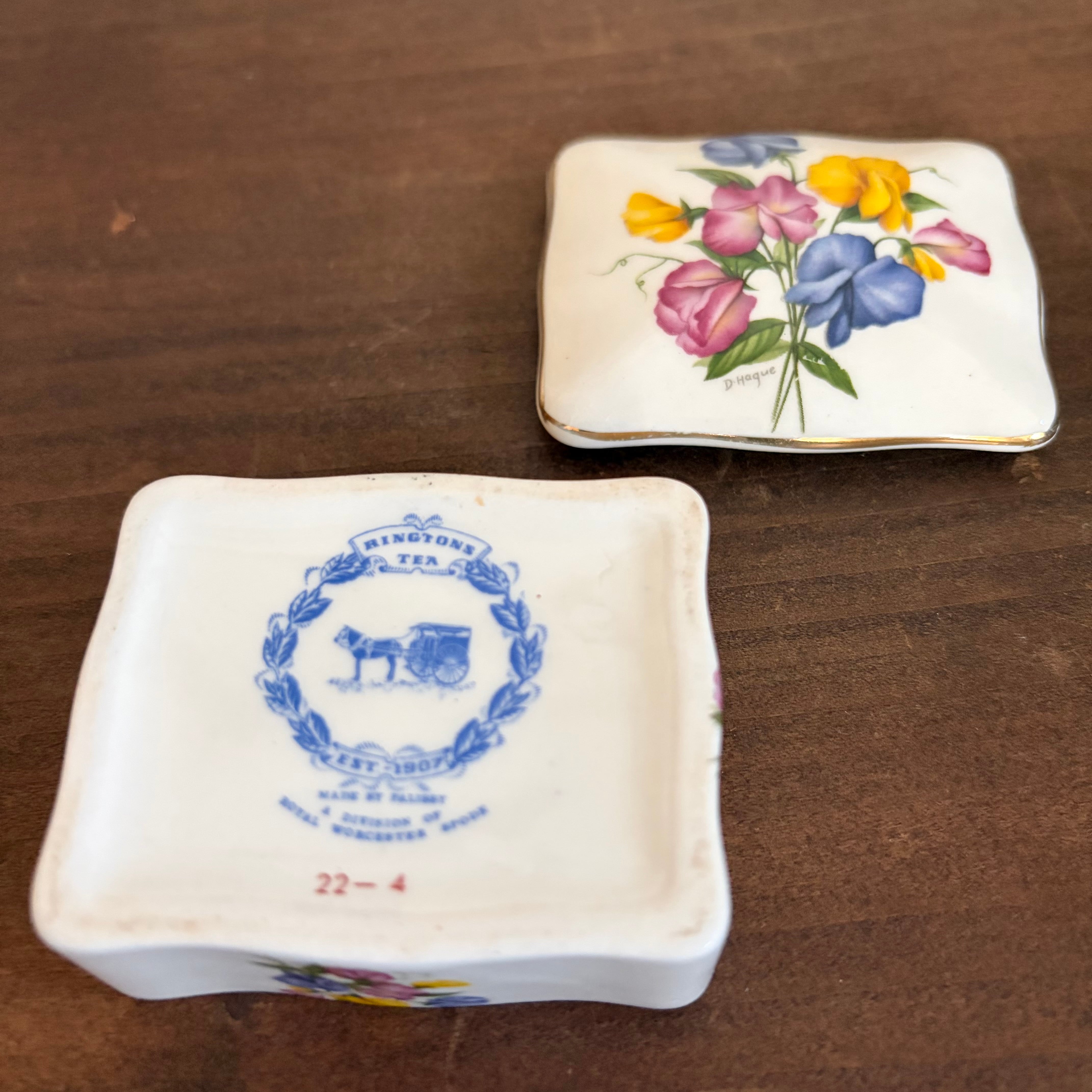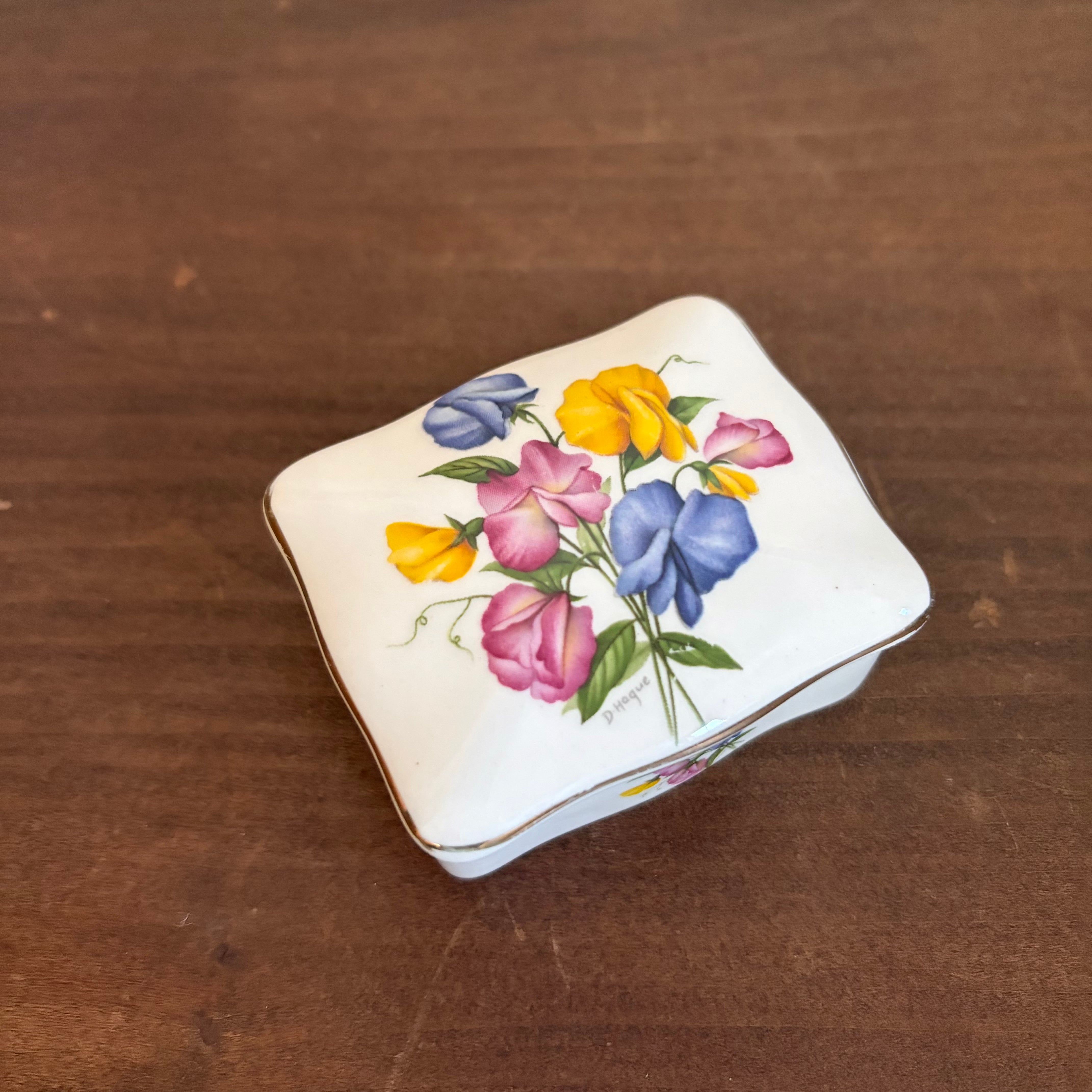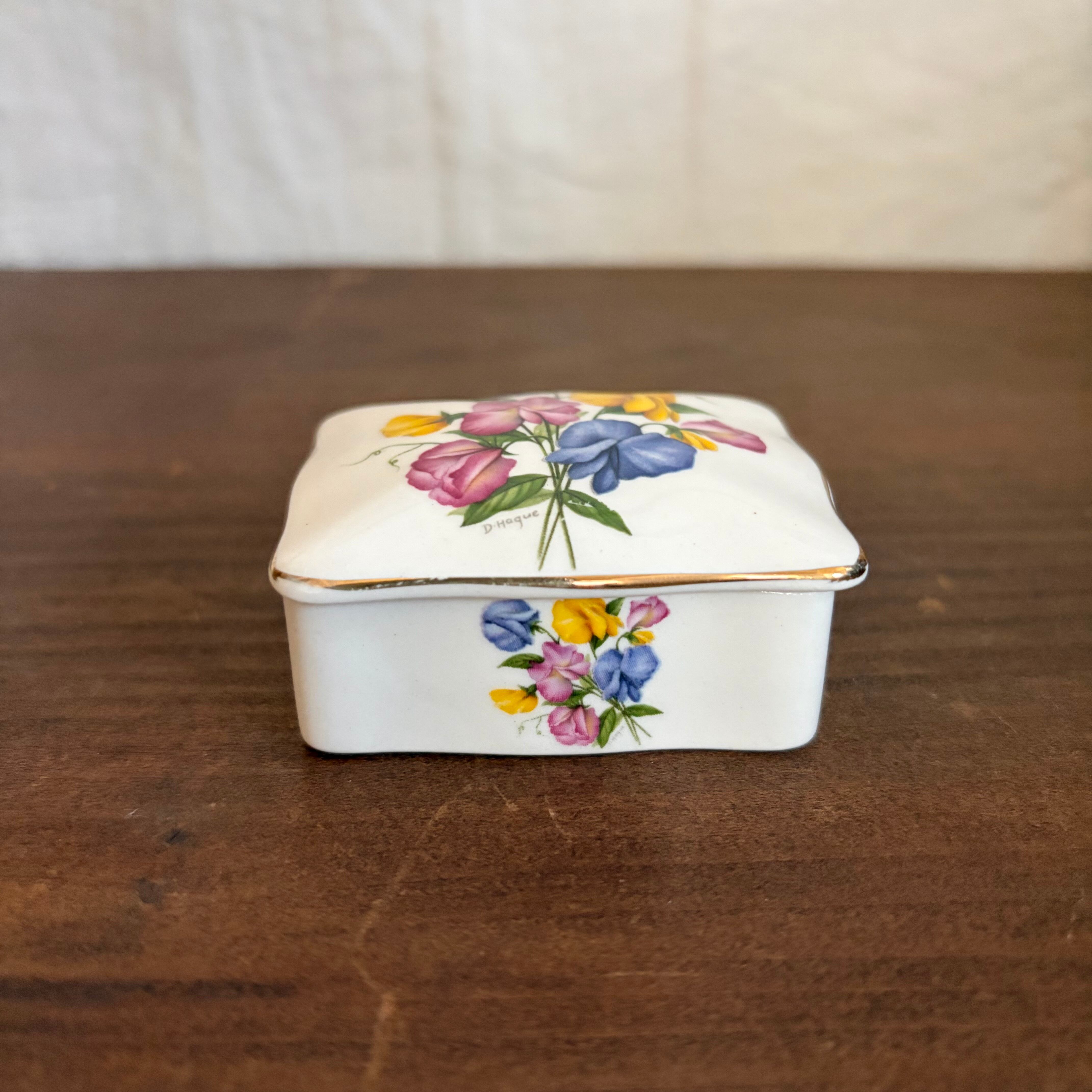 リントンズという紅茶メーカーの蓋つきの入れ物は、小さいけど蓋と側面にスイートピーの花たちが表現されていてすごく華やかです。