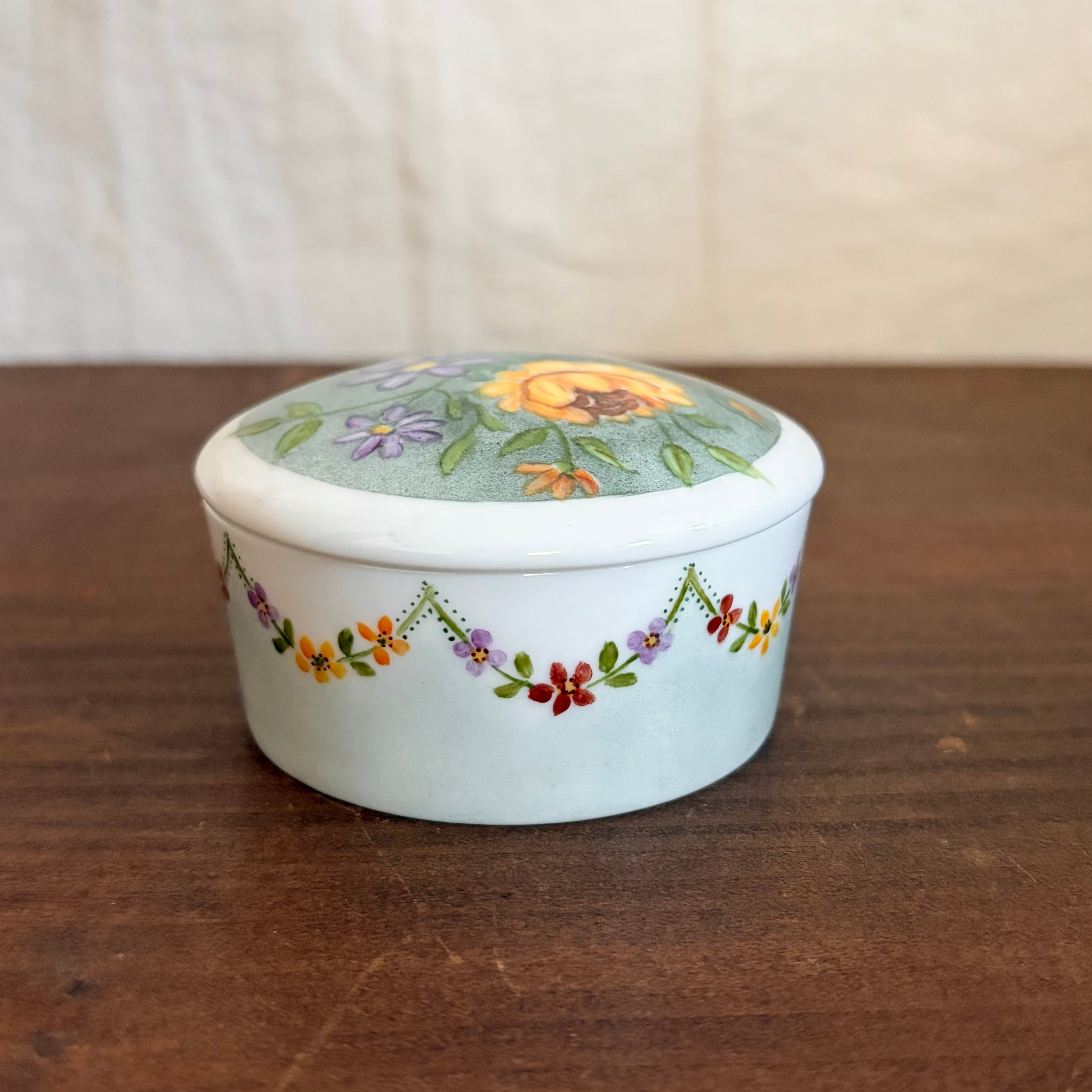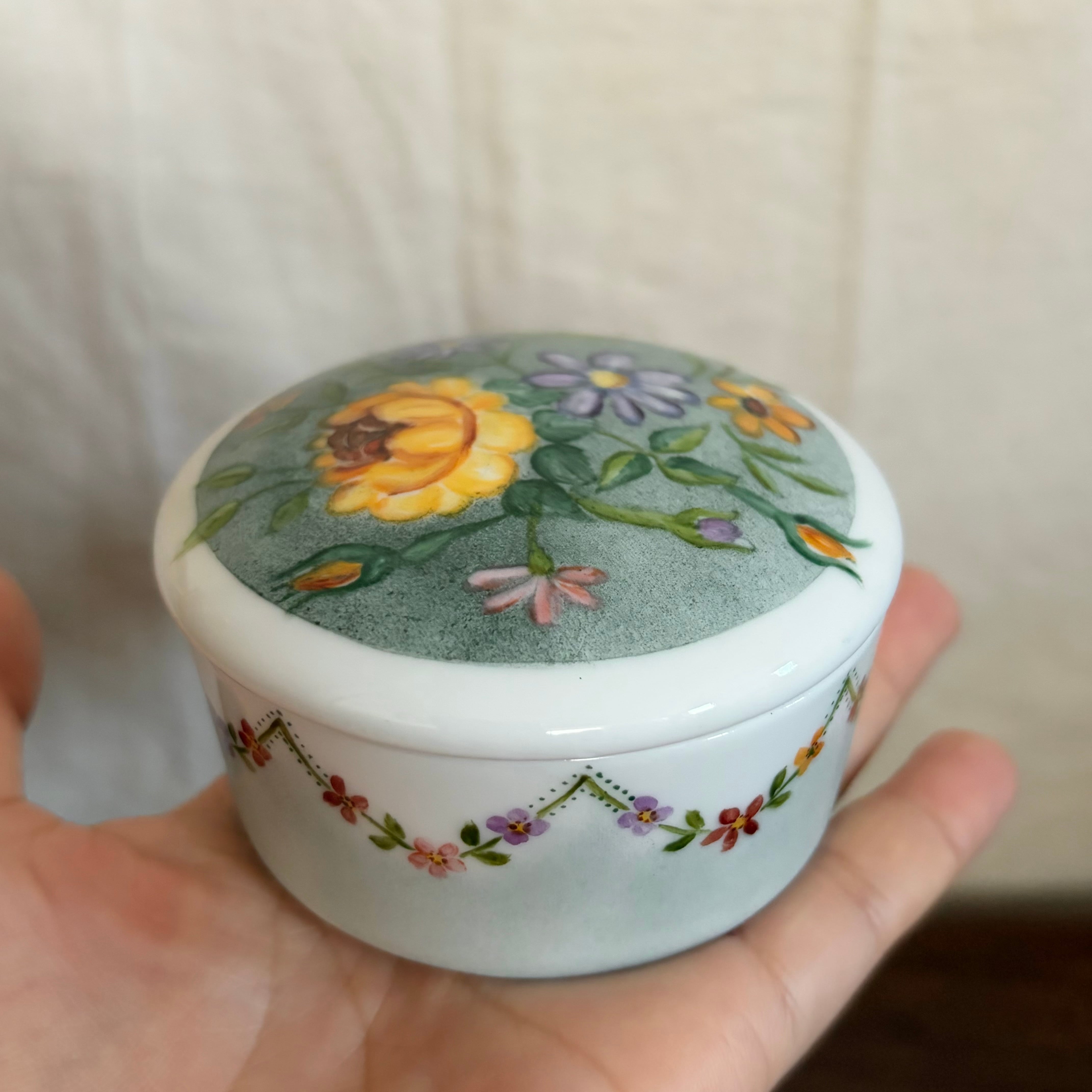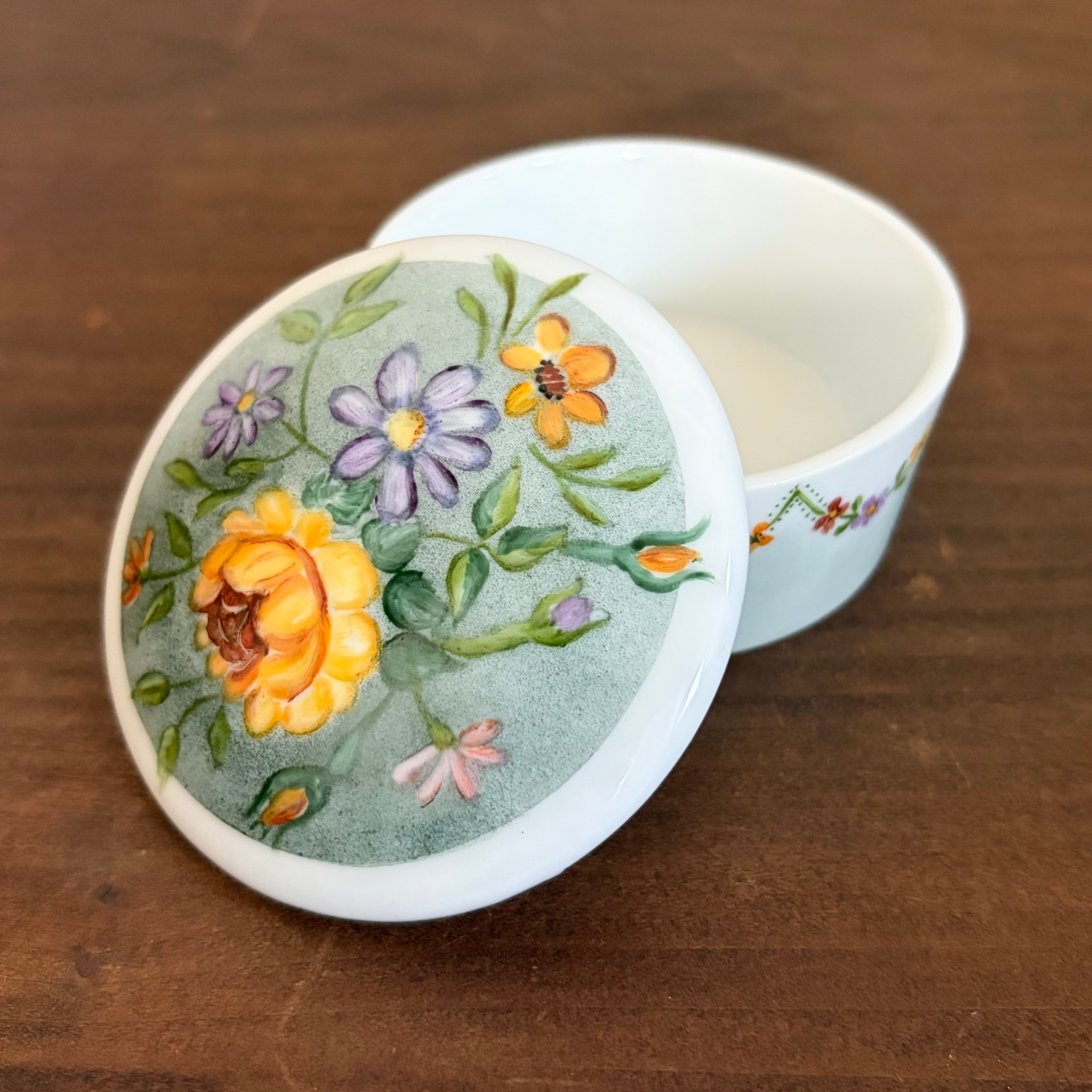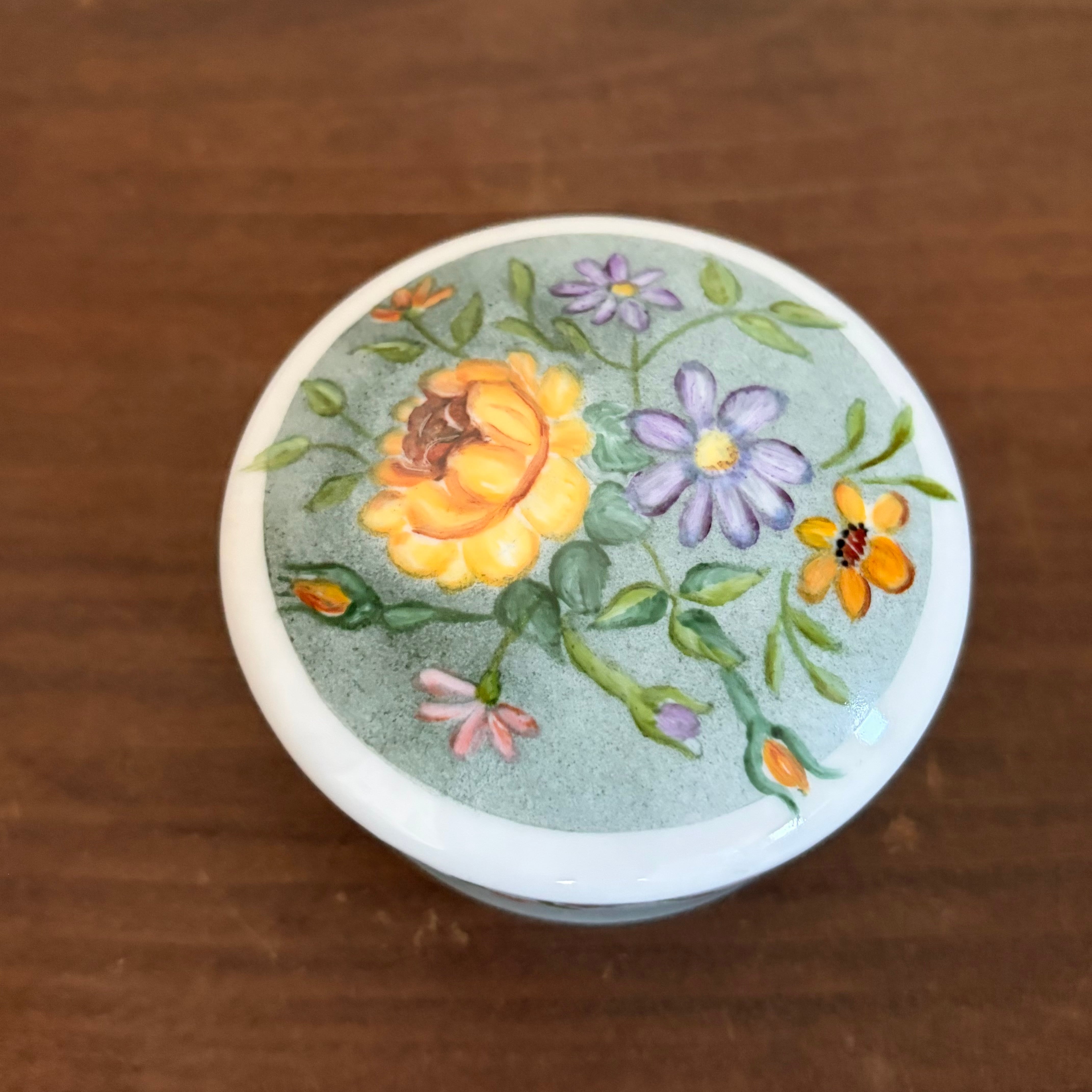 蓋と側面に手描きで花たちが描かれたいれものです。