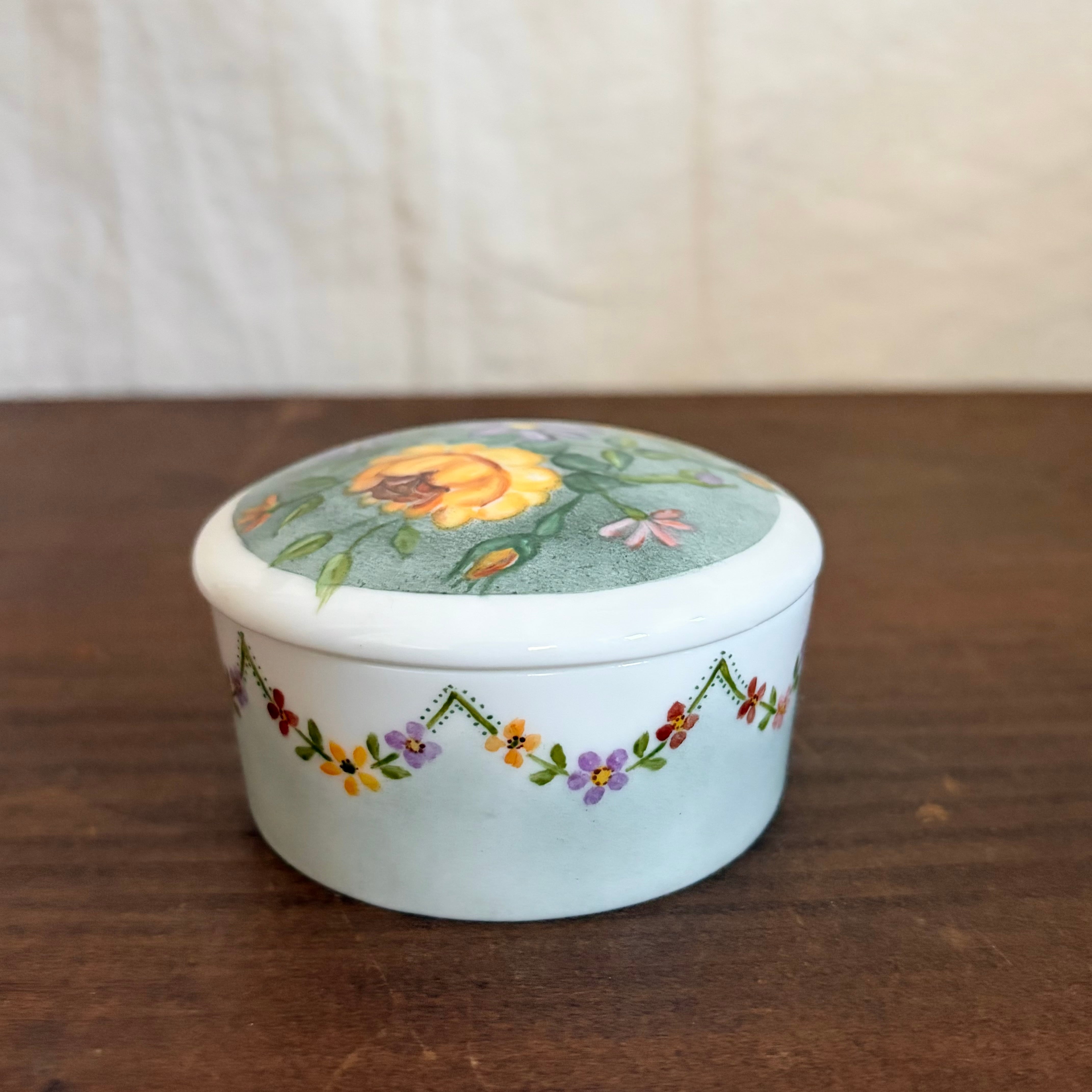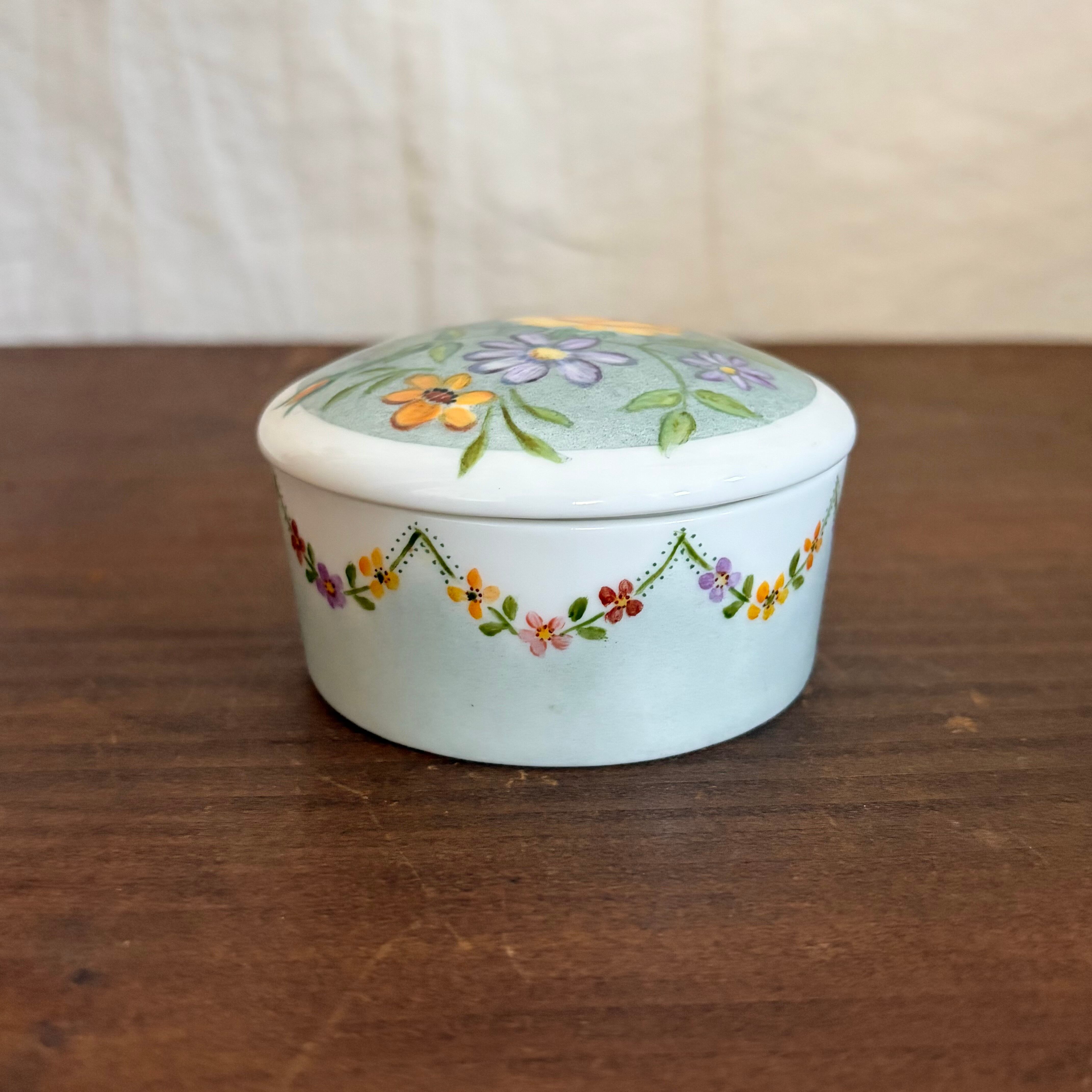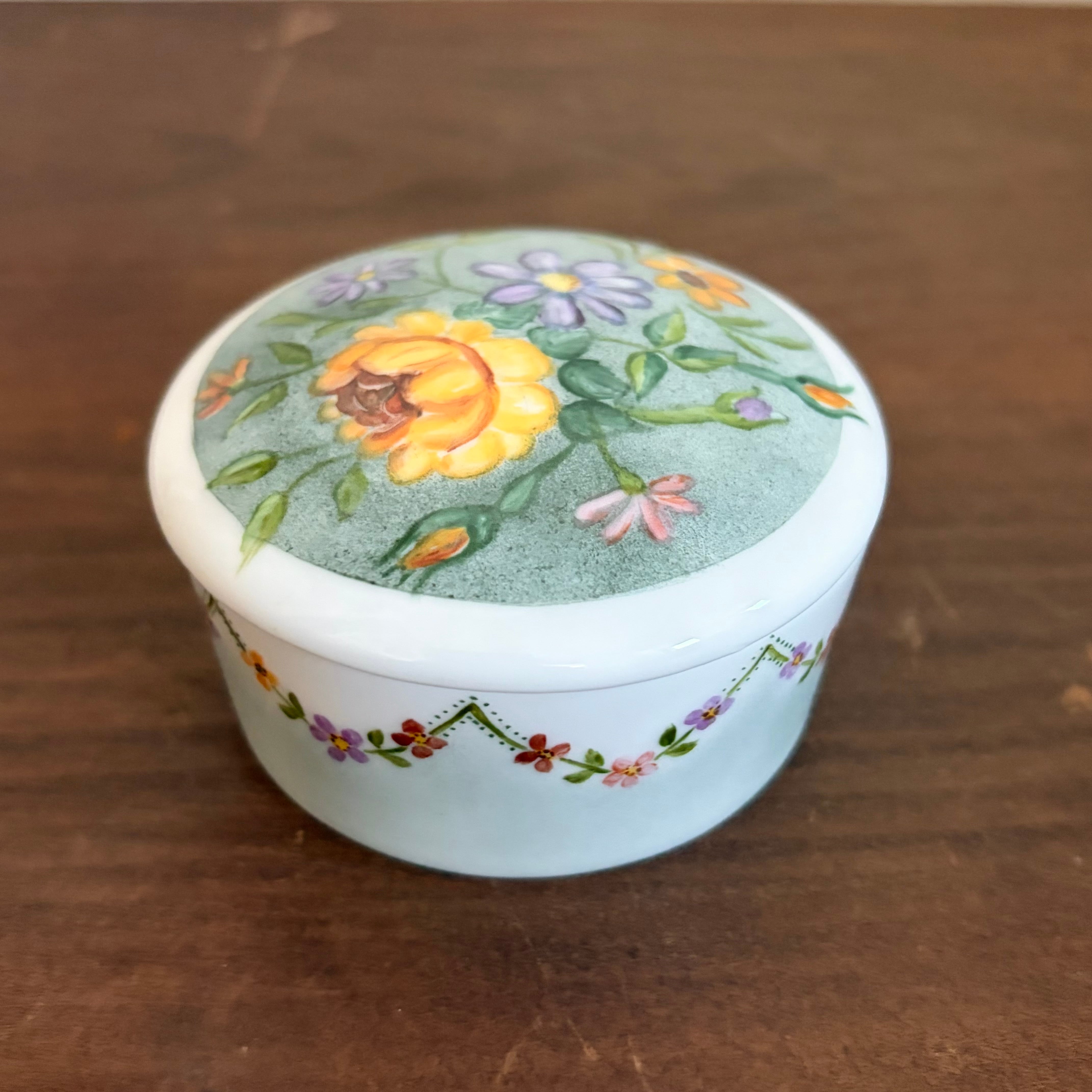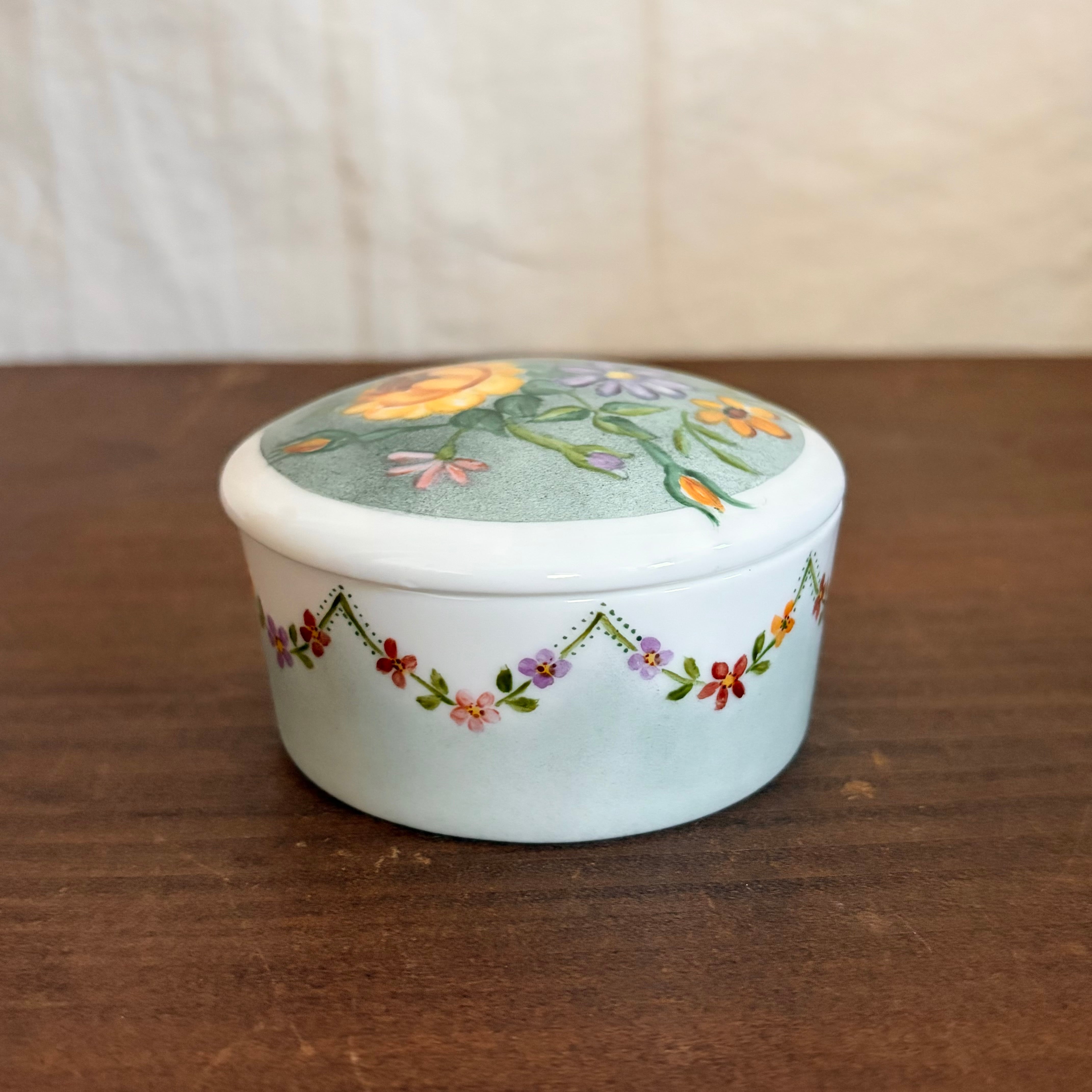 蓋と側面に手描きで花たちが描かれたいれものです。