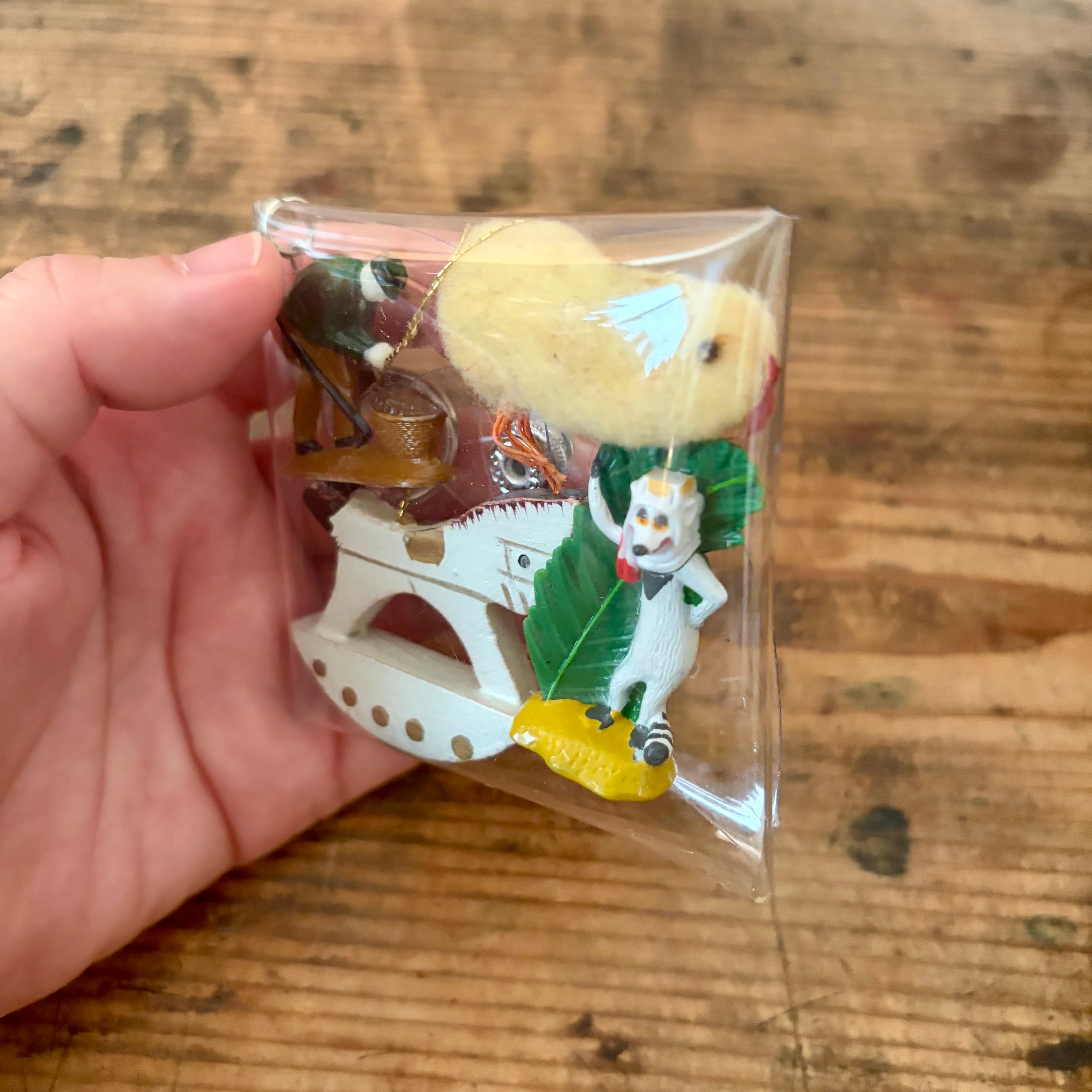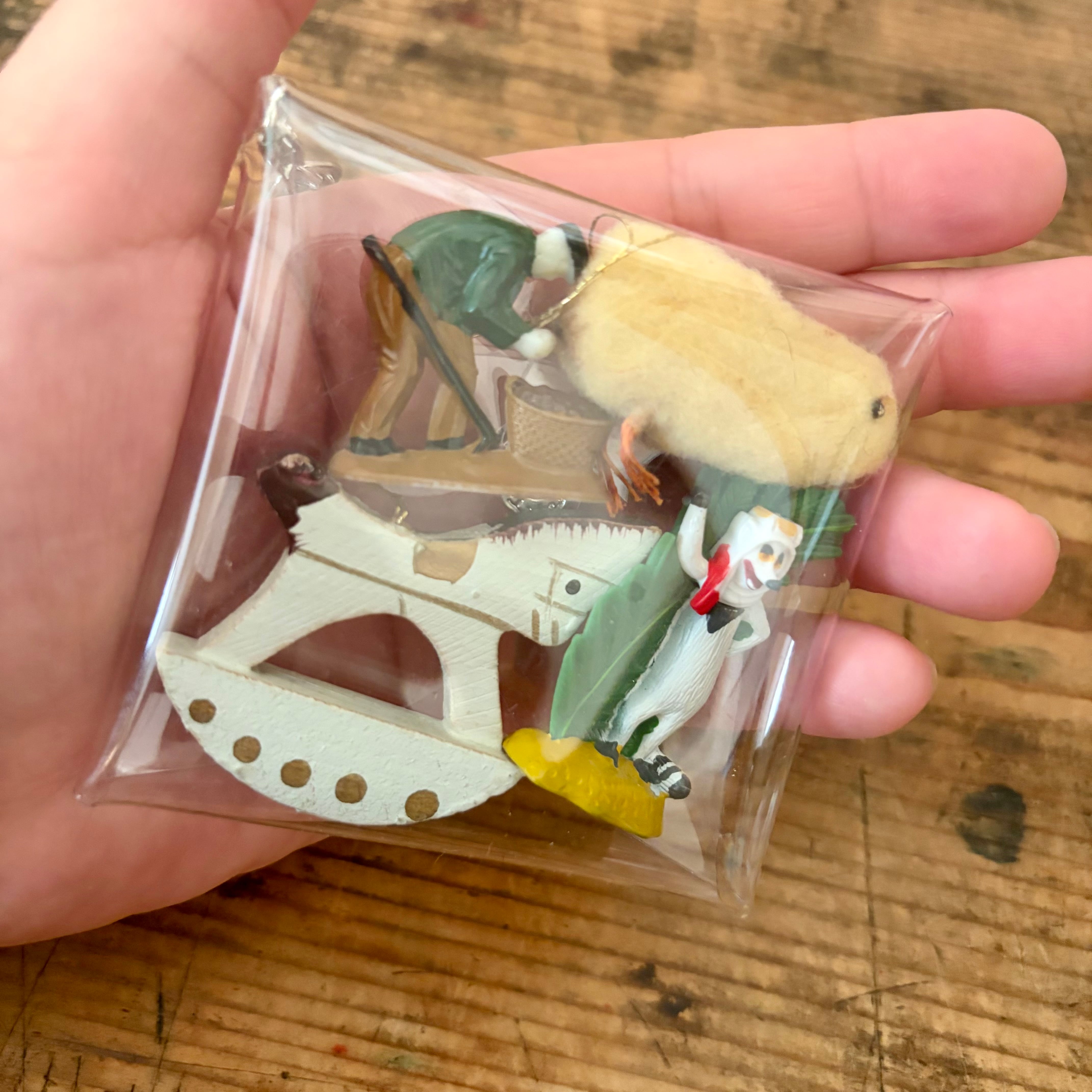 プラスチック製の謎の生き物とおじさん、フェルト製?のひよこ、木製の馬を詰め込みました。