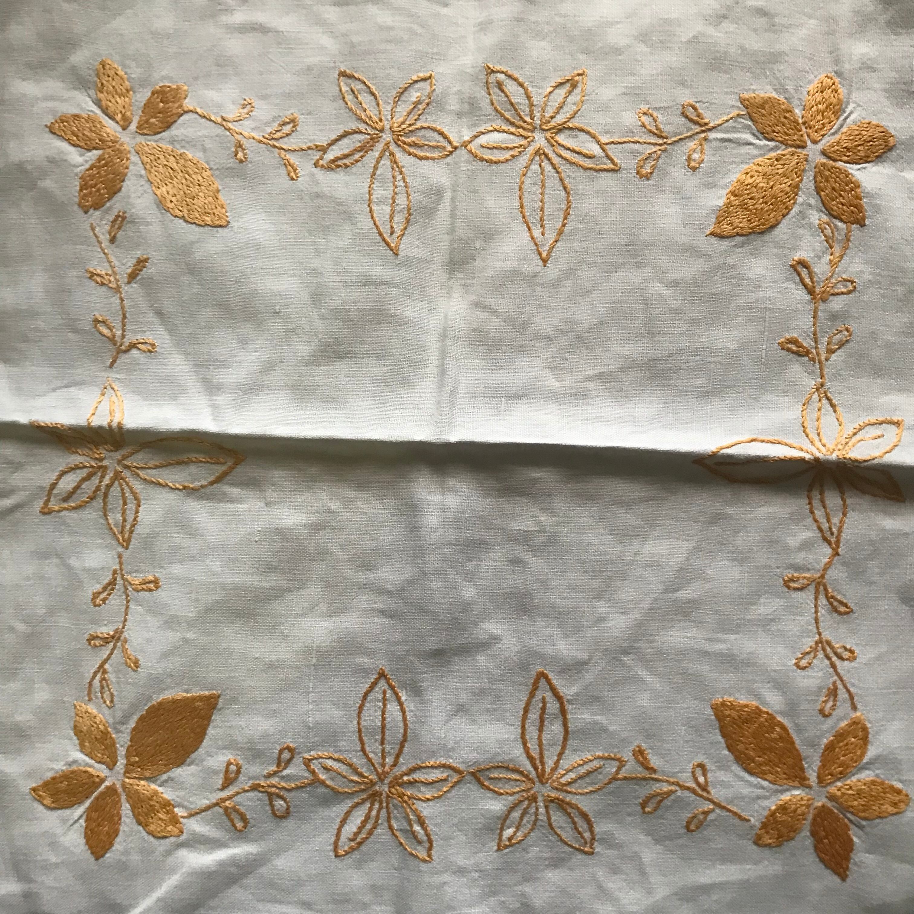スウェーデンで見つけた山吹色の糸で葉っぱが刺繍された布です。