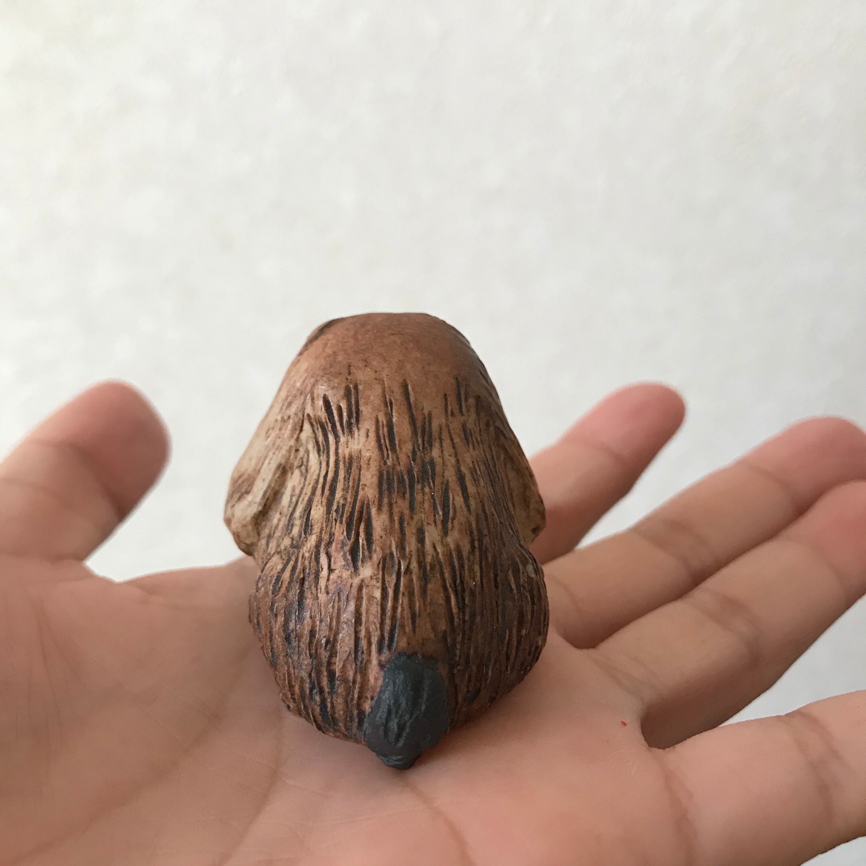 マットな陶器の犬は耳の長さとふっくらしたボディが特徴です。