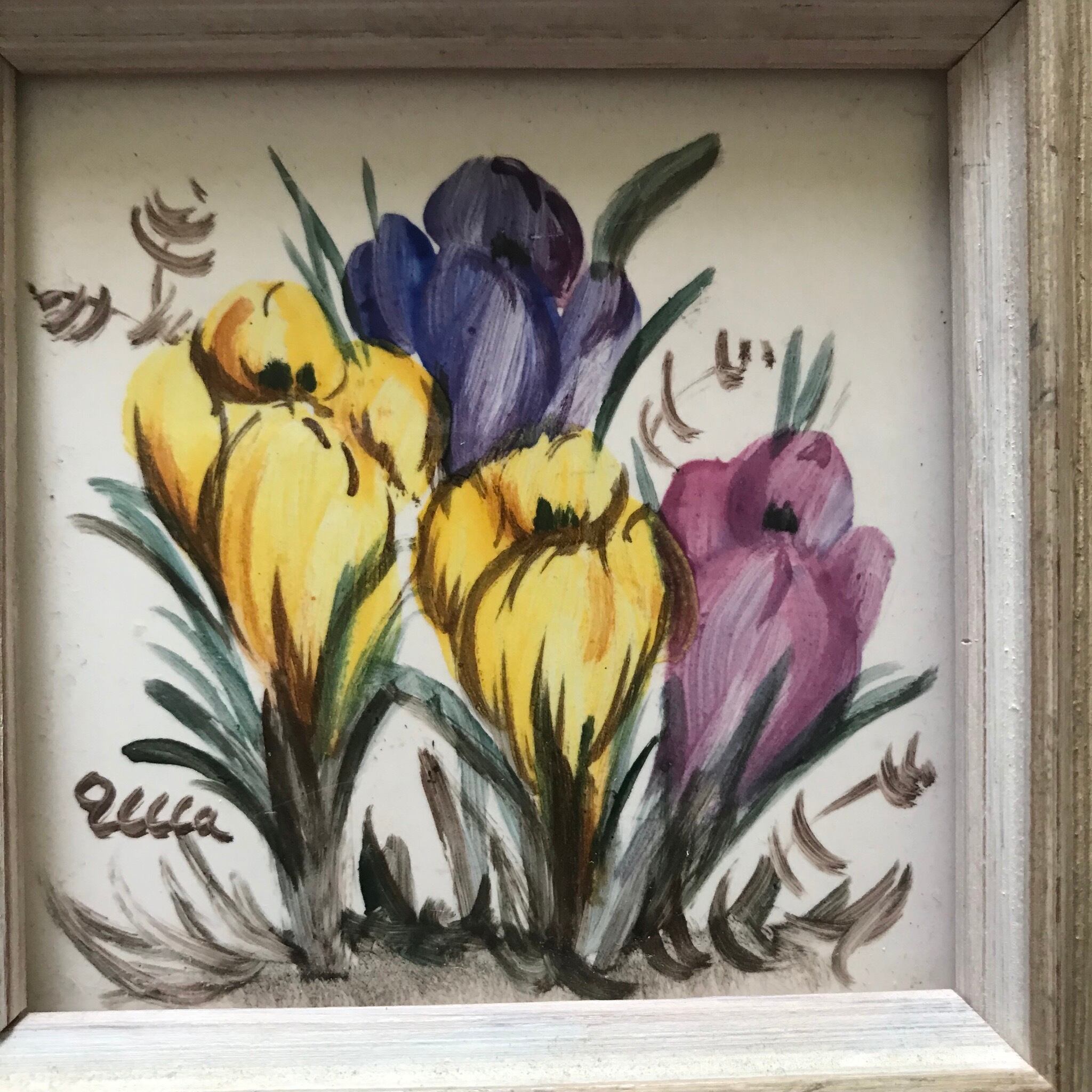スウェーデンで見つけた、手書きで花が描かれた額入りのタイルです。