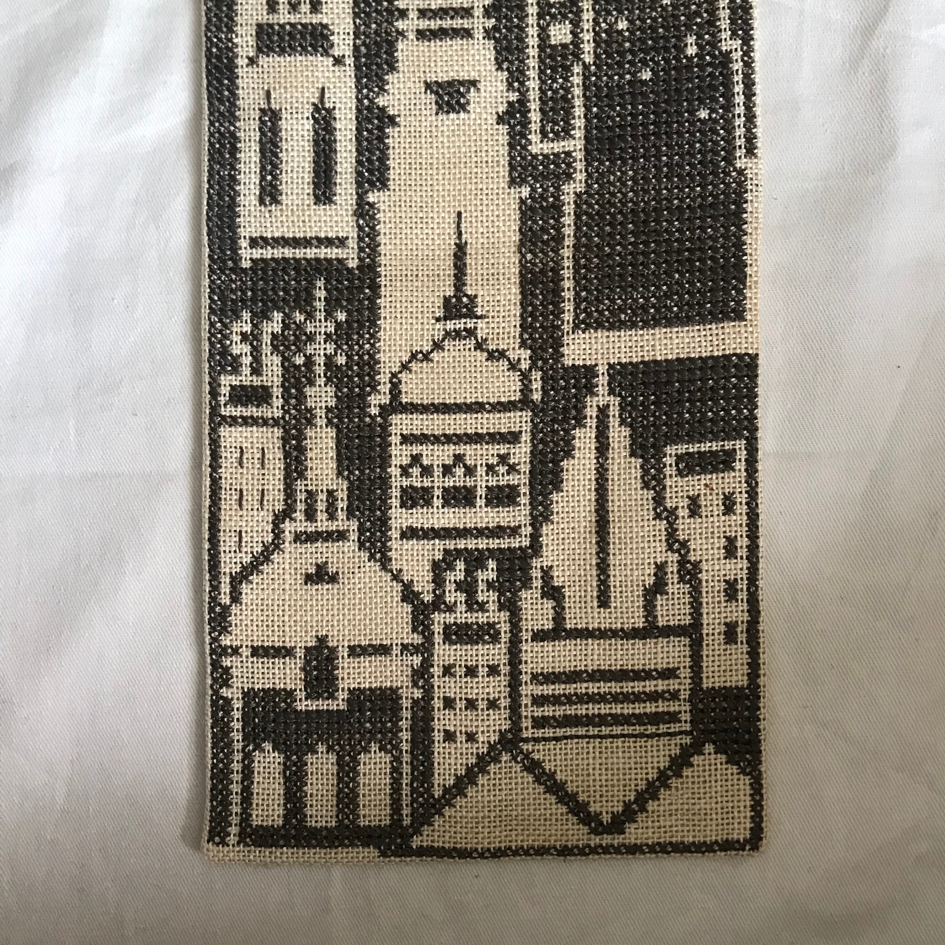 スウェーデンで見つけたクロスステッチで風景の模様が刺繍された壁掛けです。