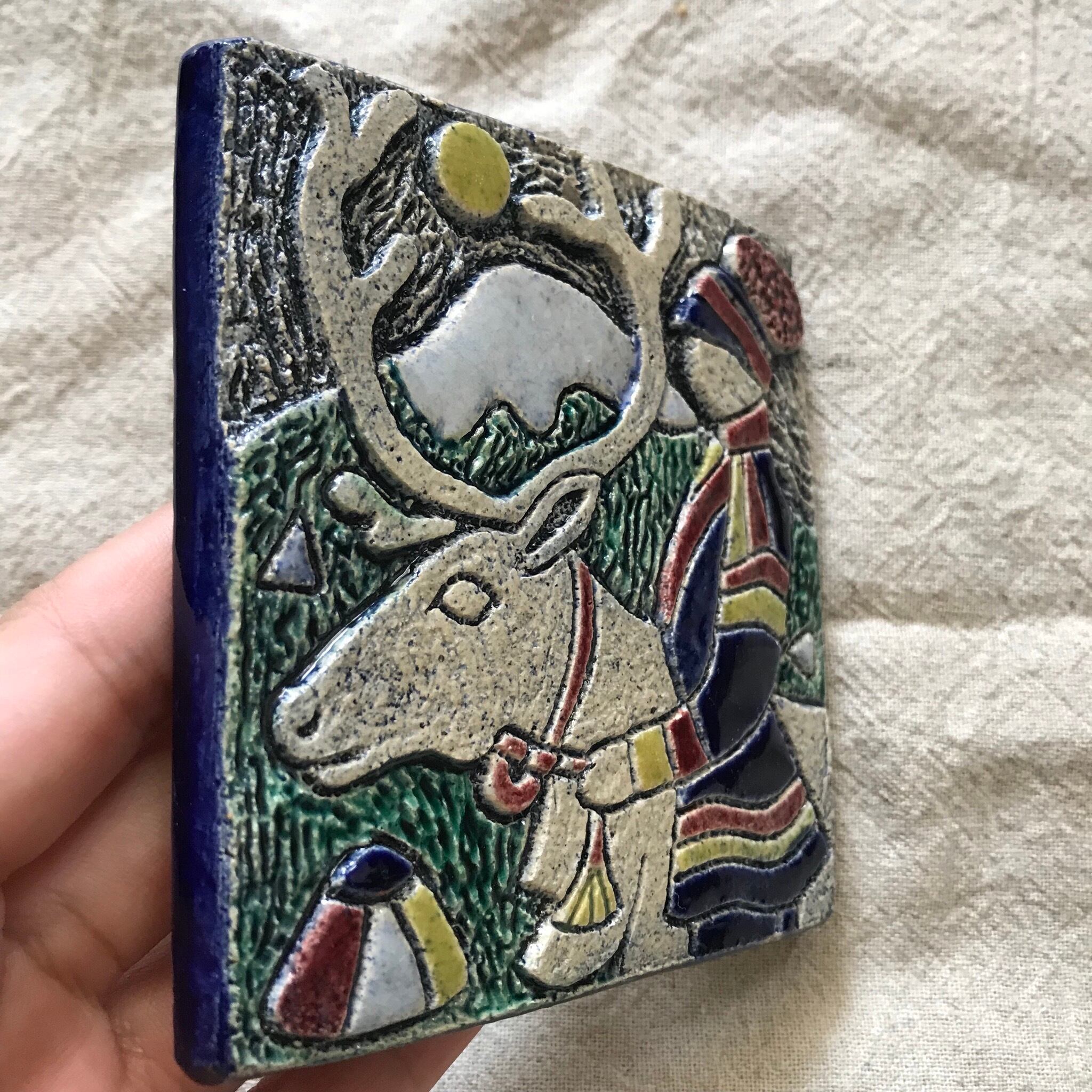 サーミの民族衣装をまとった人とトナカイが描かれています。