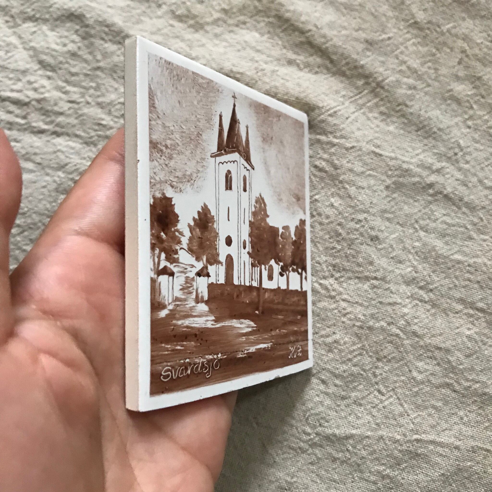 スウェーデンで見つけたセピア色で建物のある風景が描かれたタイル飾りです。