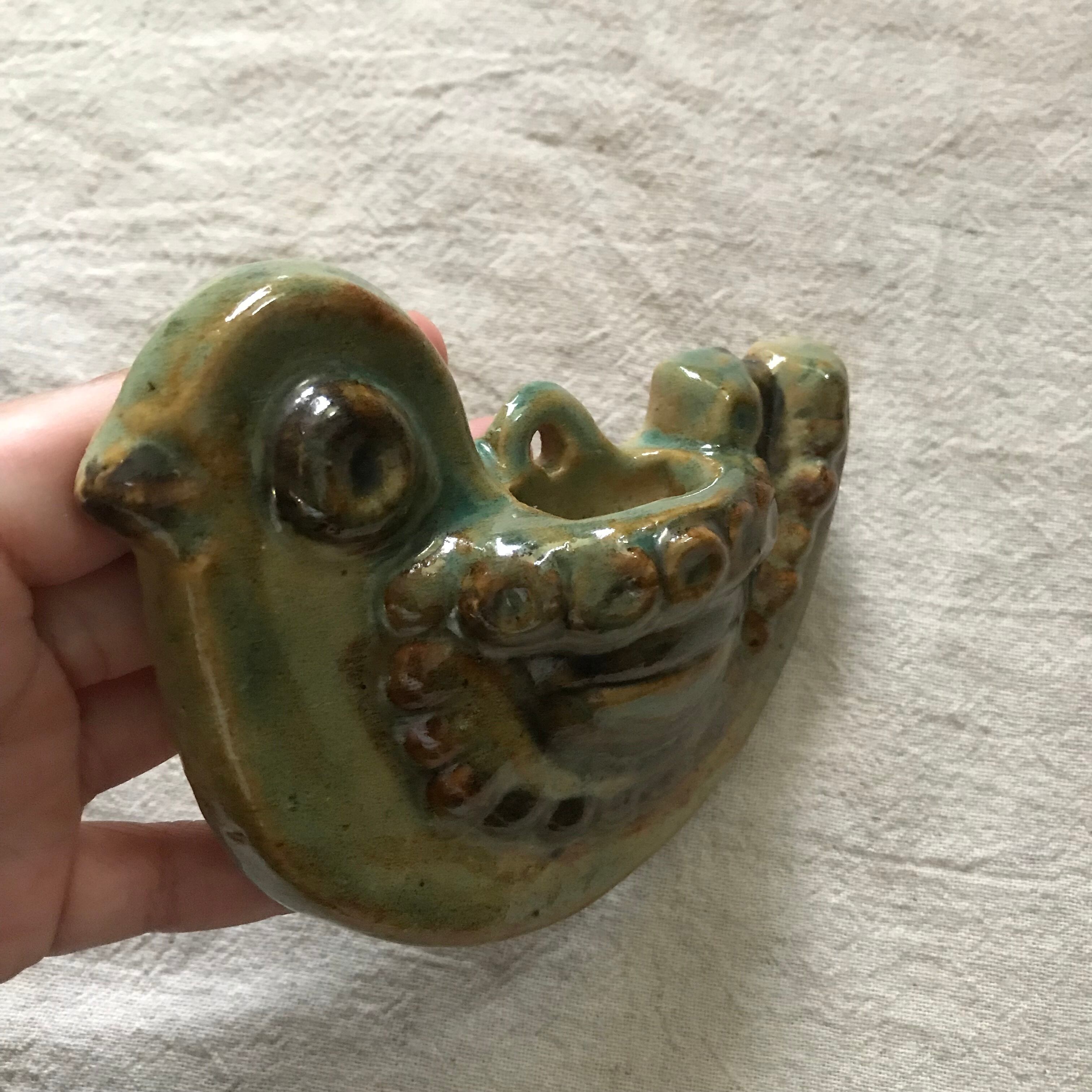 緑と茶色の混ざり合った絶妙な色の鳥はものを入れる小さなカゴのようなものを携えています。