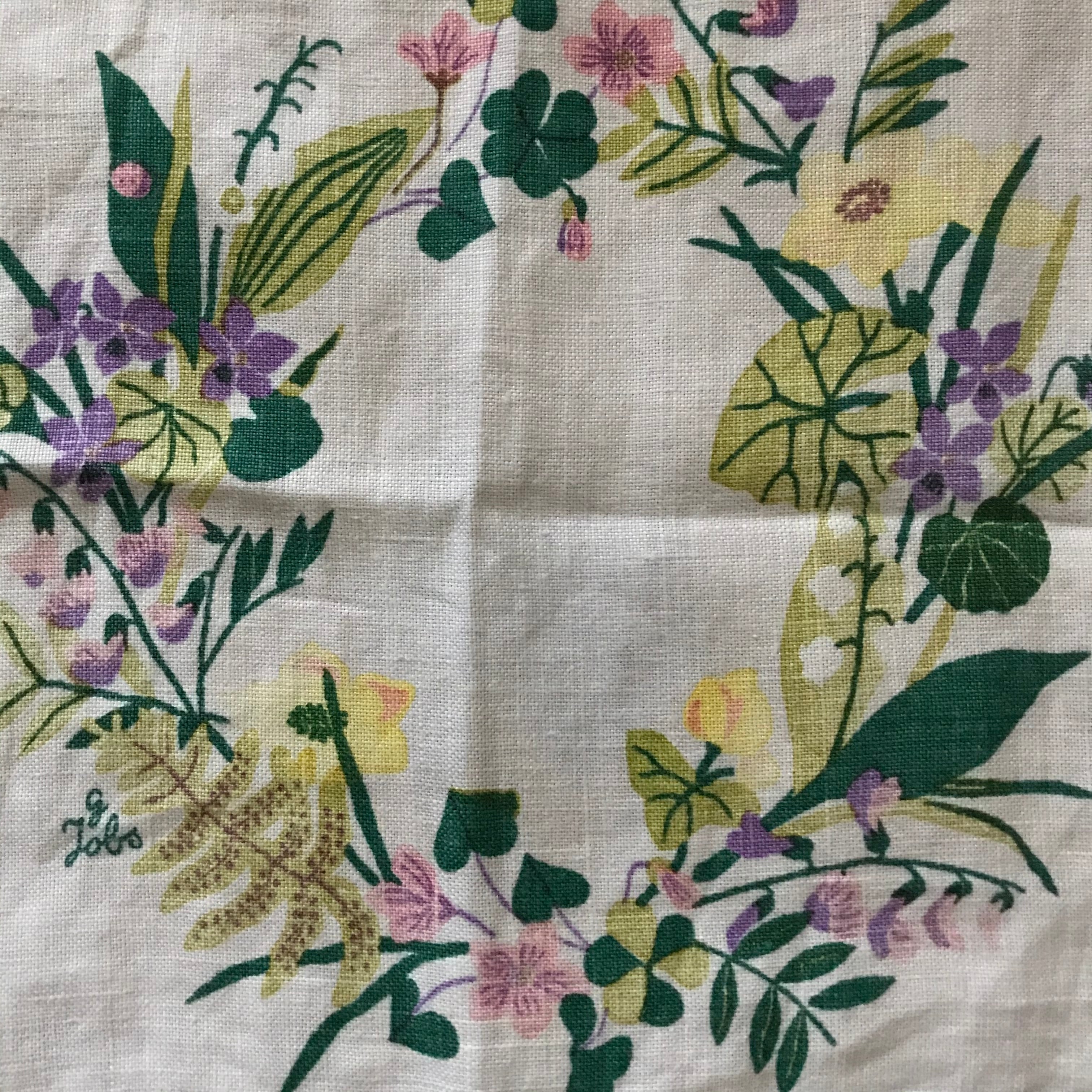 スウェーデンで見つけたグレーみがかった白にリース状の花たちがプリントされた布です。