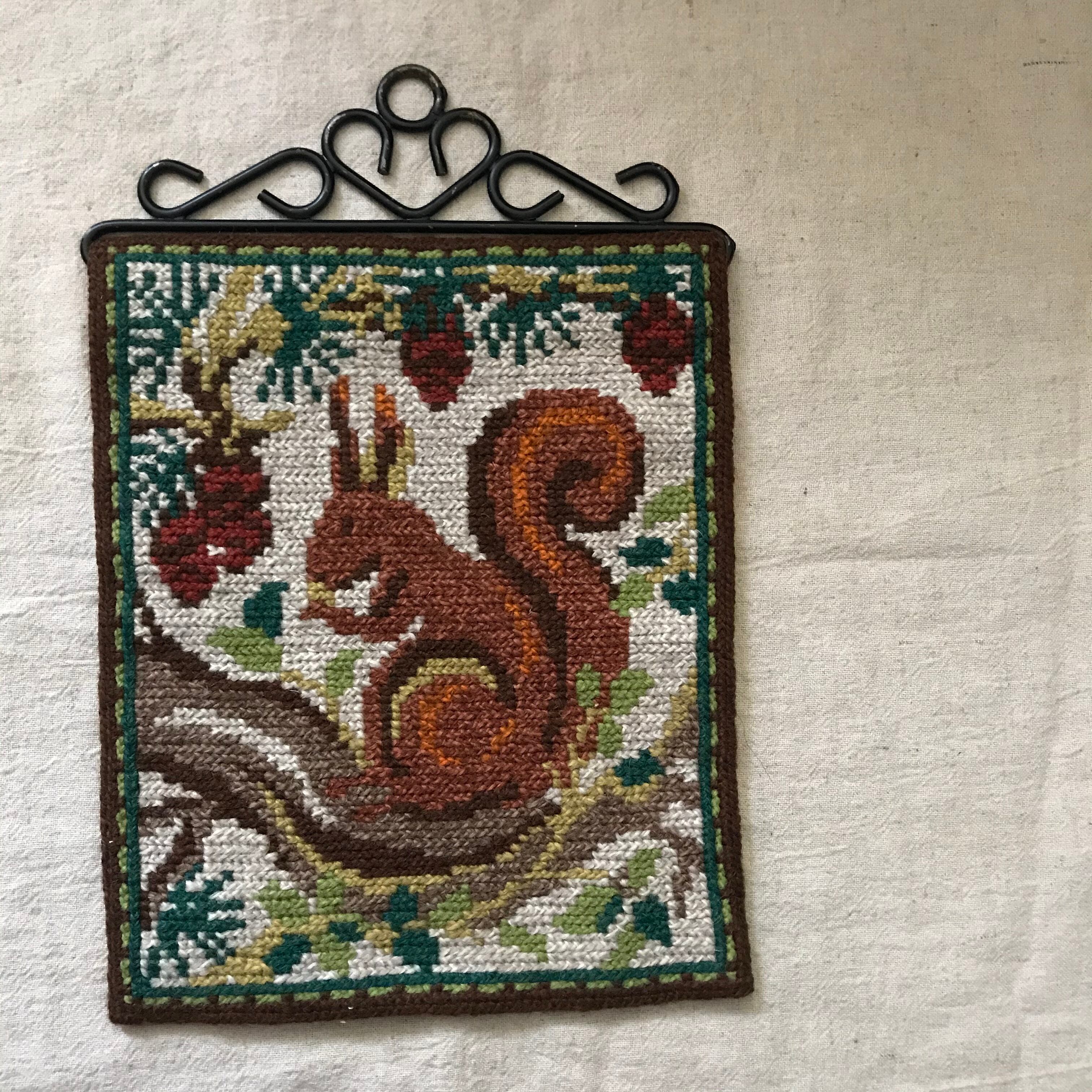 スウェーデンで見つけた毛糸で編んで作られたりすの壁掛けの絵です。