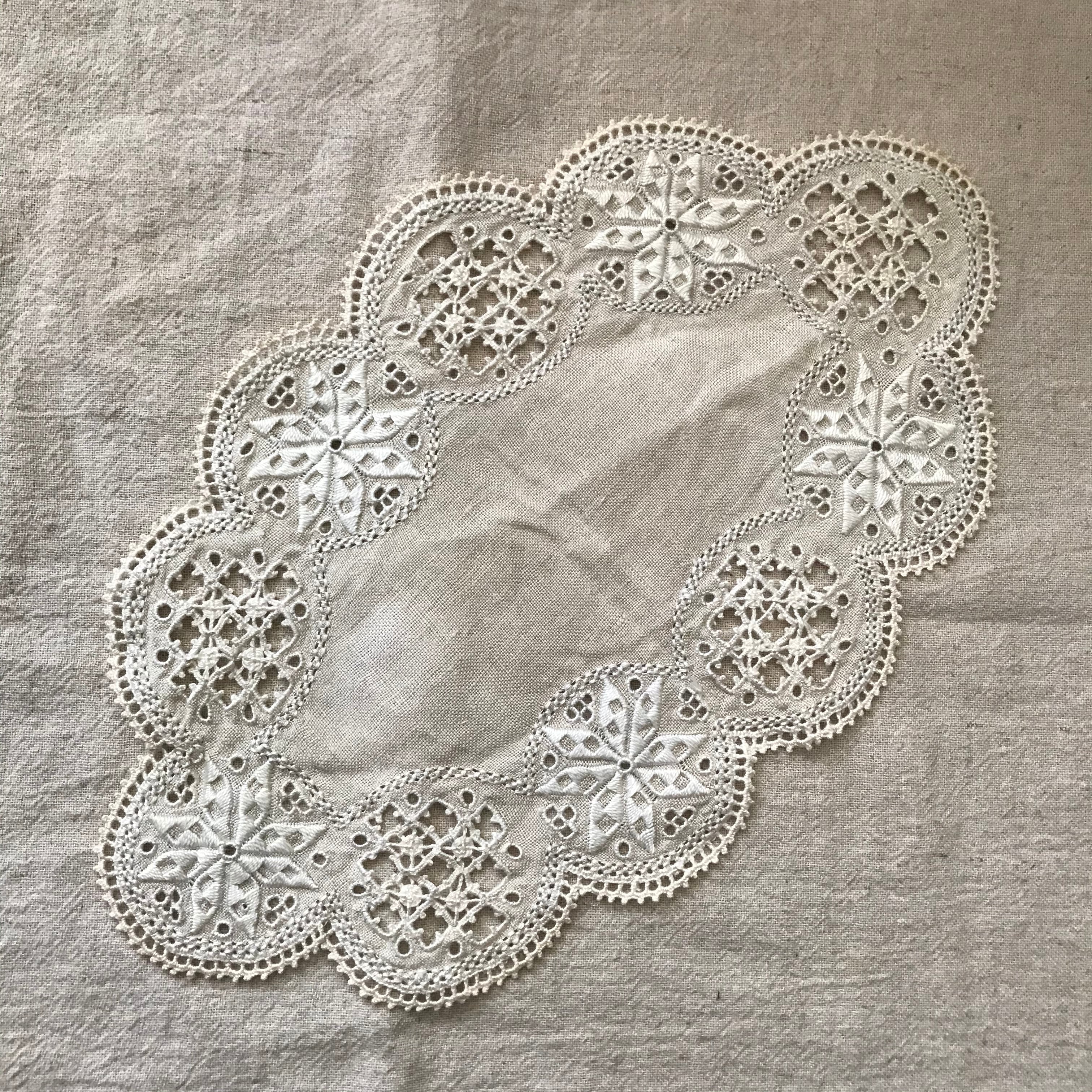 スウェーデンで見つけた、フワッとした雲のような形に透かしや刺繍がたくさん施された布です。