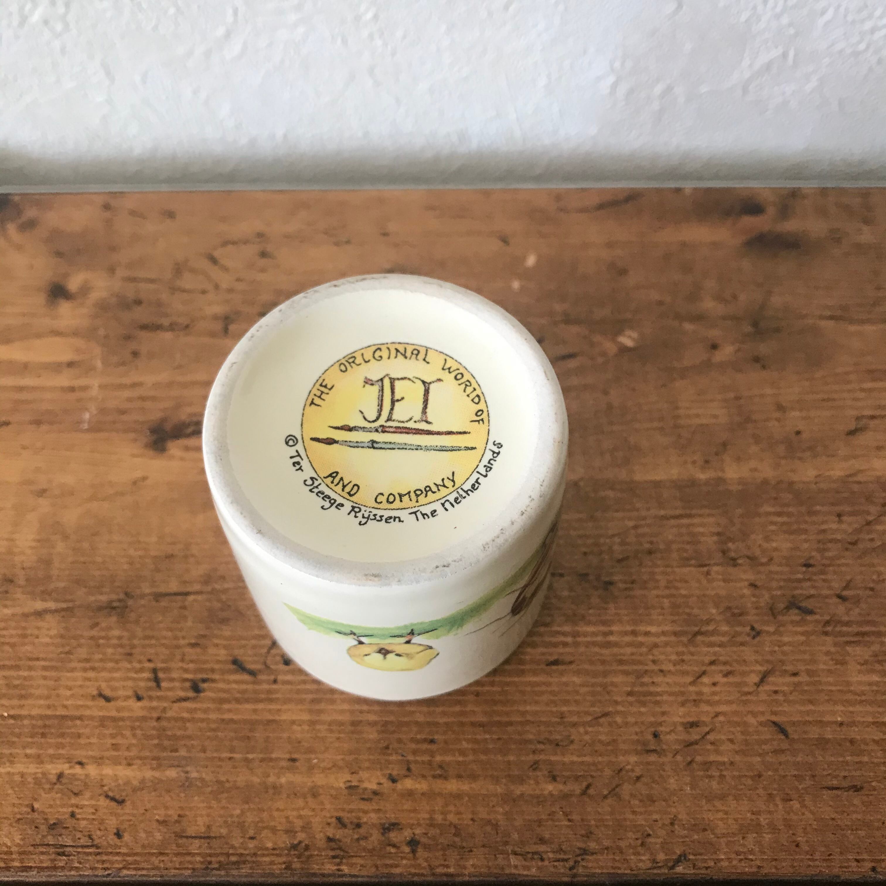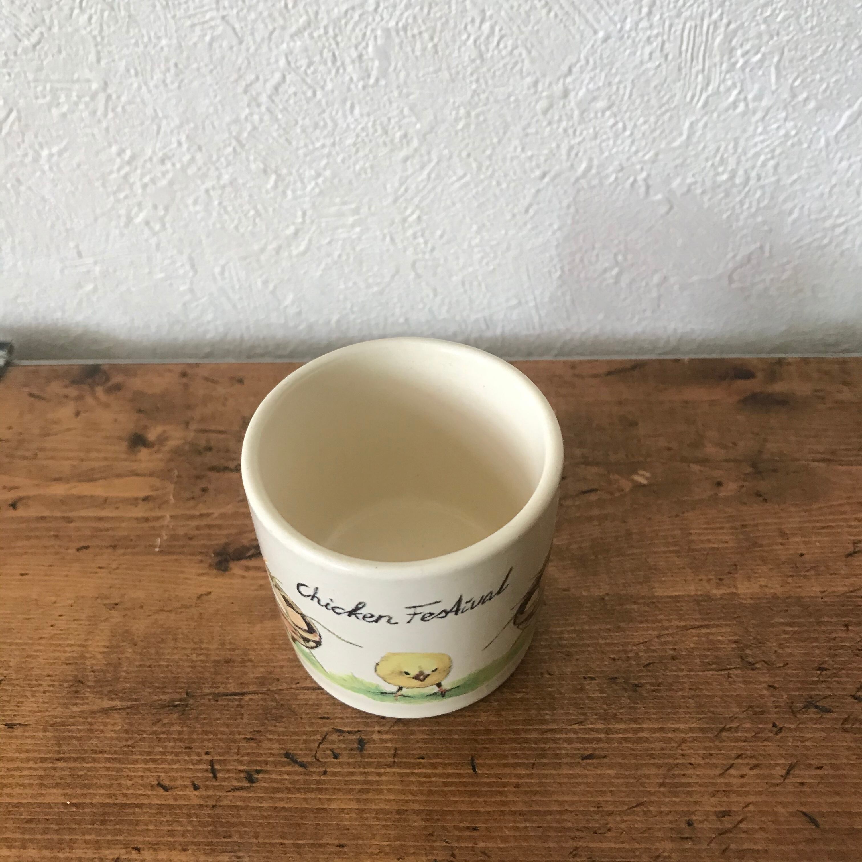 少しクリーム色がかった陶器製で側面1周ぐるっとヒヨコとたまごがプリントされています。
