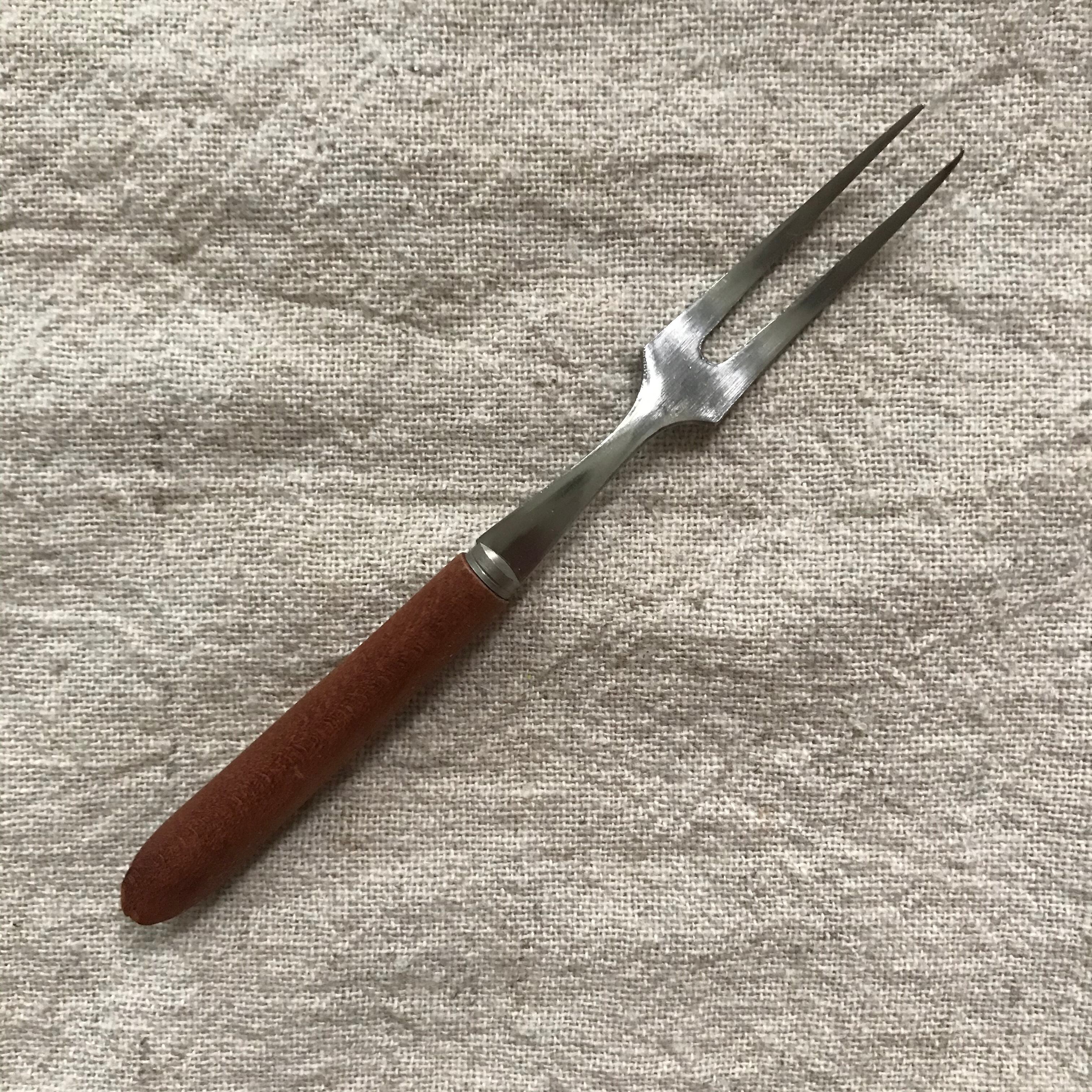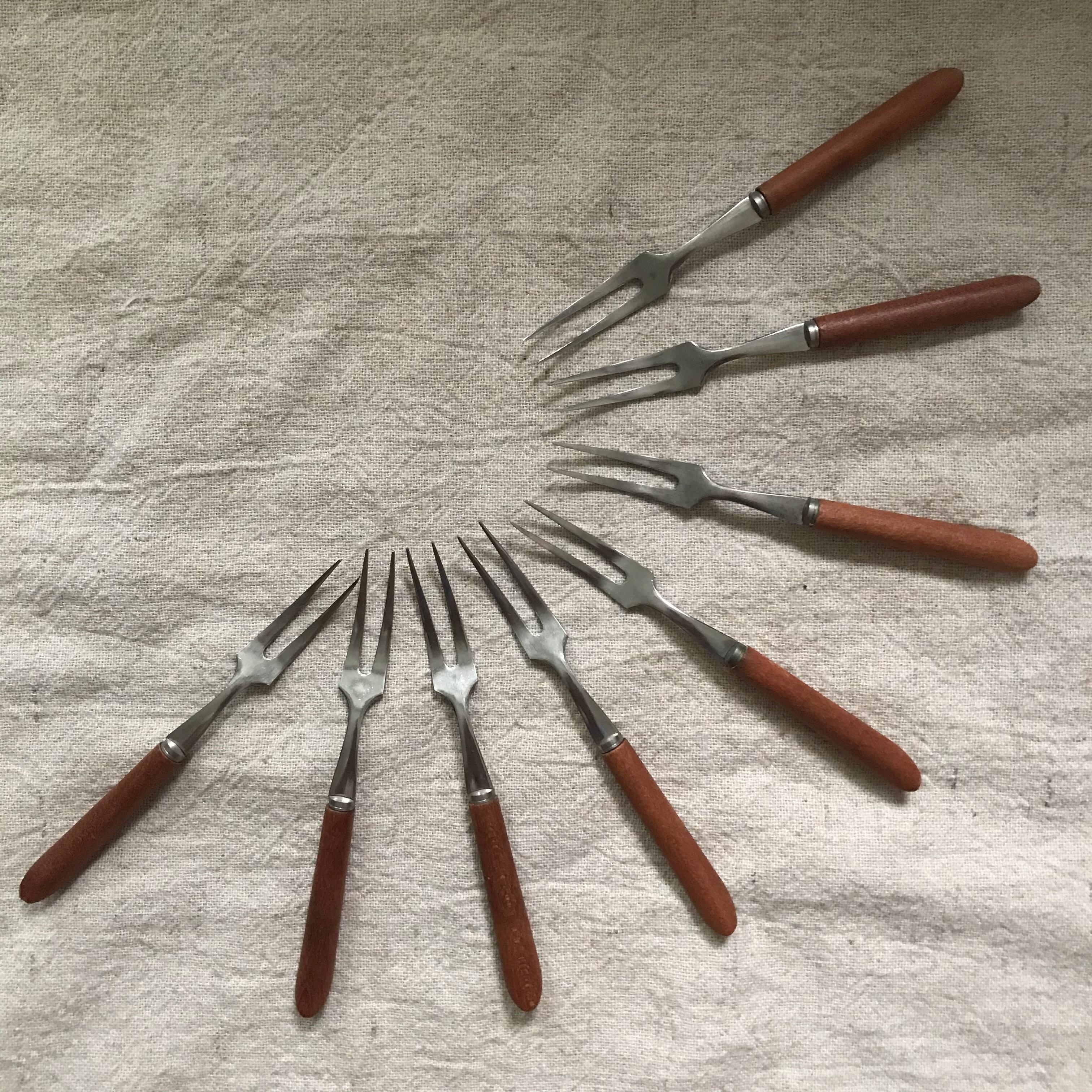木の柄に2またに分かれたフォークは、フルーツを食べるときに重宝します。