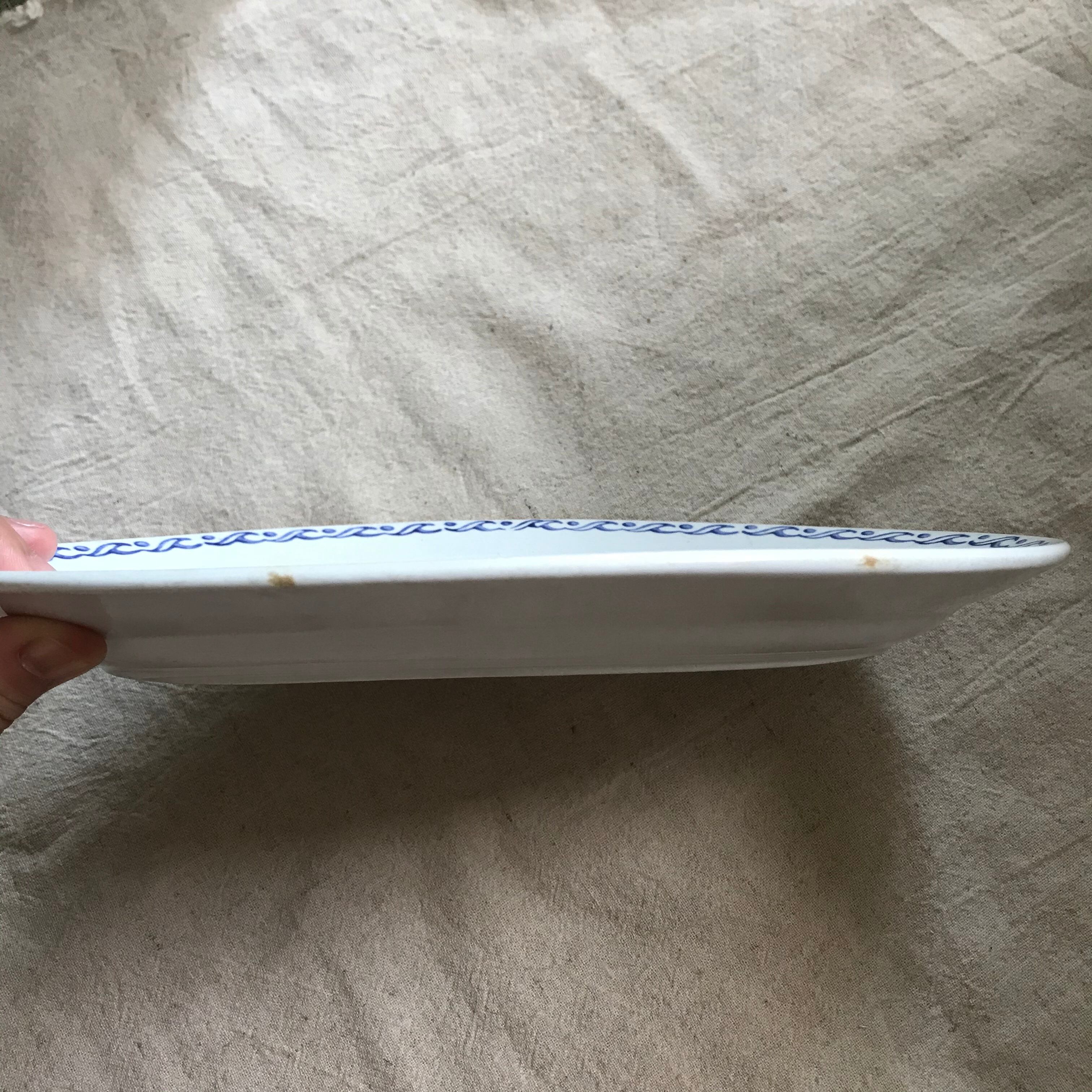 大きめのオーバルはふちに波のような模様と真ん中に花束ような絵が濃い青で描かれています。