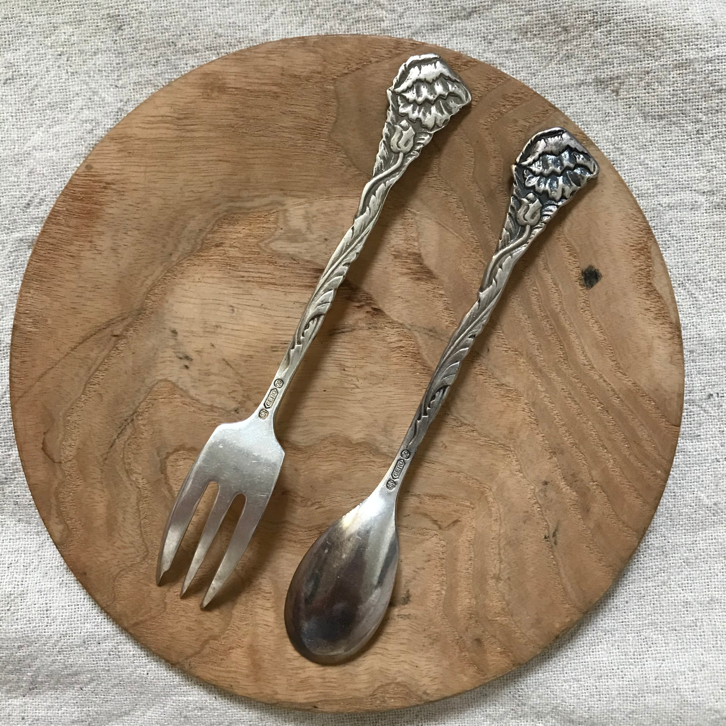 オランダの蚤の市で見つけた、シルバープレートのティースプーンとフォークのセットです。