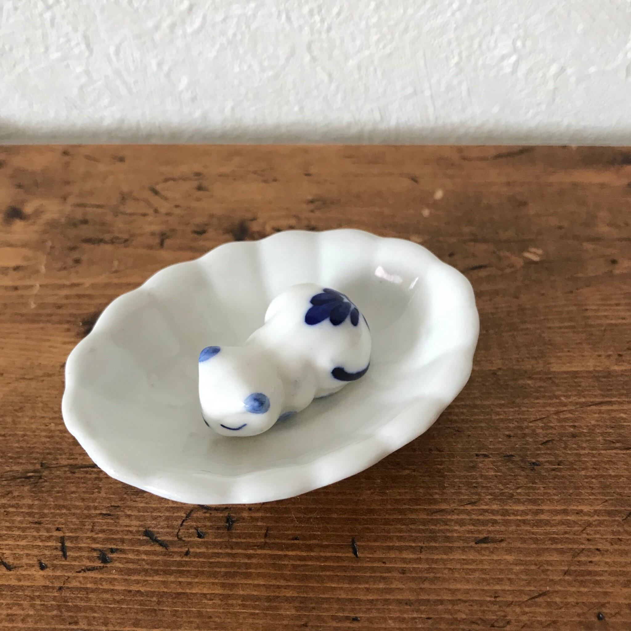 少し深さのある小皿がいい感じにネコを包み込んでいて、穏やかな顔でネコが安心して寝ているようです。