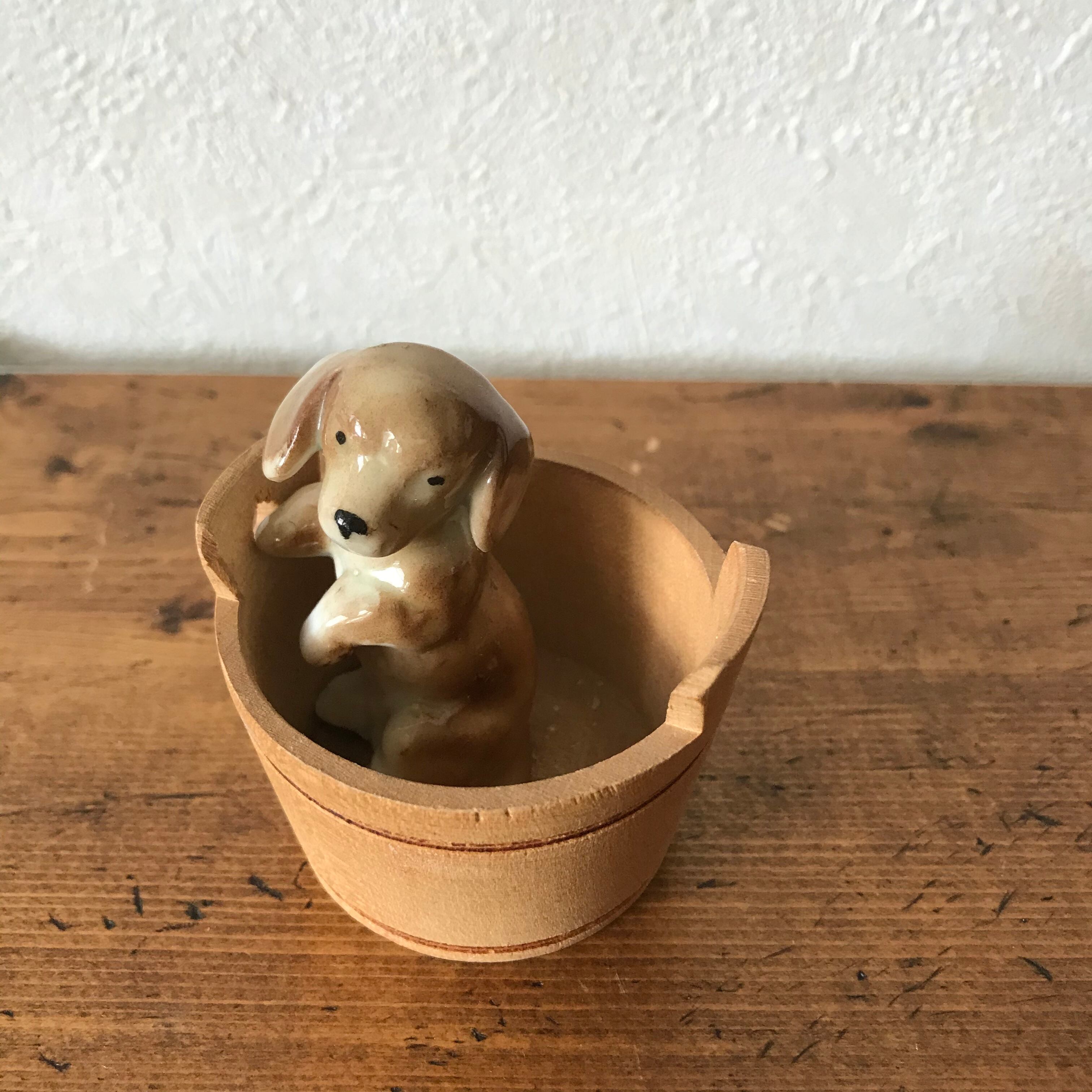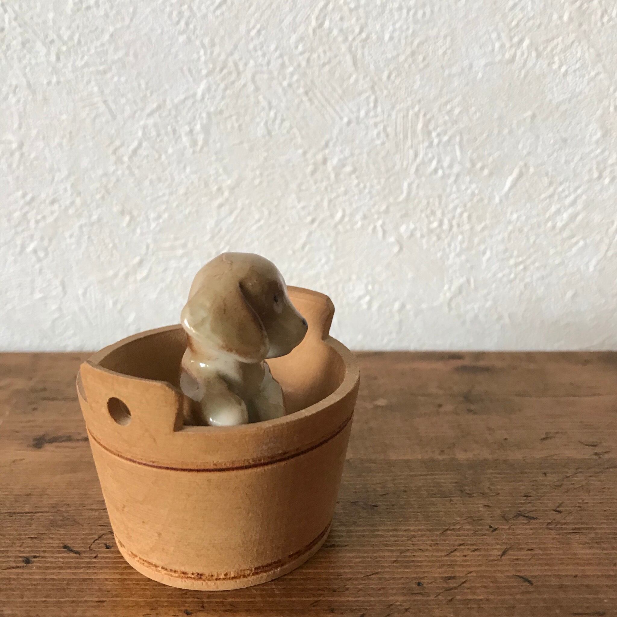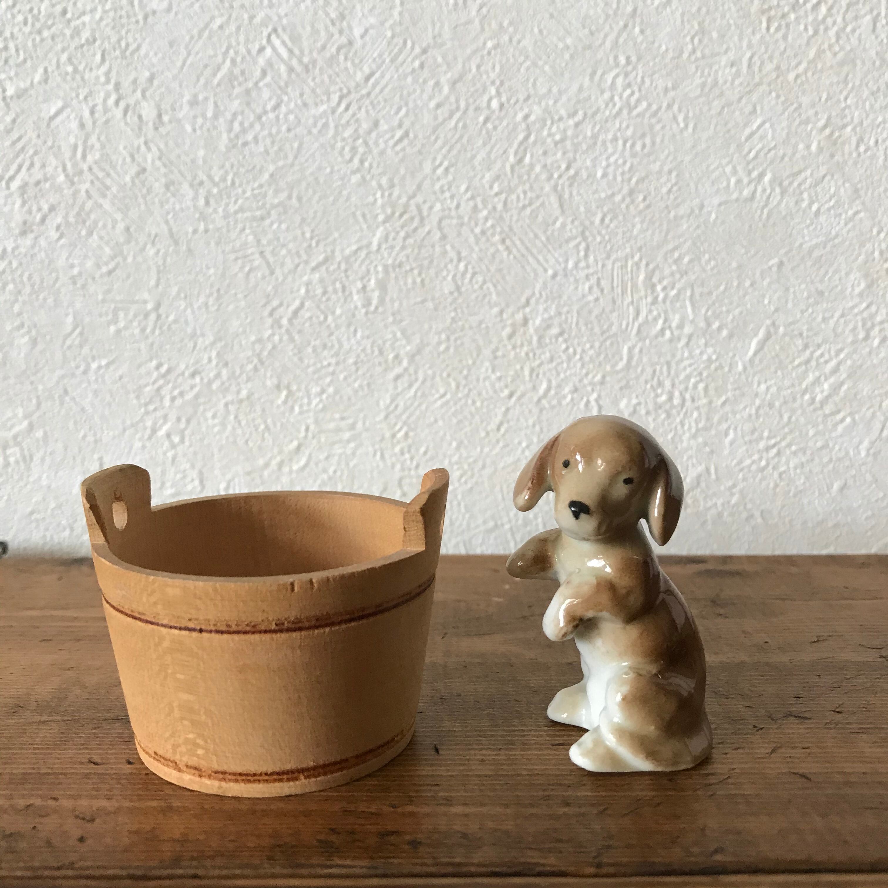 オランダで見つけた陶器の犬とスウェーデンで見つけた木の桶のセットです。